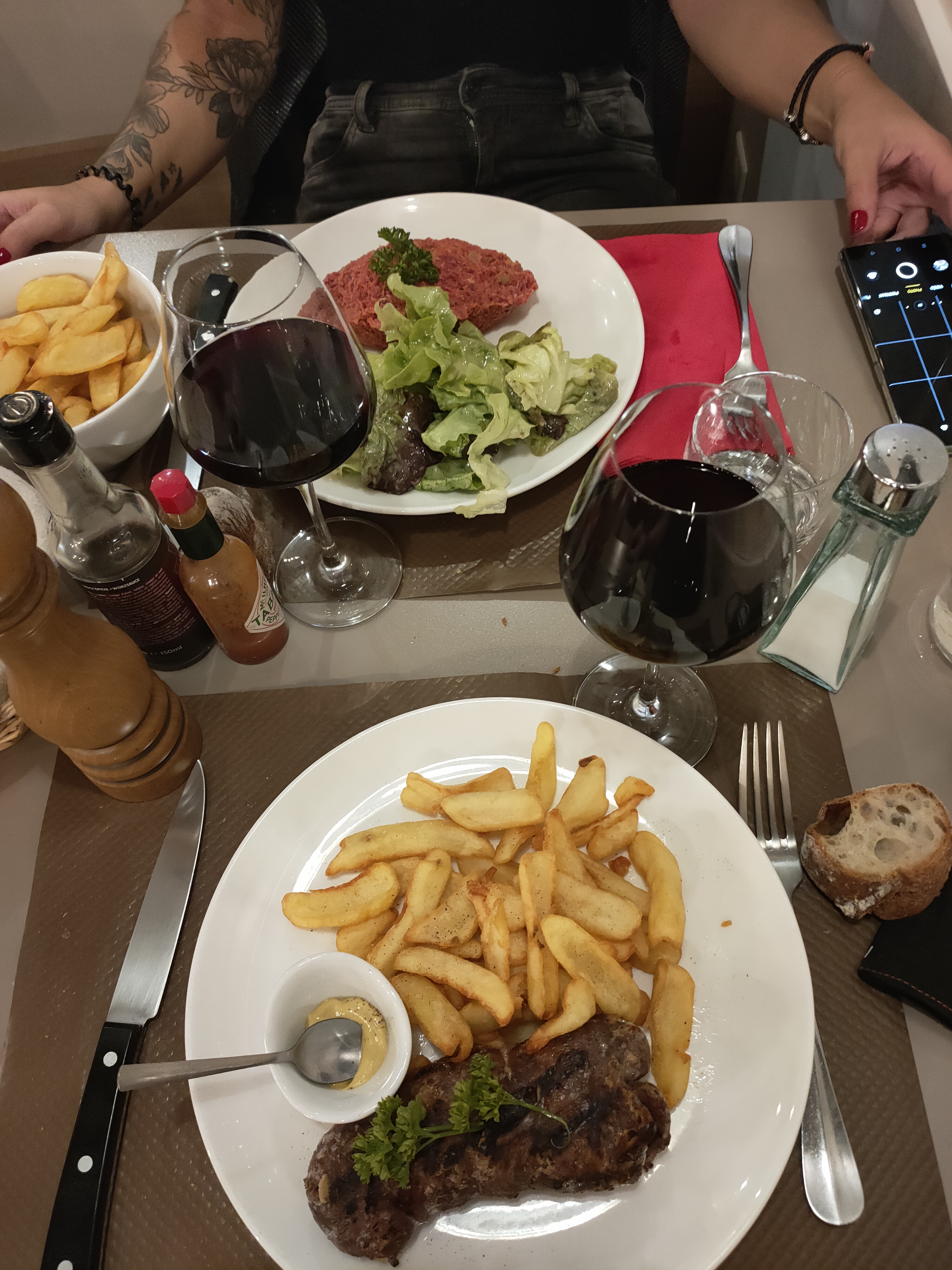 L'endroit était très fréquenté et animé pour un dimanche soir. Nous sommes arrivés vers 19 heures. 00 et avons eu la chance de pouvoir entrer et d'avoir une table, le reste du restaurant (intérieur et extérieur) était entièrement réservé. Le service était bon, la nourriture était bonne, mais pas exceptionnelle ni mémorable. J'ai commandé des escargots pour l'apéritif, mon copain a pris le steak tartare et moi la bavette. Nourriture savoureuse et c'est venu vite. La nourriture n’a pas fait impression, elle ne reviendrait probablement pas.