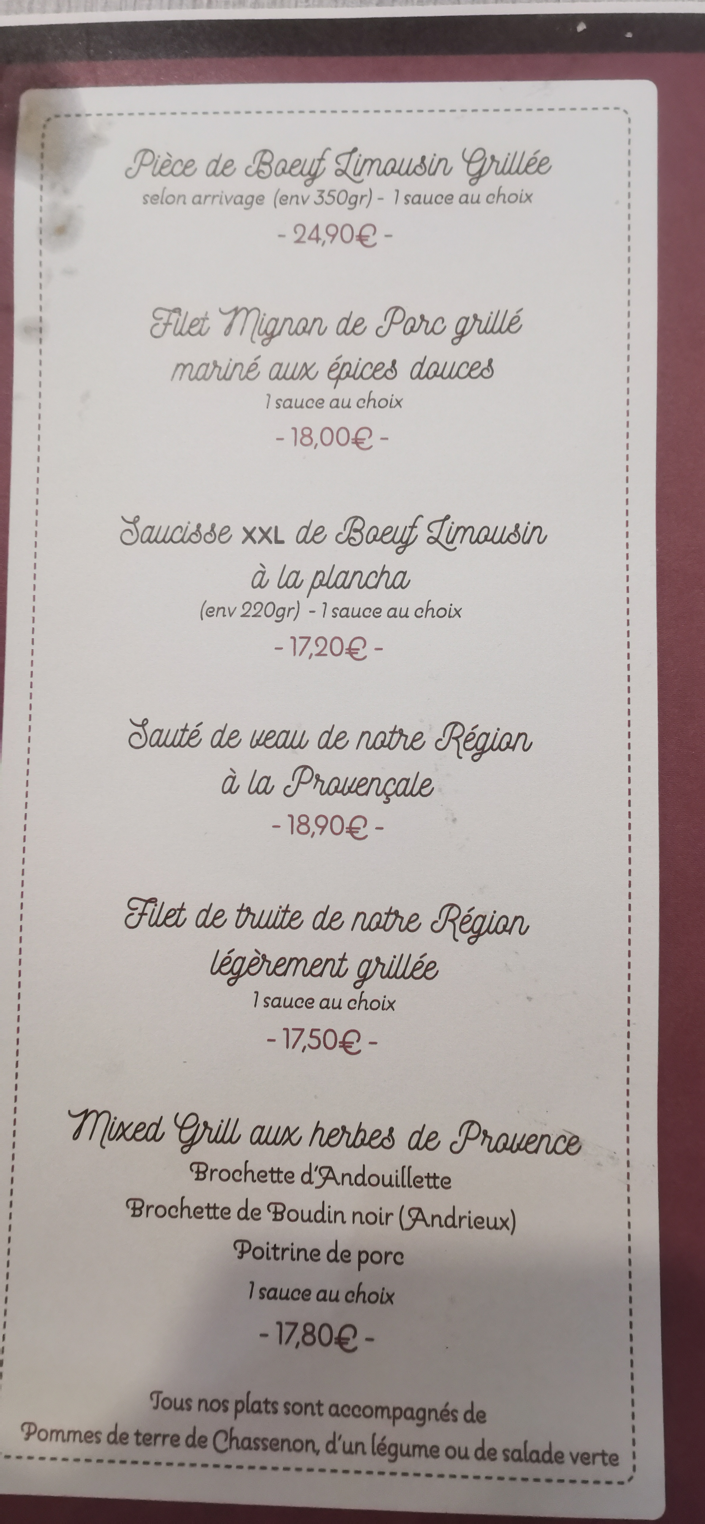 Accueil au top , plat original, légumes bio, viande 100/100 Limousine. Que du local.
