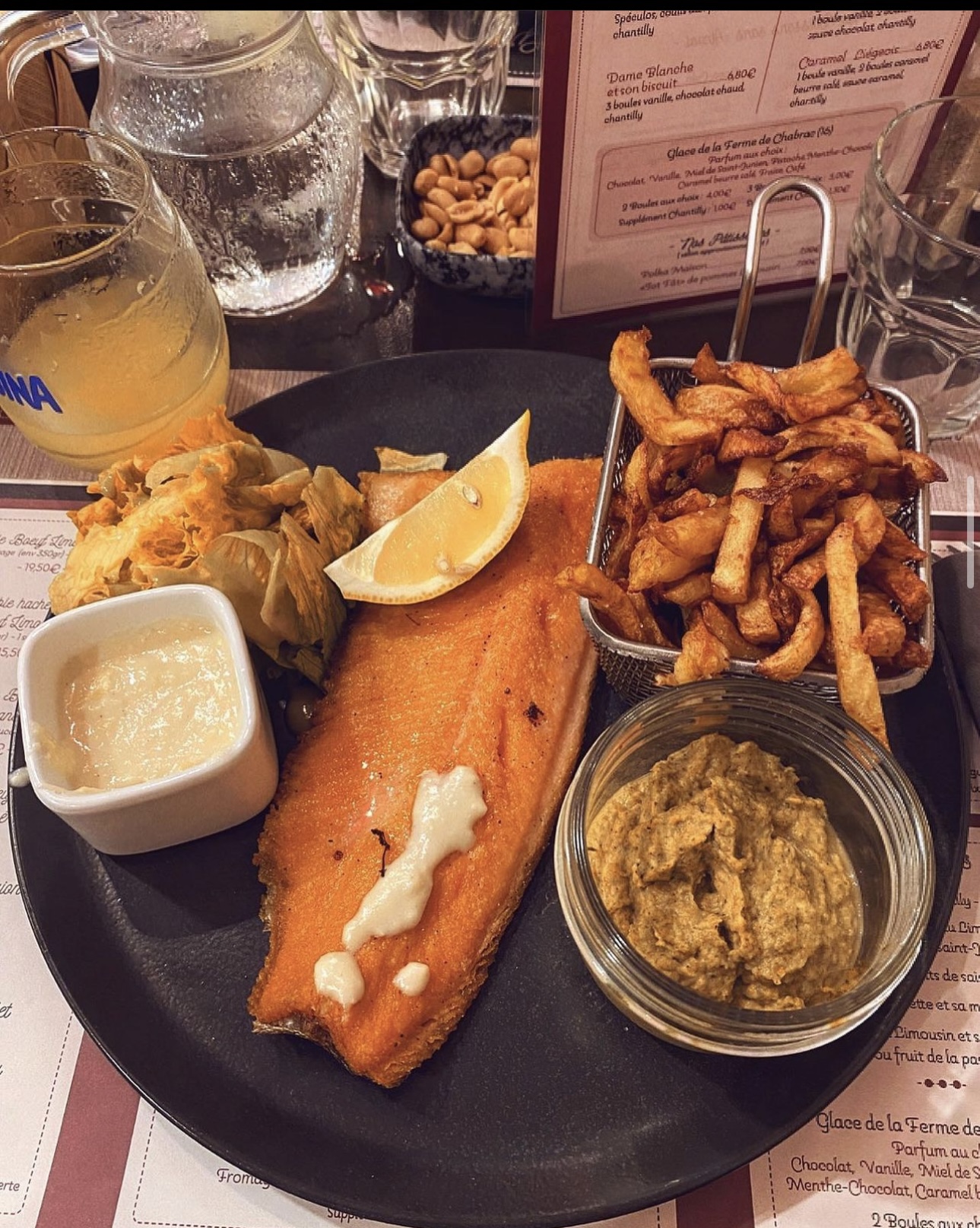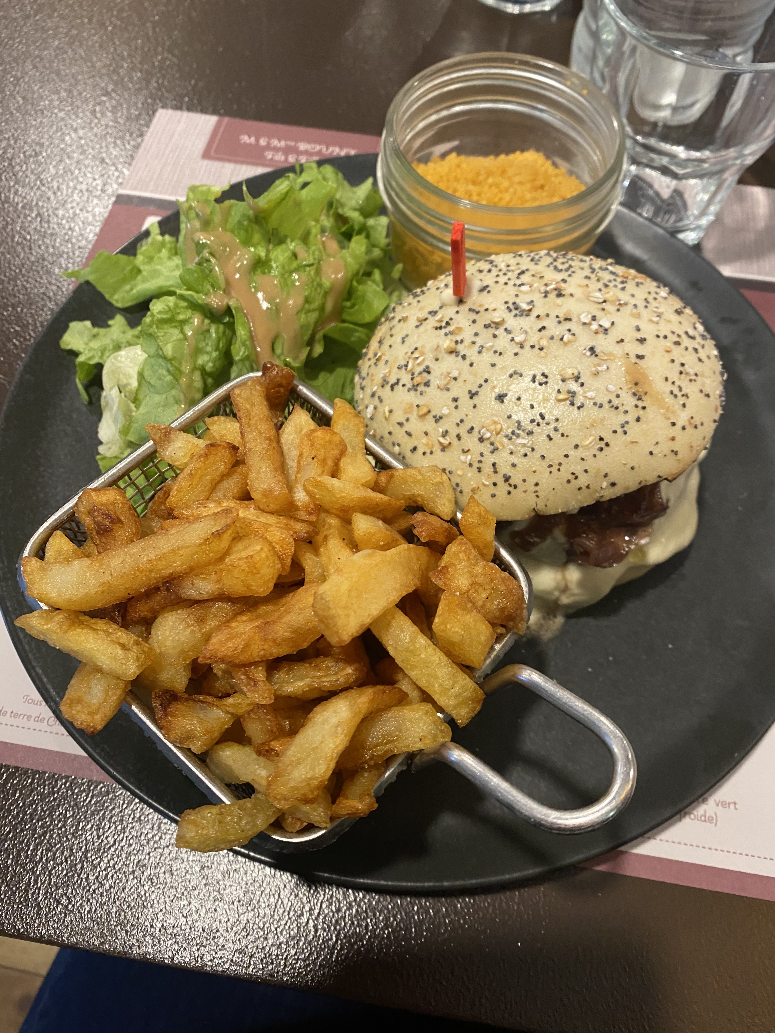 J'ai pris une salade de chèvre chaud ainsi qu'un verre de martini rouge. Très bon rapport qualité/prix, 15€ pour une salade assez copieuse avec une longue tartine de pain grillé, un gros morceau de chèvre chaud bien crémeux, de la tomme du Limousin, une salade avec une petite vinaigrette bien dosée, un panier de frites (pommes de terre de Chassenon) et une portion de ratatouille. L'assiette est généreuse, les produits sont très qualitatifs. Quant au service, il est très agréable. Les tables sont suffisamment espacées pour ne pas entendre les conversations des voisin.e.s ce qui est tout à fait appréciable. Petit conseil aux futur.e.s client.e.s: réservez vos tables en week-end comme en semaine, l'établissement est pas mal fréquenté et malgré l'espace, les tables se remplissent vite. + toilettes propres, vu sur les cuisines et espace plonge séparé de la cuisine. Très bien.