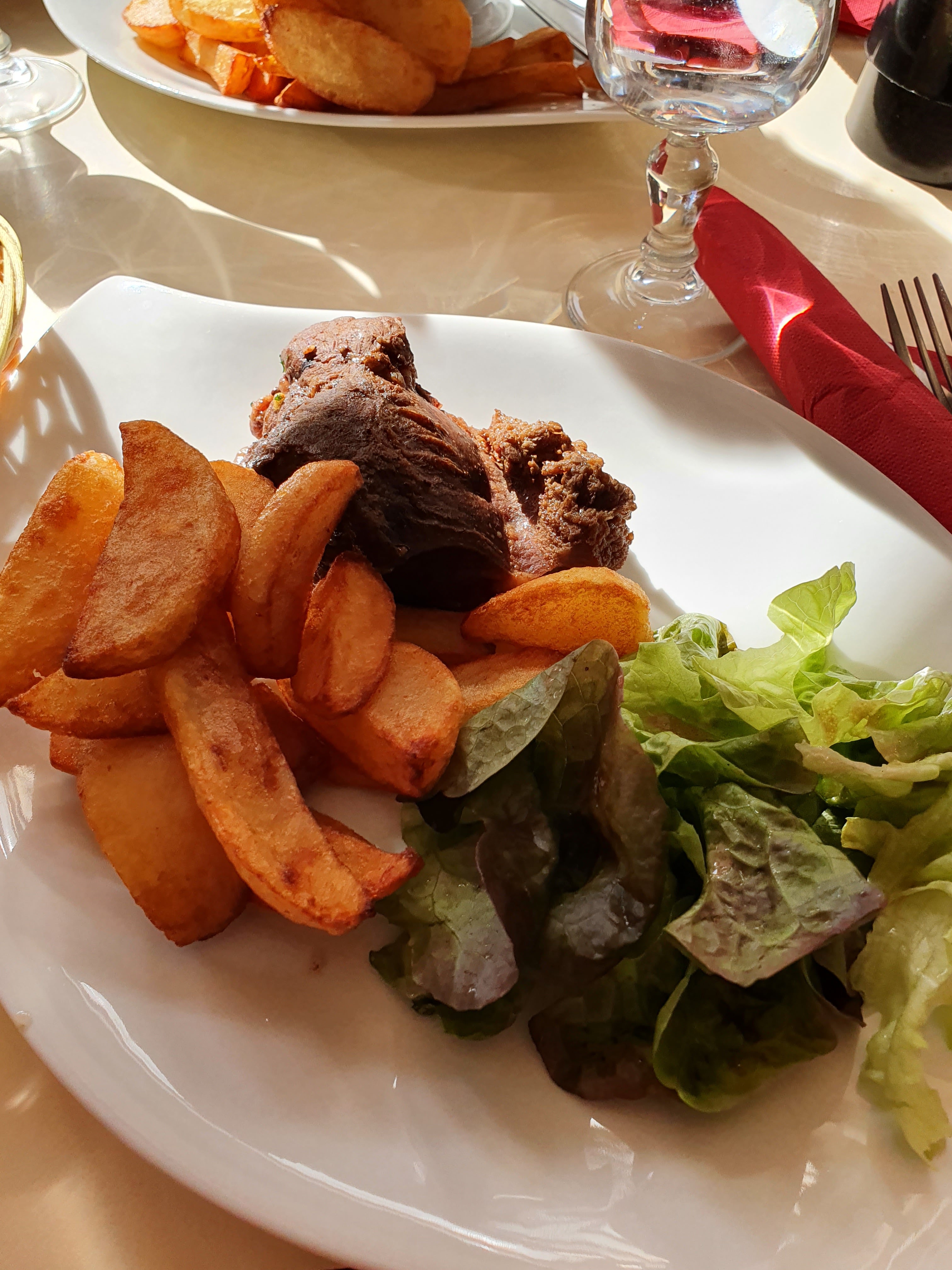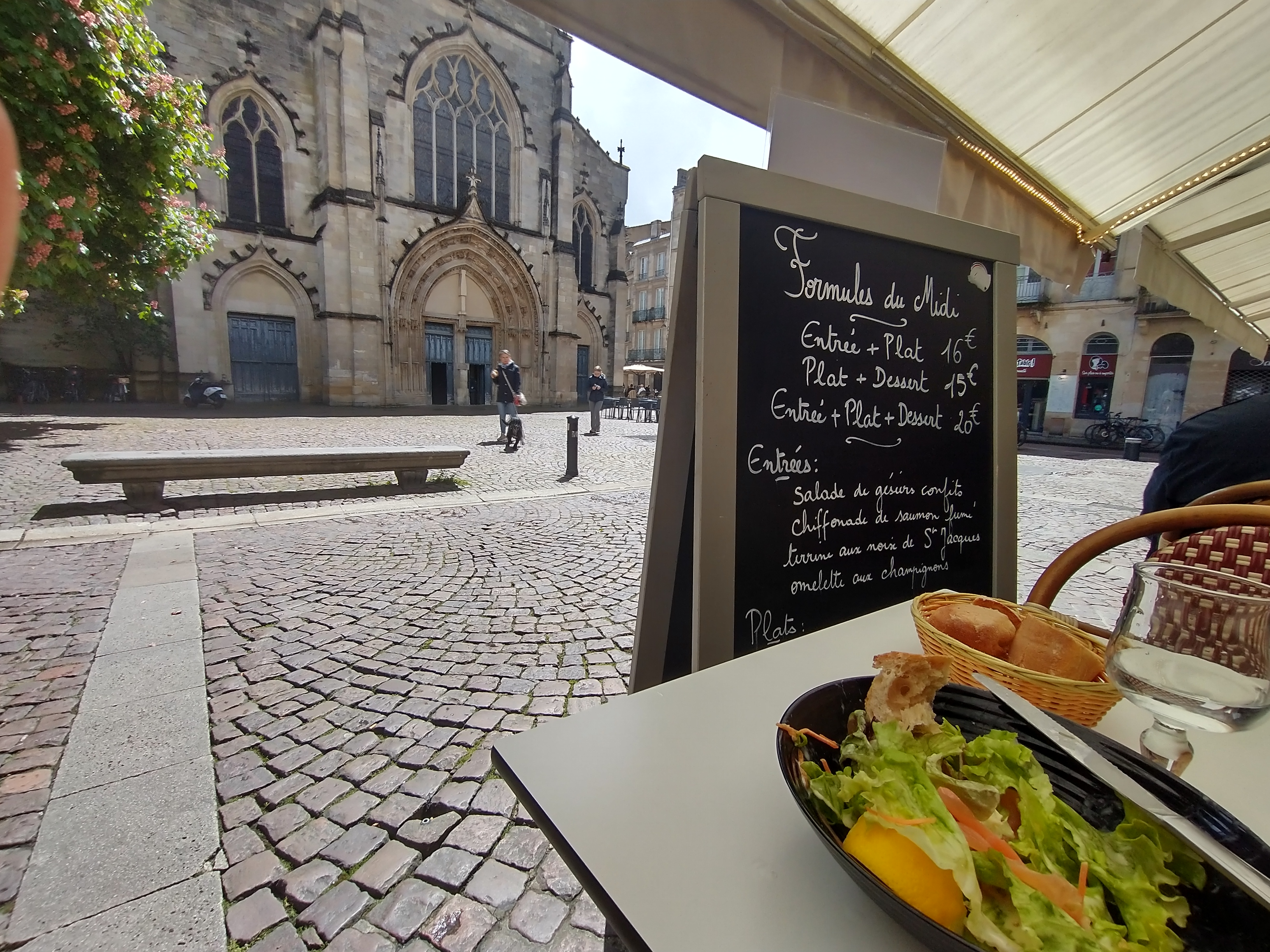 Le menu est simple, la nourriture est basique, les prix sont abordables. J'avais une salade de saumon fumé accompagnée d'un énorme tas de saumon, un peu noyé dans la vinaigrette mais c'était bon. Puis bavette avec frites et encore de la salade. Le steak était un peu moelleux, mais bien. Un bon endroit pour un déjeuner abordable avec un bon verre de vin sur une jolie petite place. Service sympathique et efficace à une heure de déjeuner chargée, et ils ont très bien toléré mon mauvais français !