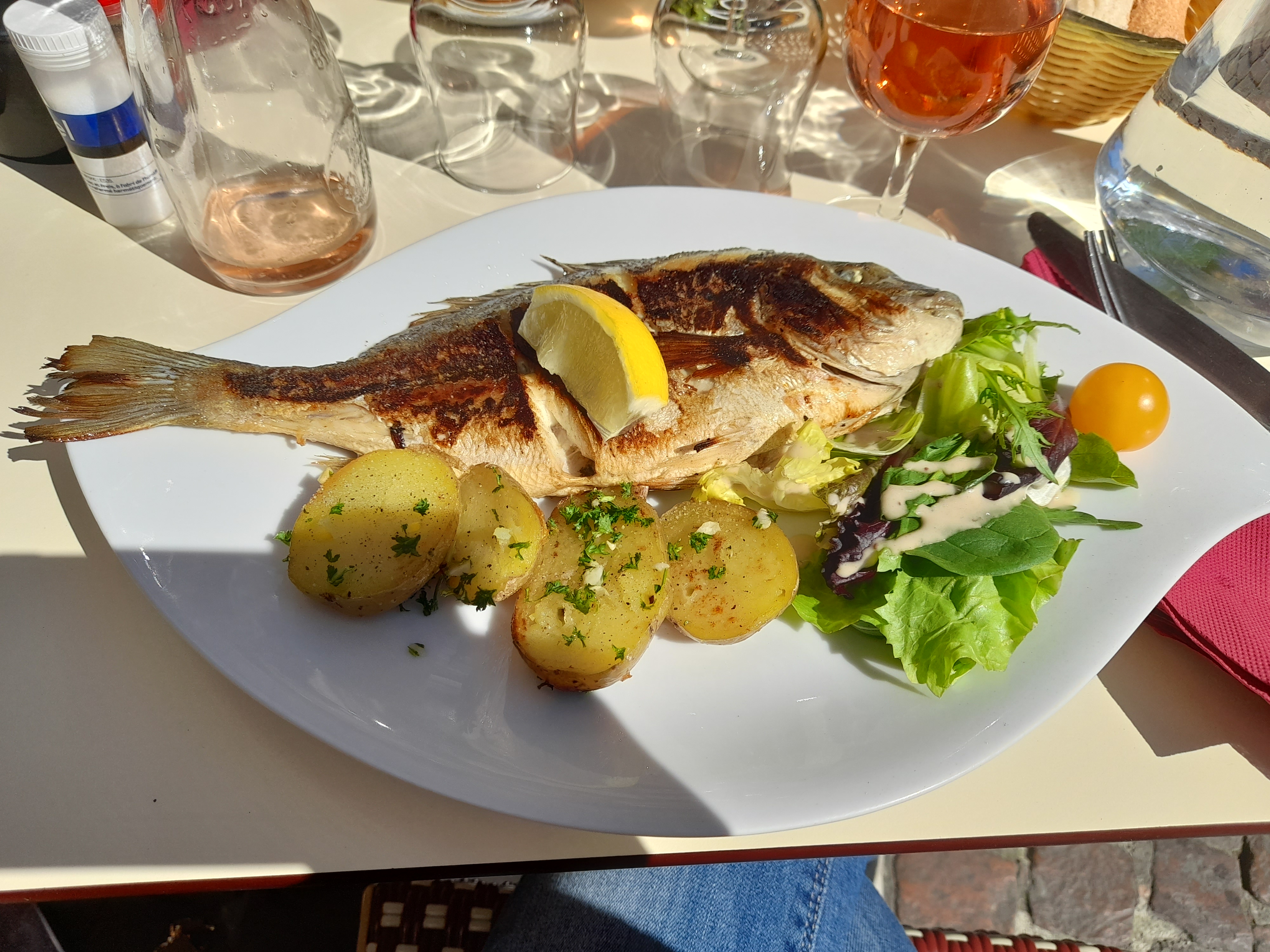 Faisons un menu le dimanche à 19 eu, vin à part : entrée, plat et après Les salades sont très bonnes, les poissons grillés très bons et les desserts aussi (pichet) très bon 6 eu. litre Super endroit et service 30/10/22