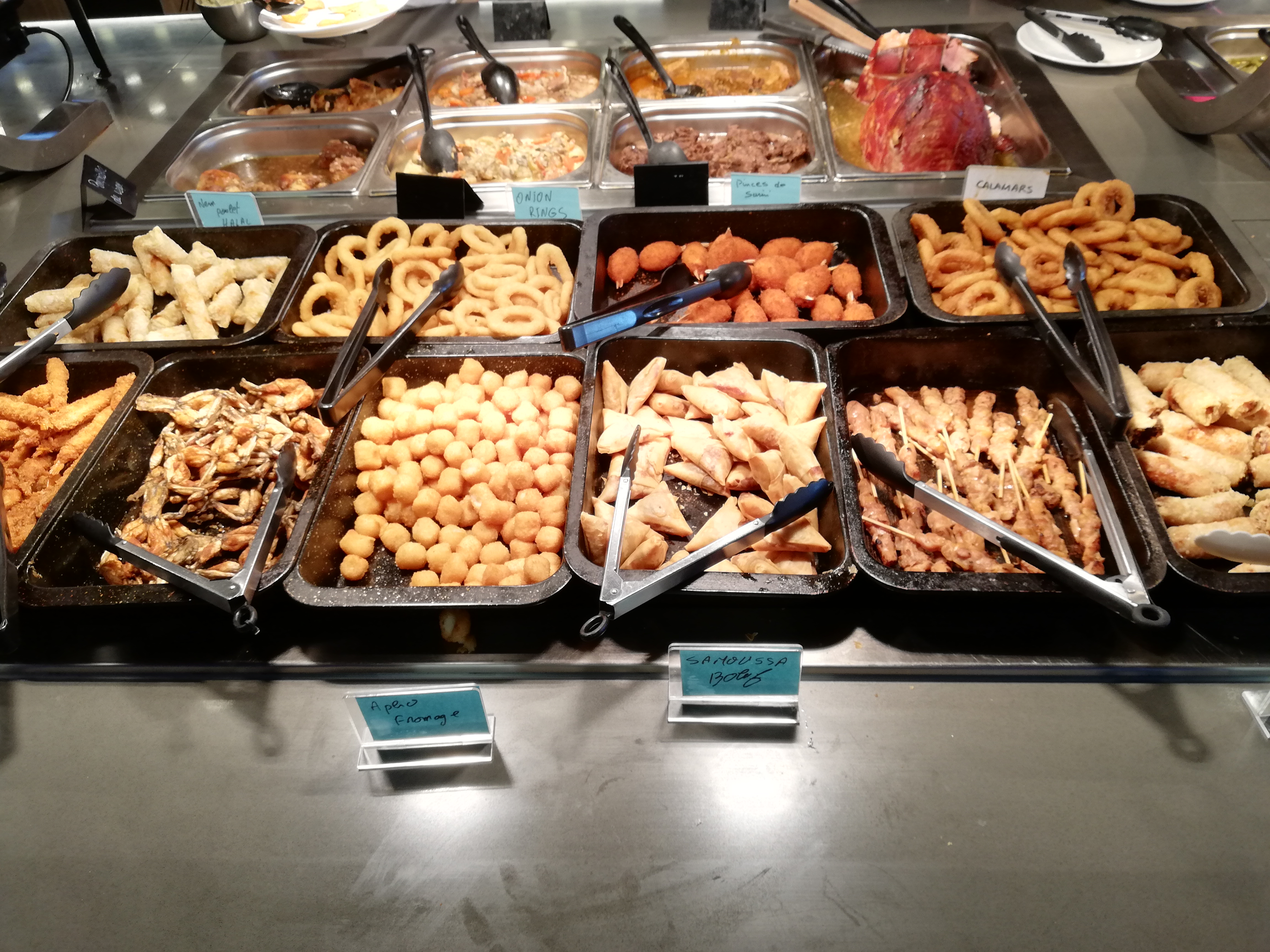 De l'entrée au desserts en passant par les plats chaud, tout est bon. Divers choix d'entrée ( charcuteries, fruits de mer et salades) . Divers choix de plats chauds ( nem, viandes et les légumes : haricots vert, riz, nouilles, ratatouille.) Divers choix de desserts ( gâteaux, fruits au sirop, et sans oublier les glaces.) À et j'allais oublier le plateau de fromages, qui lui aussi est très variés.