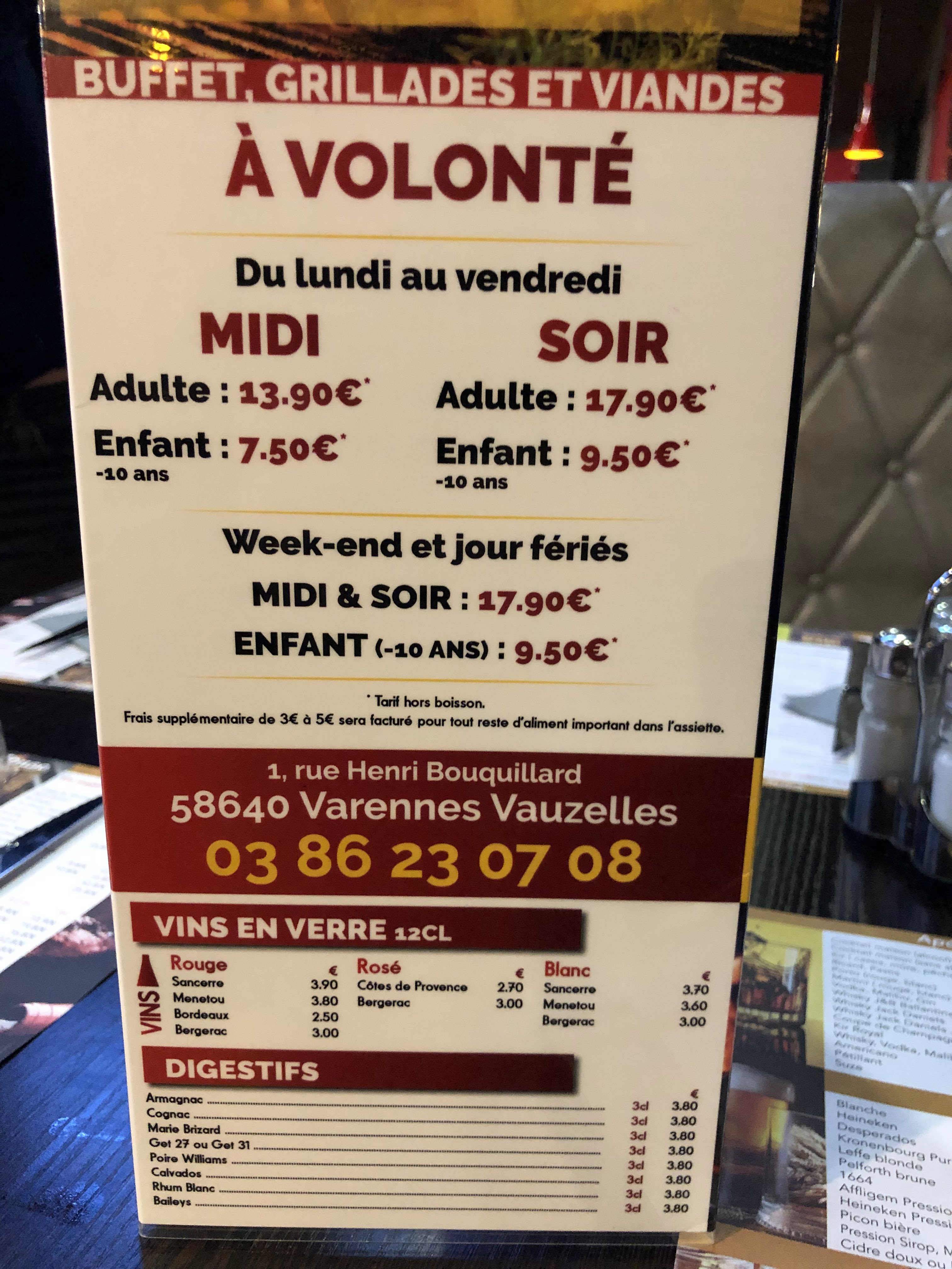 Pour 13,90 le midi en semaine, buffet à volonté très varié. Bonne viande et pour quelques euros de plus soir et week-end, buffet encore plus varié. On y mange très bien. Je vous le conseille...
