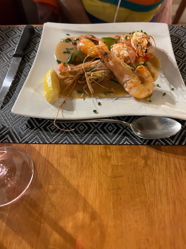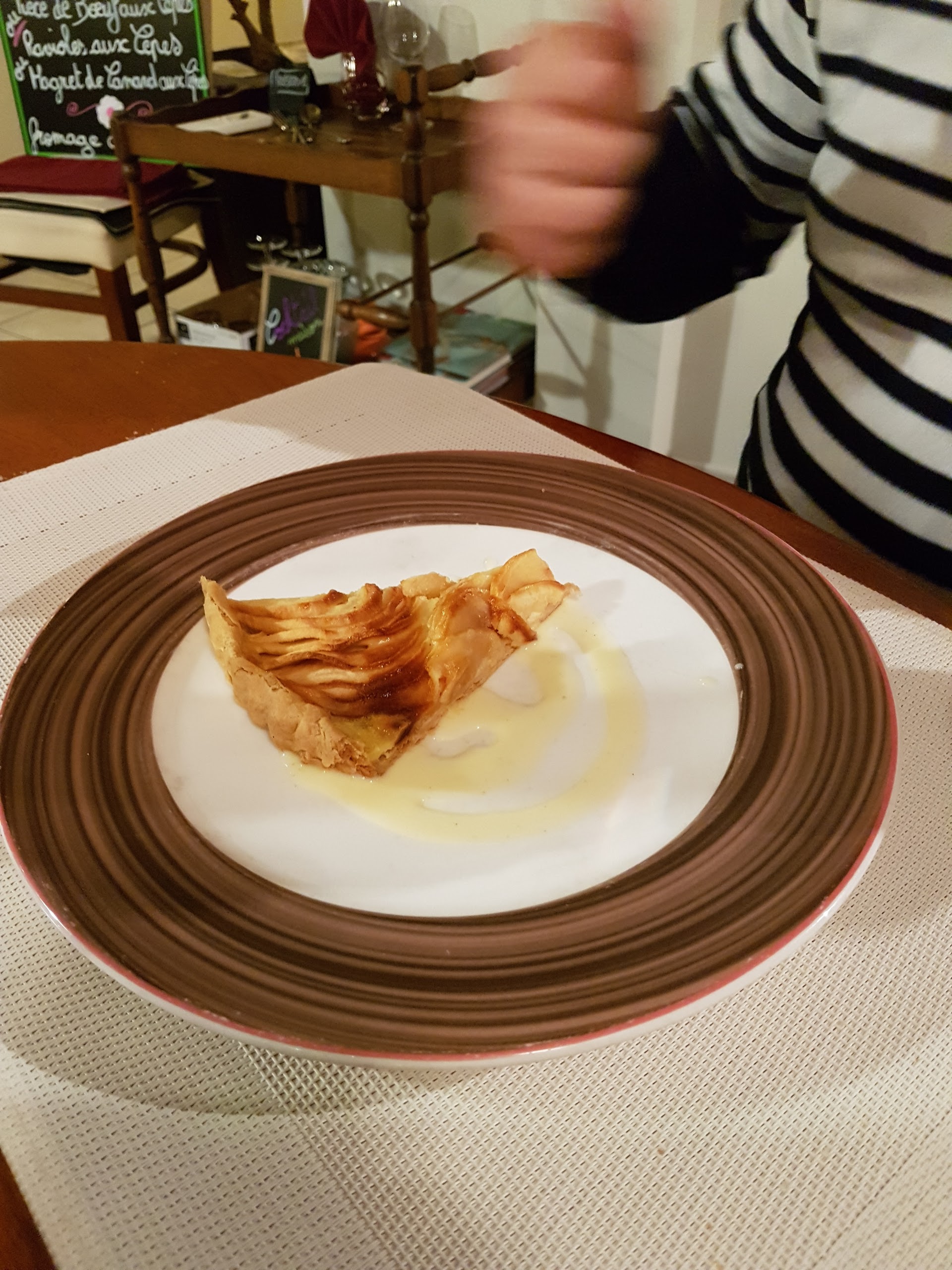 Salade ravioles au picodon très copieuse, plat aiguillettes de canard accompagnées de purée carotte poireaux apprécié , par contre , très déçu par la crème brûlée, qui recouvrait juste le fond du ramequin , je n’ai pas eu une indigestion !