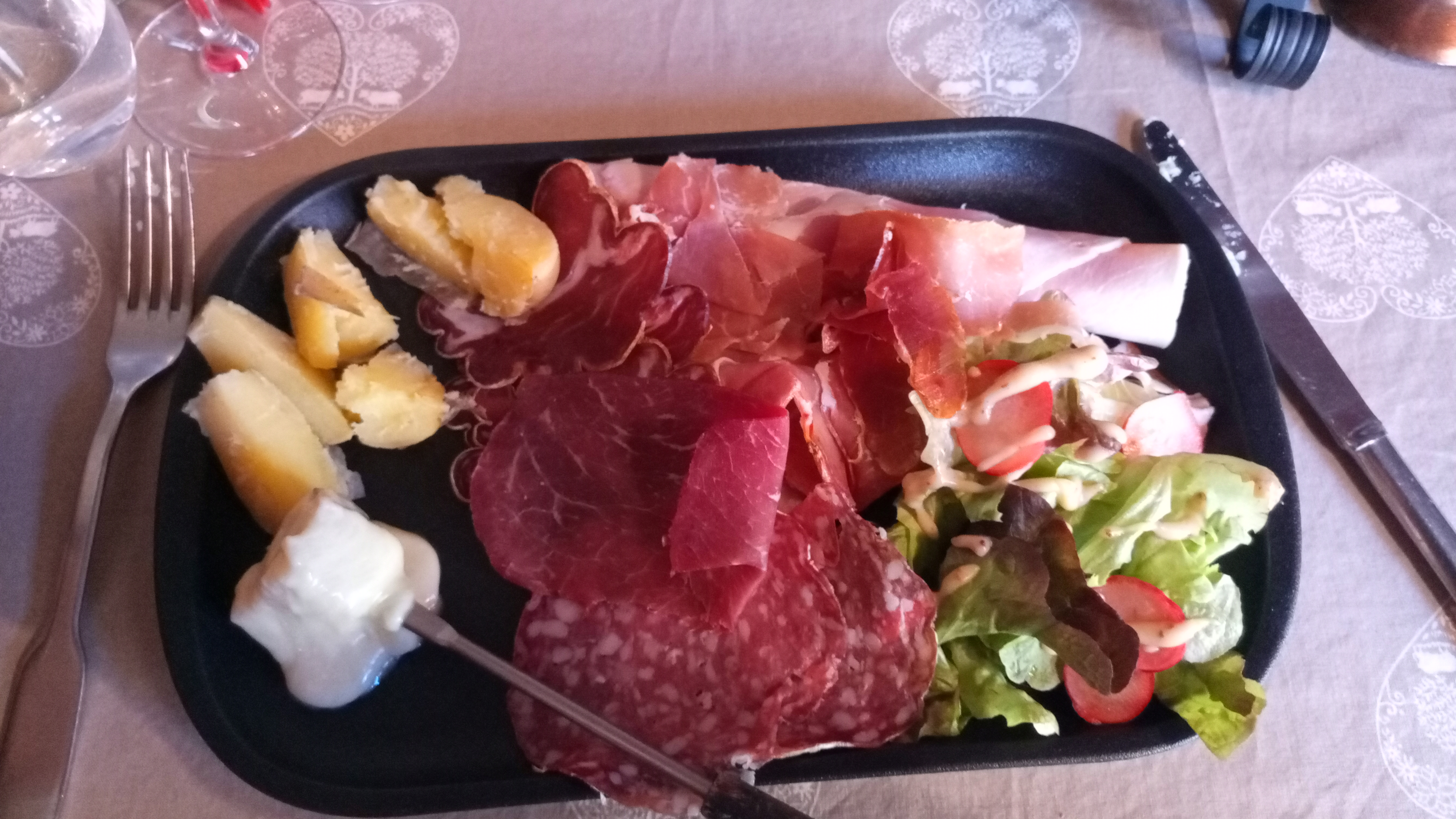 Pommes de terre tièdes, couteaux inadaptés pour la charcuterie, 5 cornichons et 4 oignons vinaigrés pour 7 personnes.!! Constat: À déconseiller.