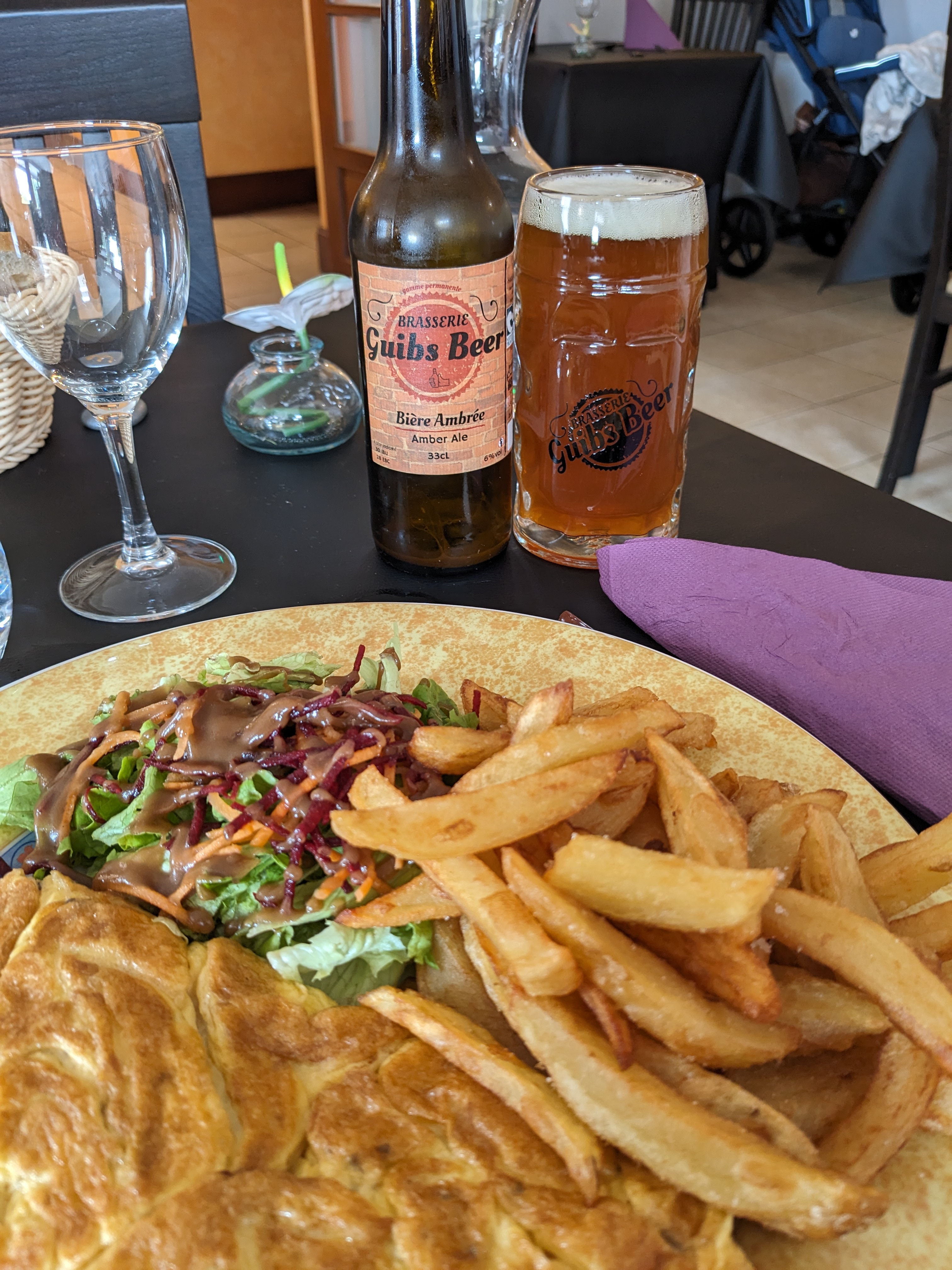 Directement sur le parcours de La Vélo Francette. Arrivé juste après midi un dimanche, c'était calme mais en 5 minutes il y avait du monde. Ils étaient très accommodants avec moi étant végétarien et une omelette, des frites et une salade étaient prêtes en quelques minutes. Le service était excellent. Bonne bière locale et beaucoup d'eau pour un cycliste assoiffé ! Juste ce dont j'avais besoin.