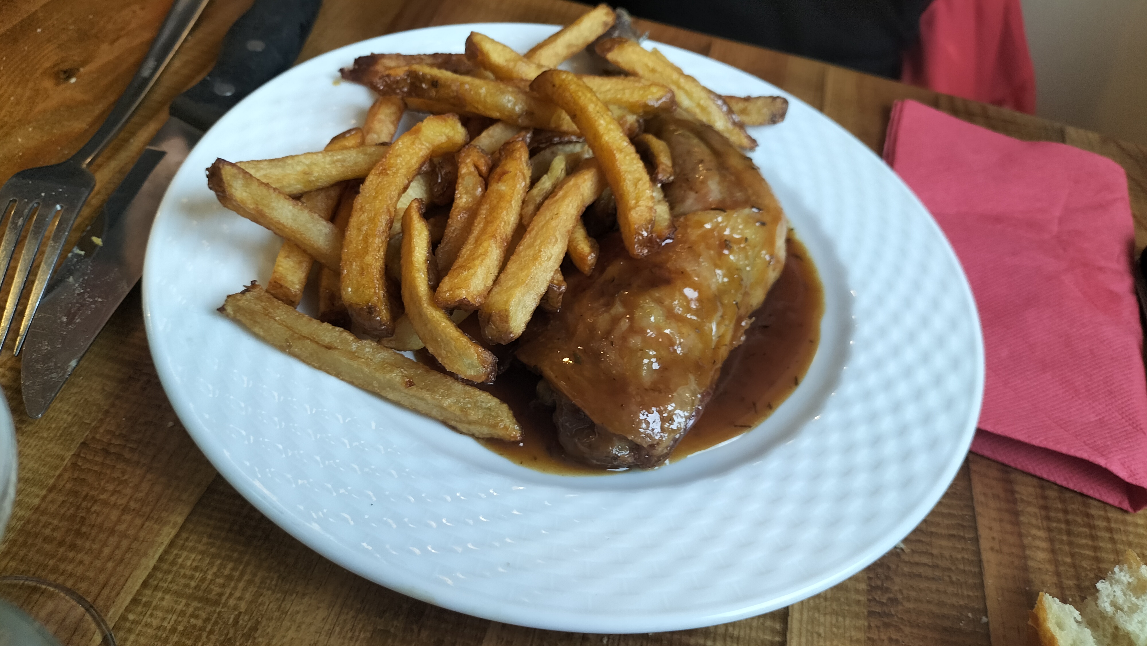 Entrée plat dessert quart de vin 12€90 pommes-de-terre fries grillées éclair chocolat congelée 🤔
