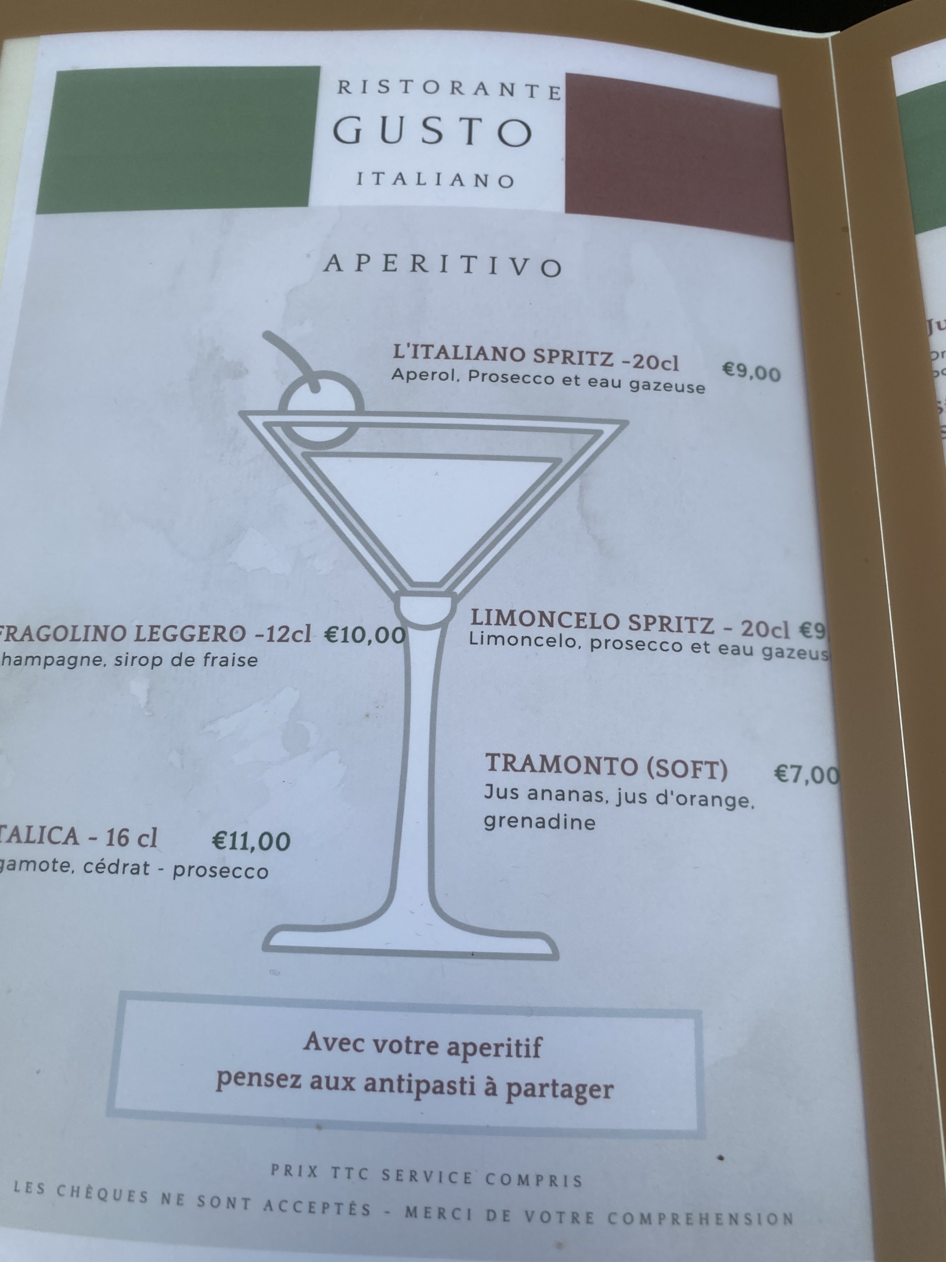 Repas pris en terrasse ombragée. Un resto italien qui vaut le détour, menu Entrée +Plat +Dessert à moins de 22€. Carte des apéritifs aux tarifs élevés (surtout pour des bières blondes basiques)
