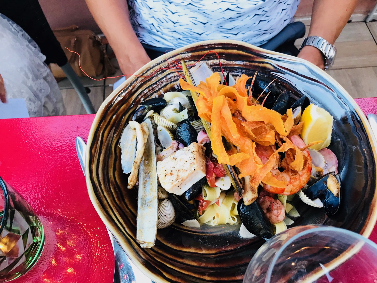 Un régal au départ j'ai choisi la salade Caesar mais en voyant passer l'assiette de pâte j'ai modifié. J'ai pris pâte homard palourdes moule. Rien à redire vraiment très bon