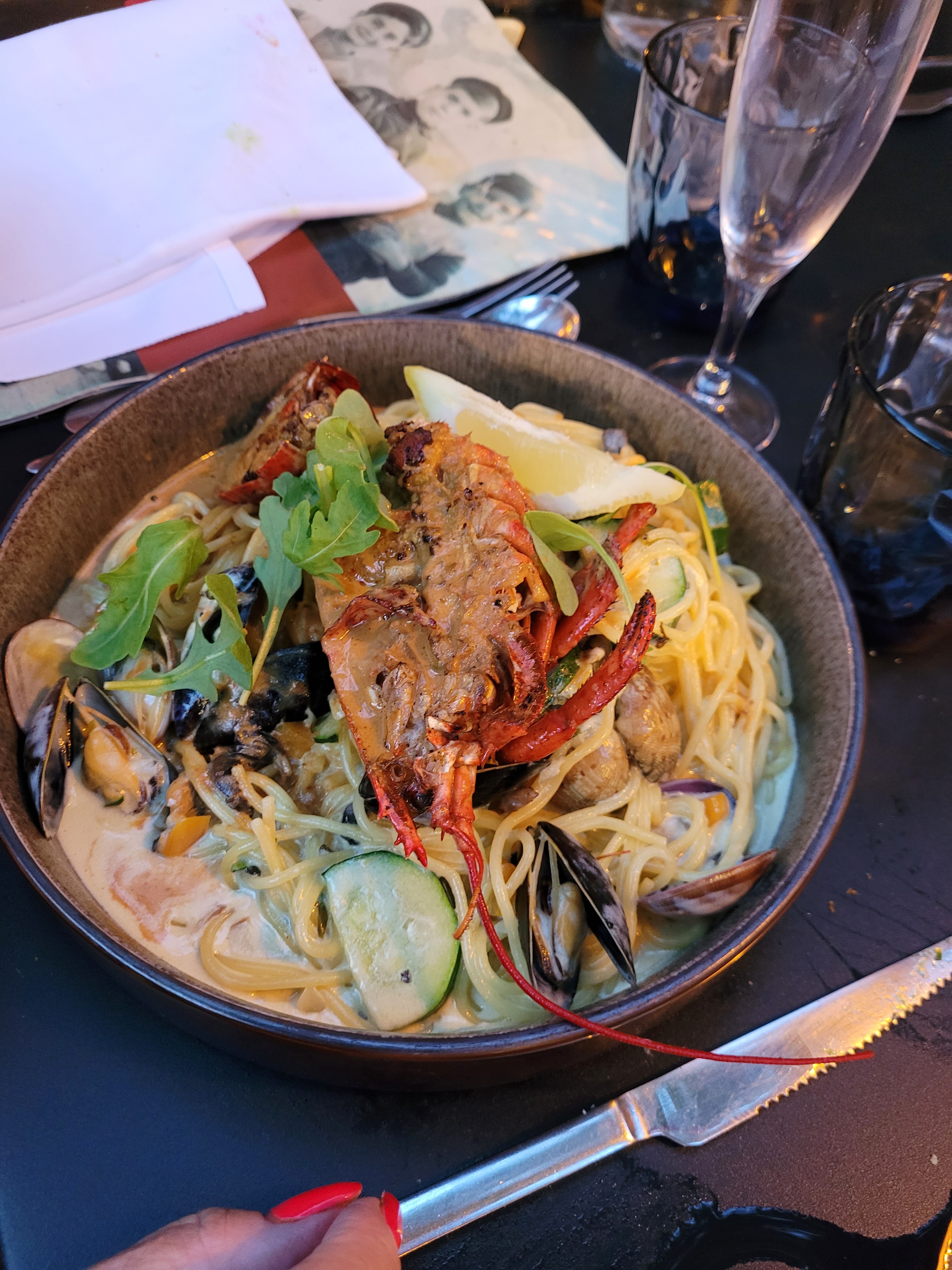 Je recommande ce restaurant dont les plats sont délicieux. Le cadre est sympa et le personnel très attentionné et réactif. Nous avons goûté: - un risotto peccatore (1/2 homard, gambas et St Jacques) - 1/2 homard grillé accompagné de spaghetti C'était un vrai régal ! Merci pour les papilles, on reviendra!