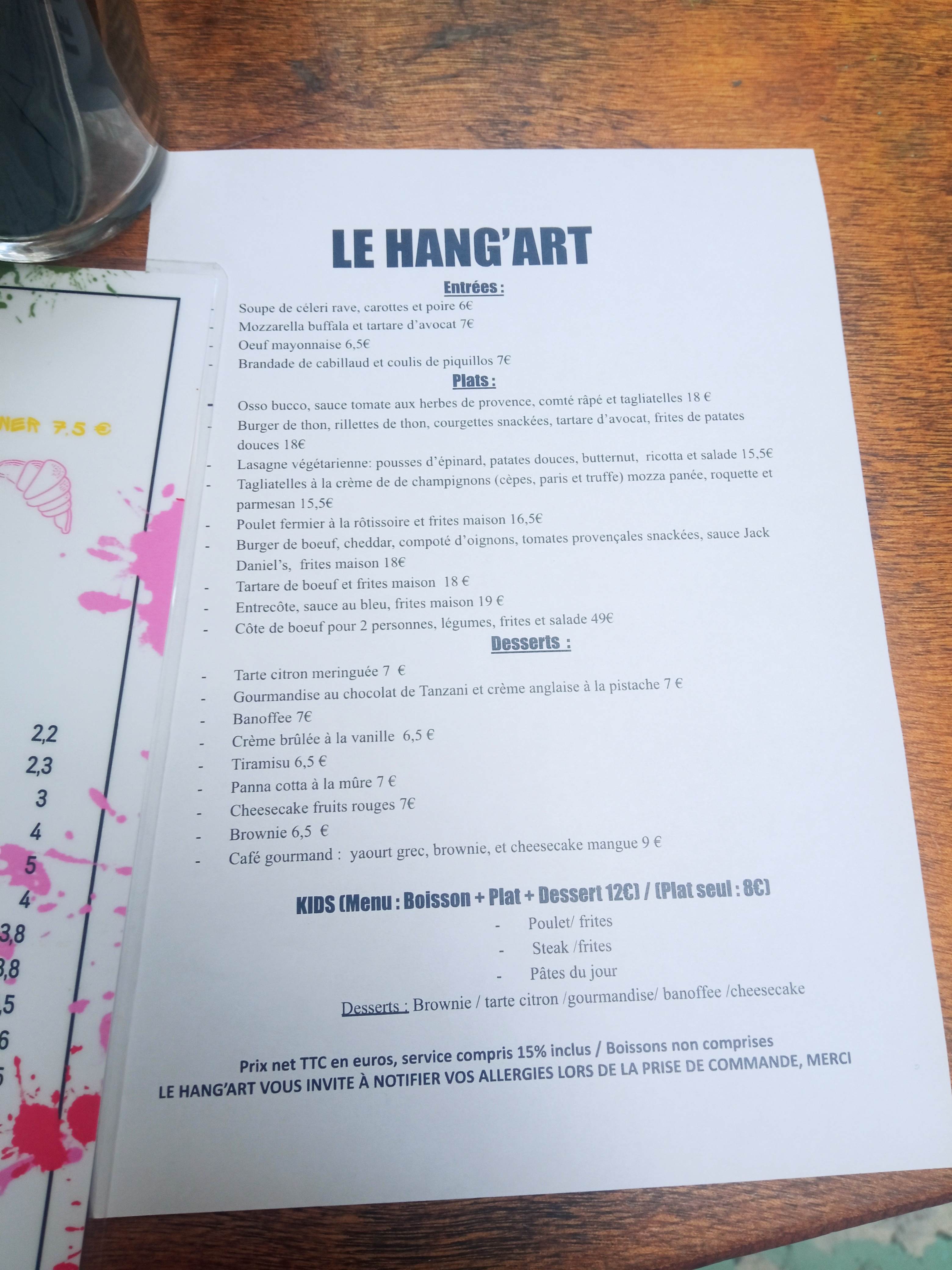 Le Hang'art est un bar où je vais prendre un petit café régulièrement. L'équipe est super sympa. La patron aussi. Le week-end beaucoup de monde, je préfère en semaine. Il y a de la place, on mange bien on boit bien.