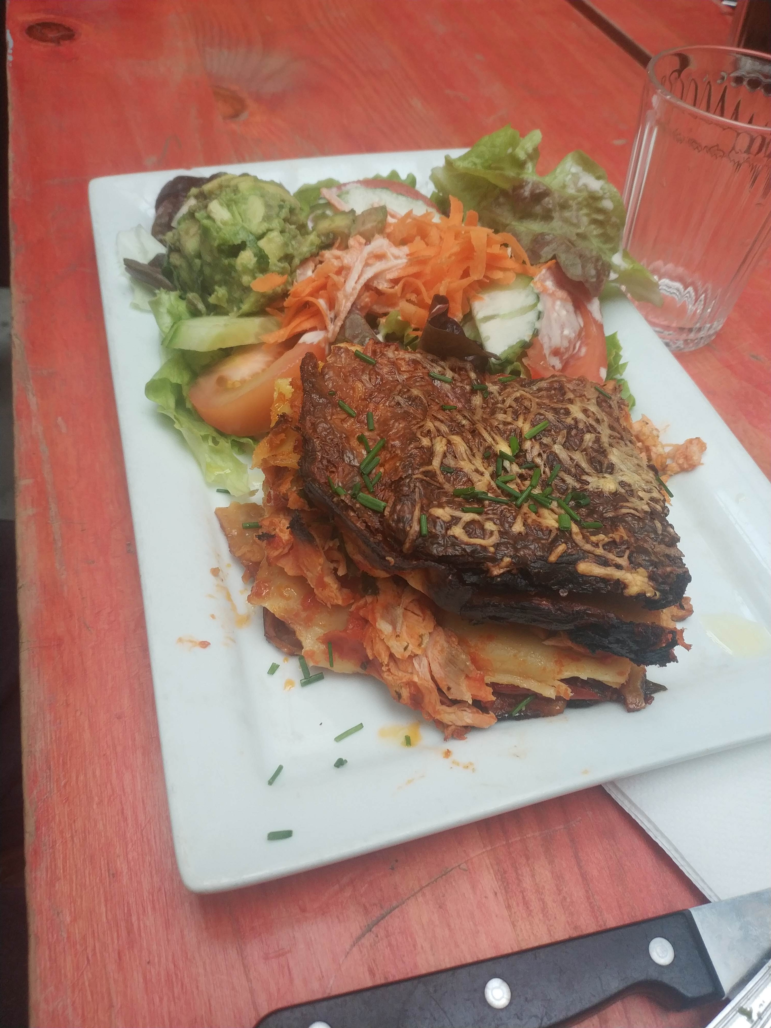 Mitigée, c'est un bel endroit. Le service est long, pour boire 1 verre ou déjeuner, c'est dommage. 1er déjeuner : excellent : 1 galette pour maman et 1 club sandwich veggie pour moi ( qui a disparu de la carte le weekend). 2eme déjeuner : déplorable : soupe arrivée tiède presque froide, baignée dans de l'huile d'olive, on a demandé à les réchauffer + salade de choux à la japonaise, bon mais cher pour la quantité. Donc côté cuisine : peu mieux faire pour des végétariens. Sinon, c'est un endroit bébé friendly, plein de place pour les (grandes) poussettes, mon fils adore. Bien pour 1 verre/1 café en tout cas. J'espère que la qualité des plats s'améliorera et que le service soit moins long car superbe endroit. Tout reste à faire, courage