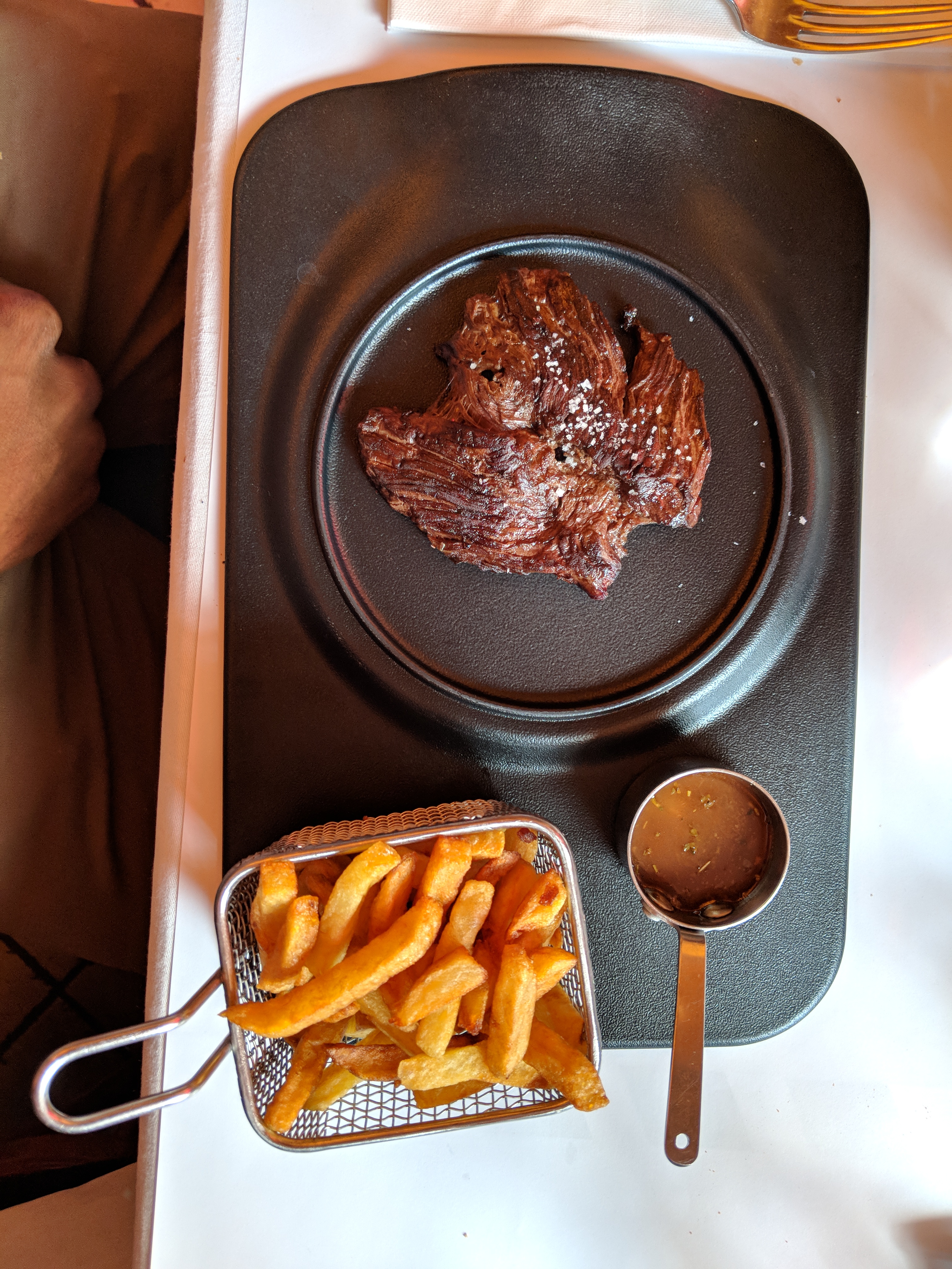 Bonjour Je commence par l'accueil moyen . J'ai choisi le Filet Boeuf fumé très déçu beaucoup trop salé. Les prix non justifiée pour la qualité et la quantité. La personne avec moi a choisi les Moules marinières frites déçu aussi. Le serveur très gentil.