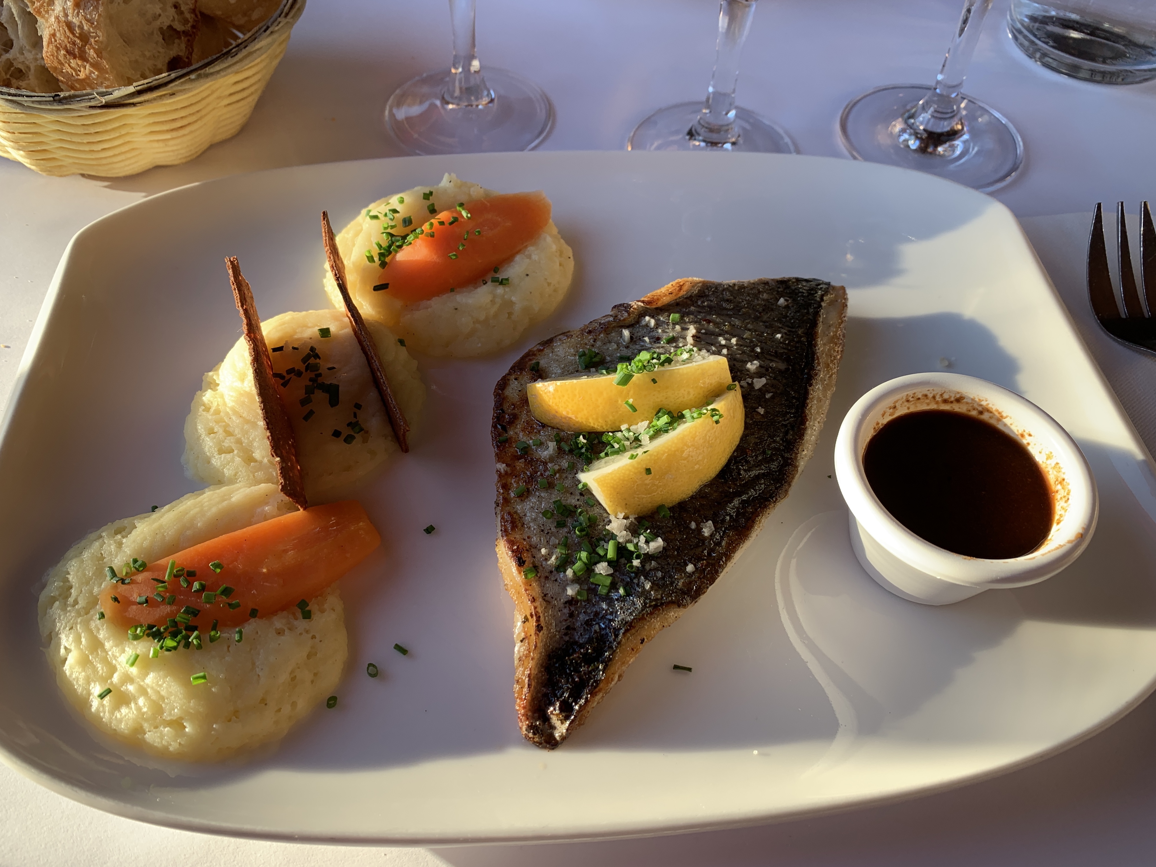 Tout a été parfait ! Le poisson (dos de cabillaud) était très bon et la sauce vraiment excellente ! La purée un régal également. Que dire du service, j'ai rarement vu des serveurs aussi gentils, efficaces et qui vous regardent quand ils vous parlent ! (Malgré un midi où il y avait du monde, ils ont été très pro). Vraiment bravo à cette équipe. Nous avons tellement bien mangé que nous avons hâte de revenir à Cabourg. À bientot
