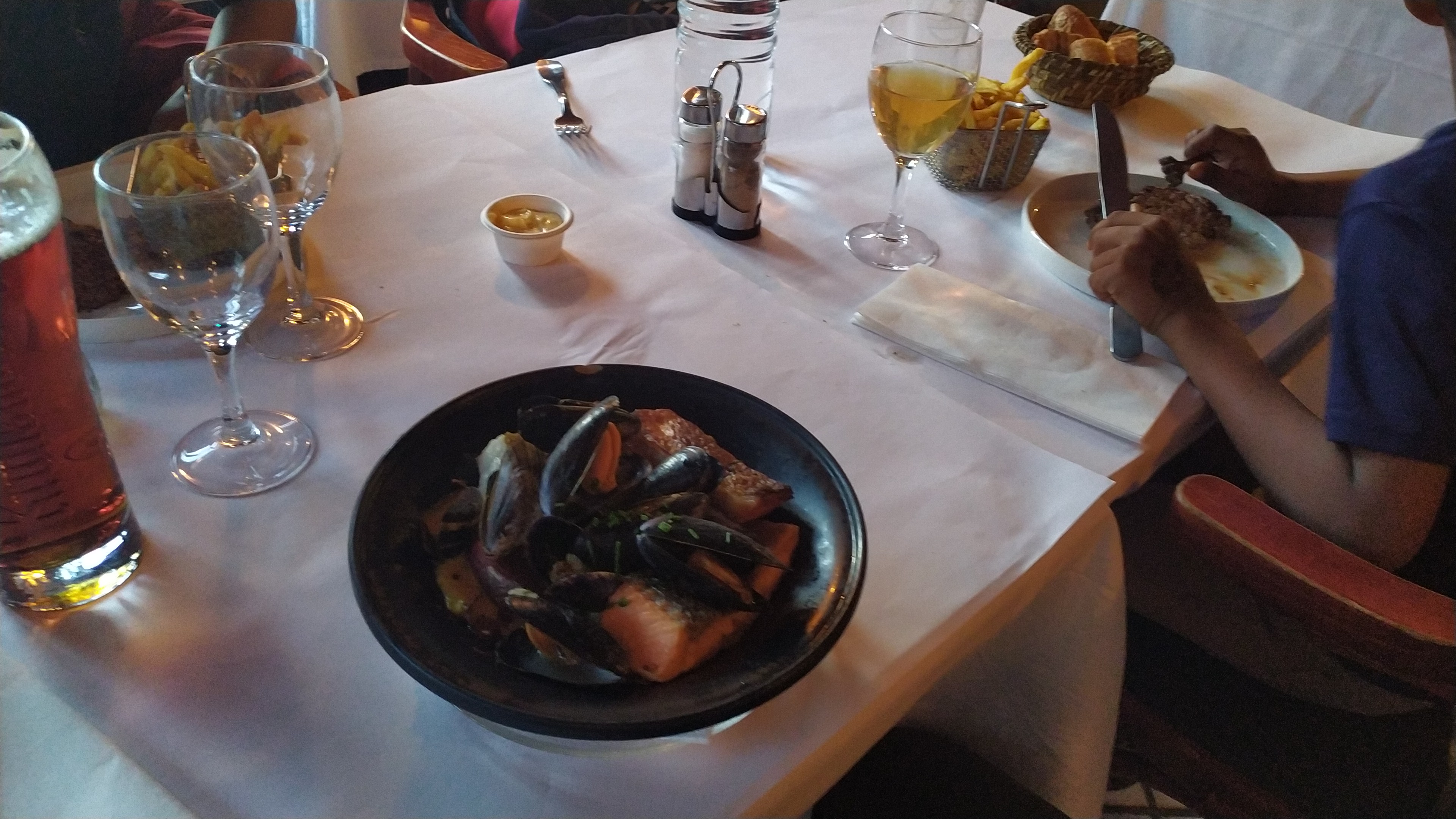 Soupe de poisson en entrée et saumon avec sa sauce à la betterave et petits légumes en plat. Je suis rarement aussi satisfaite. Je me suis régalée comme jamais. Agréablement surprise! Par contre la rouille n'en était pas... une espèce de purée jaune froide sans intérêt je n'ai pas compris (je n'ai pas osé demander). Mon conjoint a pris des moules et était embarrassé pour la manger car servie dans un grand bol, il n'a pas trouvé cela assez volumineux pour attraper la sauce au fond sans tout faire tomber hors du plat... une cassolette aurait été plus appréciée. Les frites étaient aussi délicieuses mais servies en trop petite quantité. Je n'ai pas pris de dessert mais ai finalement dévoré la moitié du sien, un fondant au chocolat délicieux. Mon mojito était décevant comme partout dans la région. Pas de sirop de canne.... mais du sucre de canne ce qui fait perdre toute sa saveur au mojito, pour 10€ quand même je m'attendais à un vrai mojito. Mais dans l'ensemble je me suis vraiment régalée et j'y retournerai.