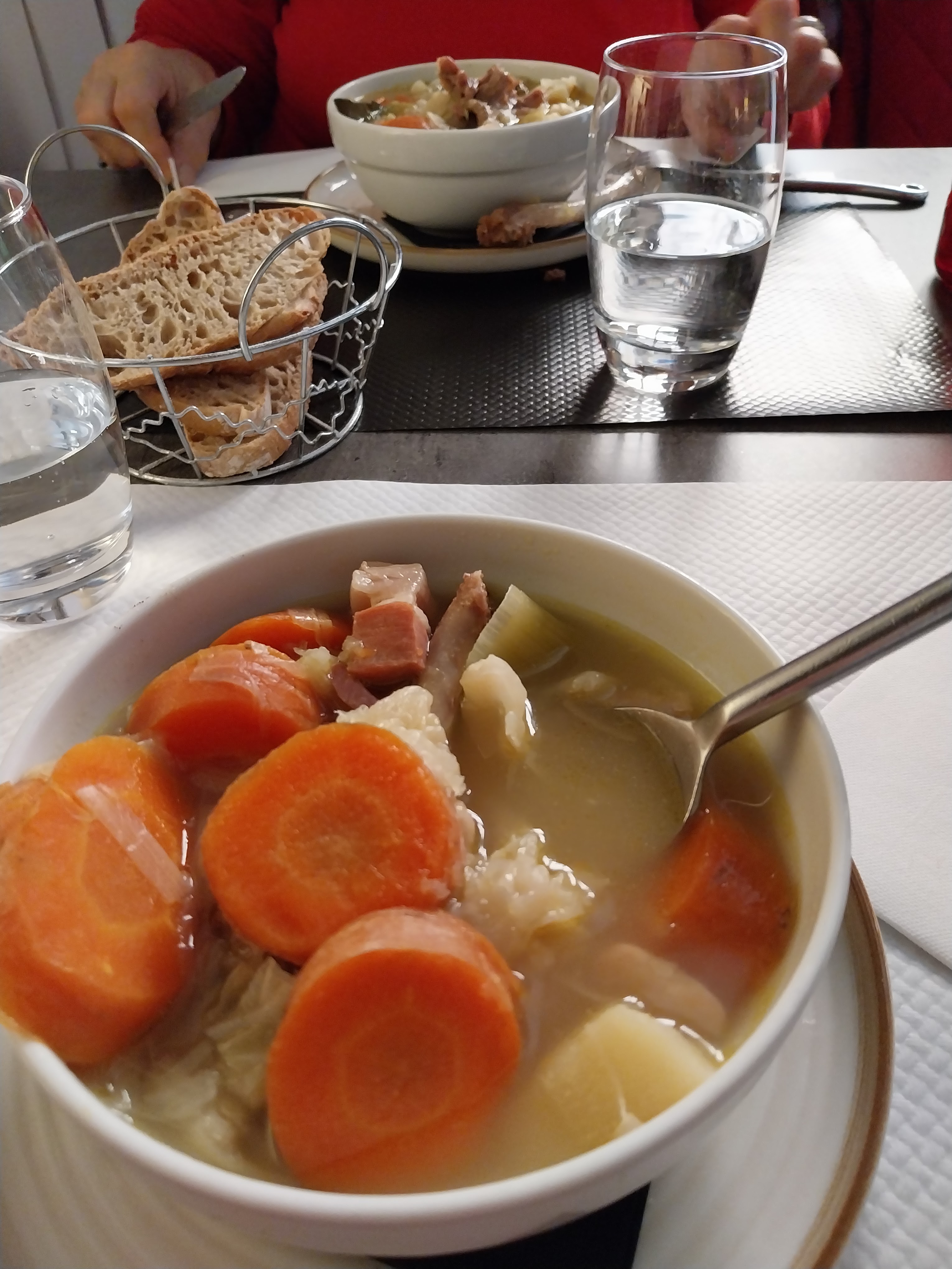Pour moi ce soir c'était garbure en entrée, poule au pot en plat et mousse au chocolat en dessert. Les plats étaient copieux et délicieux,avec une viande tendre, j'ai trouvé un bon rapport qualité prix. Surtout, merci aux deux messieurs qui nous ont servi; leur accueil chaleureux, le cadre pittoresque, et la nourriture délicate me feront revenir. Je n'avais jamais été aussi bien reçue dans un restaurant, merci encore, je reviendrai.
