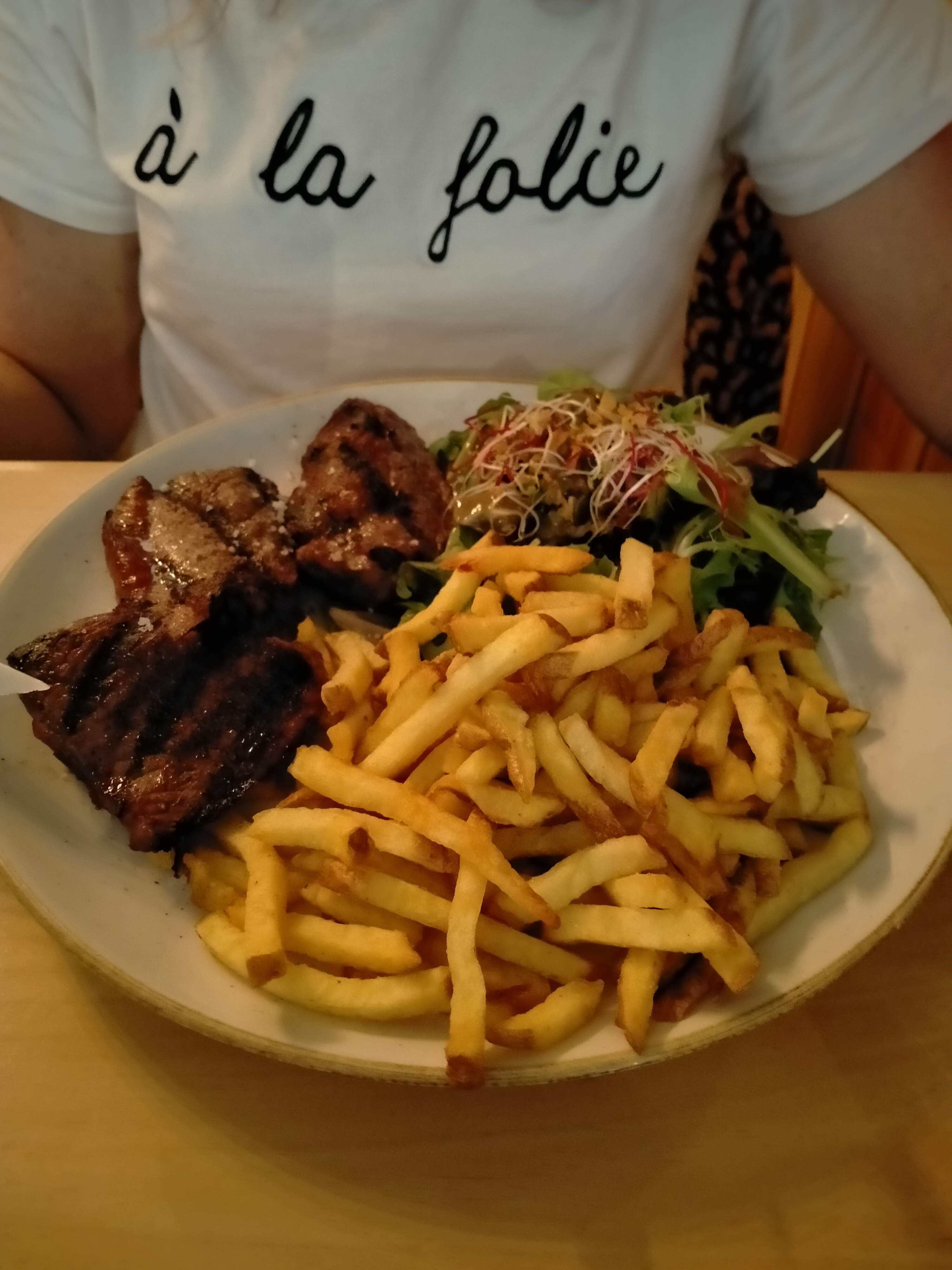 Le monsieur avec la chemise qui a l’air d’être le patron nous a très bien conseillé, avec des produits de qualité, des prix défiant toute concurrence, des pièces de bœuf incroyables parfaitement cuites, des frites maison d’une succulence rarement atteinte, un tiramisu de la mama, une ambiance cosy et une bienveillance de la part du personnel, des serviettes ecoresponsable, essuyant bien les coin de bouche, bravo pour votre politique RSE. Bref c’est 100% VACHEment bon, je recommande.
