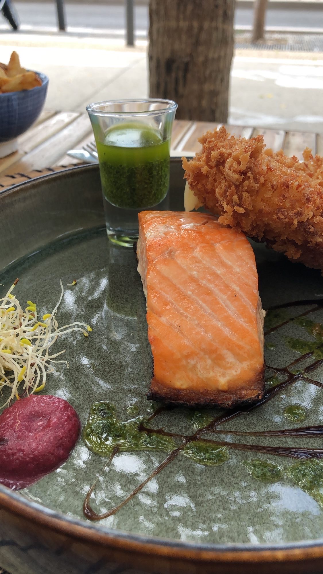 C’est un lieu tres original, la terrasse extérieure est spacieuse et nous promet un moment agréable. Le service est excellent, les serveuses sont au petit soin, et les plats sont préparés rapidement, c’est tres agréable. Le rapport qualité prix est surprenant (positivement) mais ne mérite «que » 4 étoiles, car un peu déçu par l’équilibre des plats, cassolette trop copieuse, crème omniprésente, saumon un peu sec, et les desserts présentaient un biscuit trop épais/sec… c’est vraiment du détail à améliorer même si nous retenons une expérience globalement très positive et que nous y retournerons avec plaisir. Une belle adresse si vous voulez manger plat dessert boisson à 60€ à deux.