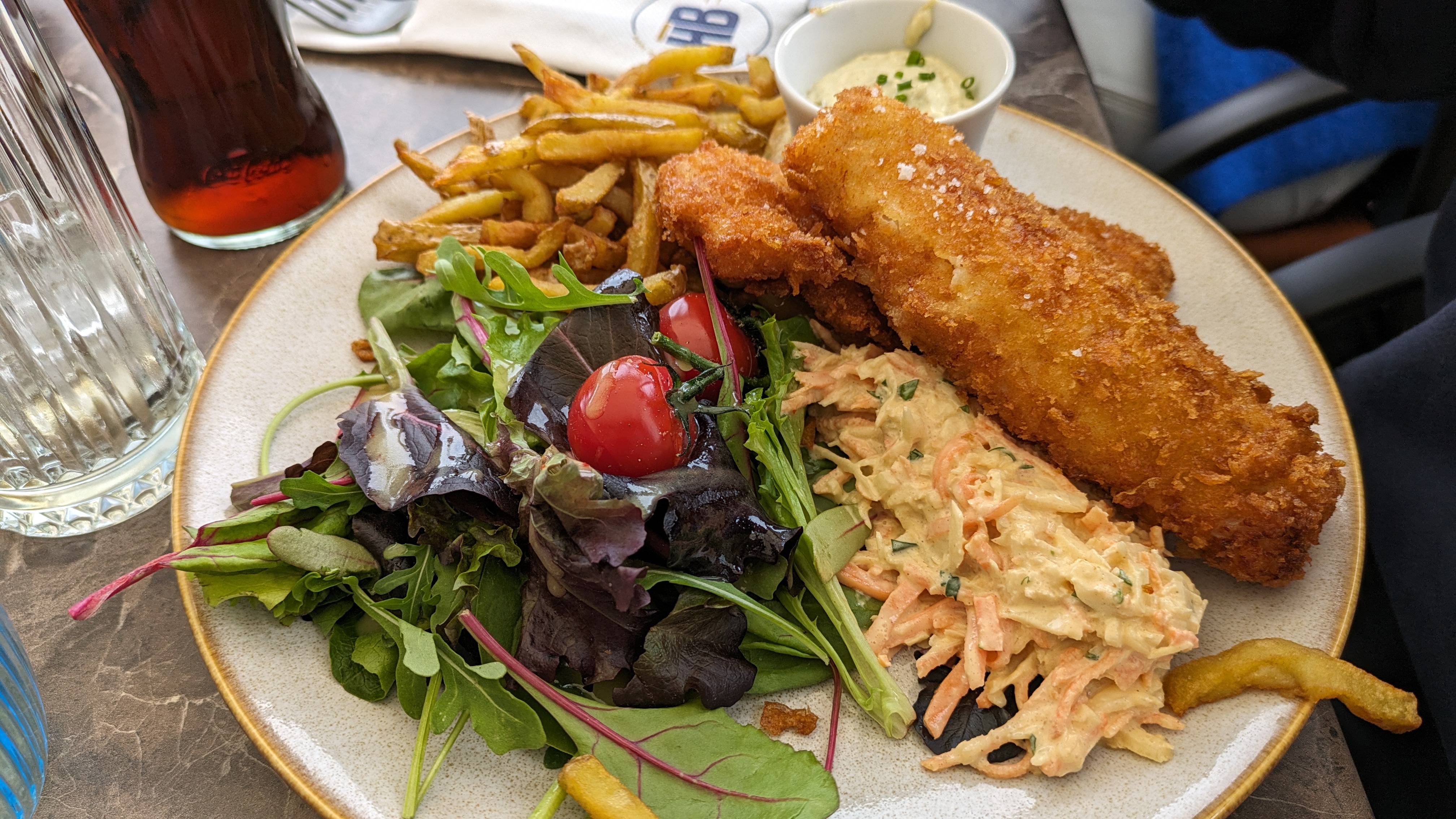 Je me suis fiée à des avis Google qui semblaient bons mais franchement passez votre chemin. Placée sous l’enceinte qui diffuse de la radio, pas de thon aujourd’hui mais on le dit lors de la commande, du coup je prends un fish and chips: insipide, salade flétrie, frites molles, gras, sauce tartare industrielle ainsi que le coleslow, certainement passé et sans goût … à part la vue depuis la terrasse… mais pour ça on peut se promener le long de la plage.
