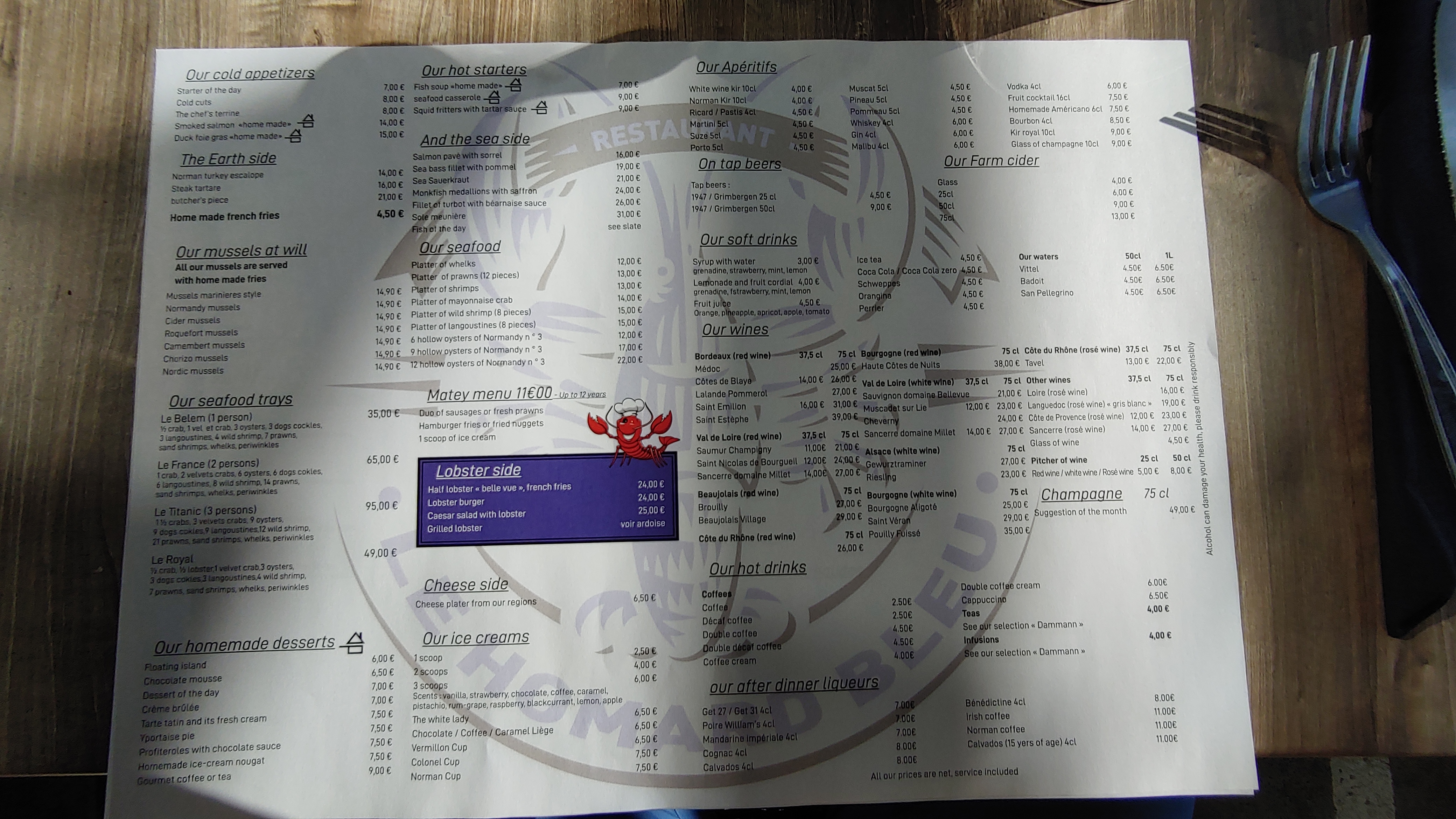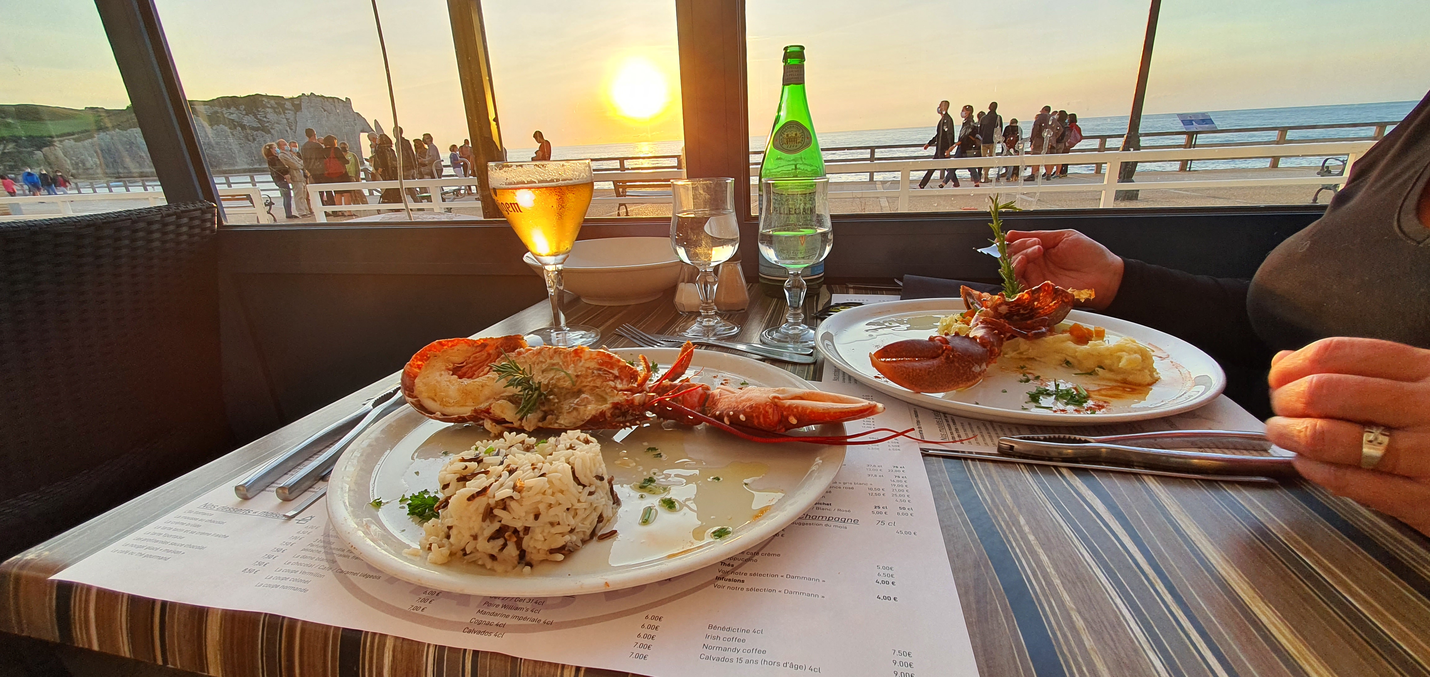 Déçu par la prestation HOMARD BLEU à la plancha tout était bien ,le cadre la superbe vue avec les falaises et le coucher de soleil ,le choix du Homard dans le vivier. Mais lorsqu'il est arrivé dans l assiette... nous avons été déçu cru à moitié, goût fade pas de sauce pour accompagner et garniture limite .on c'est rattraper sur la bonne assiette de fromage et le fromage.