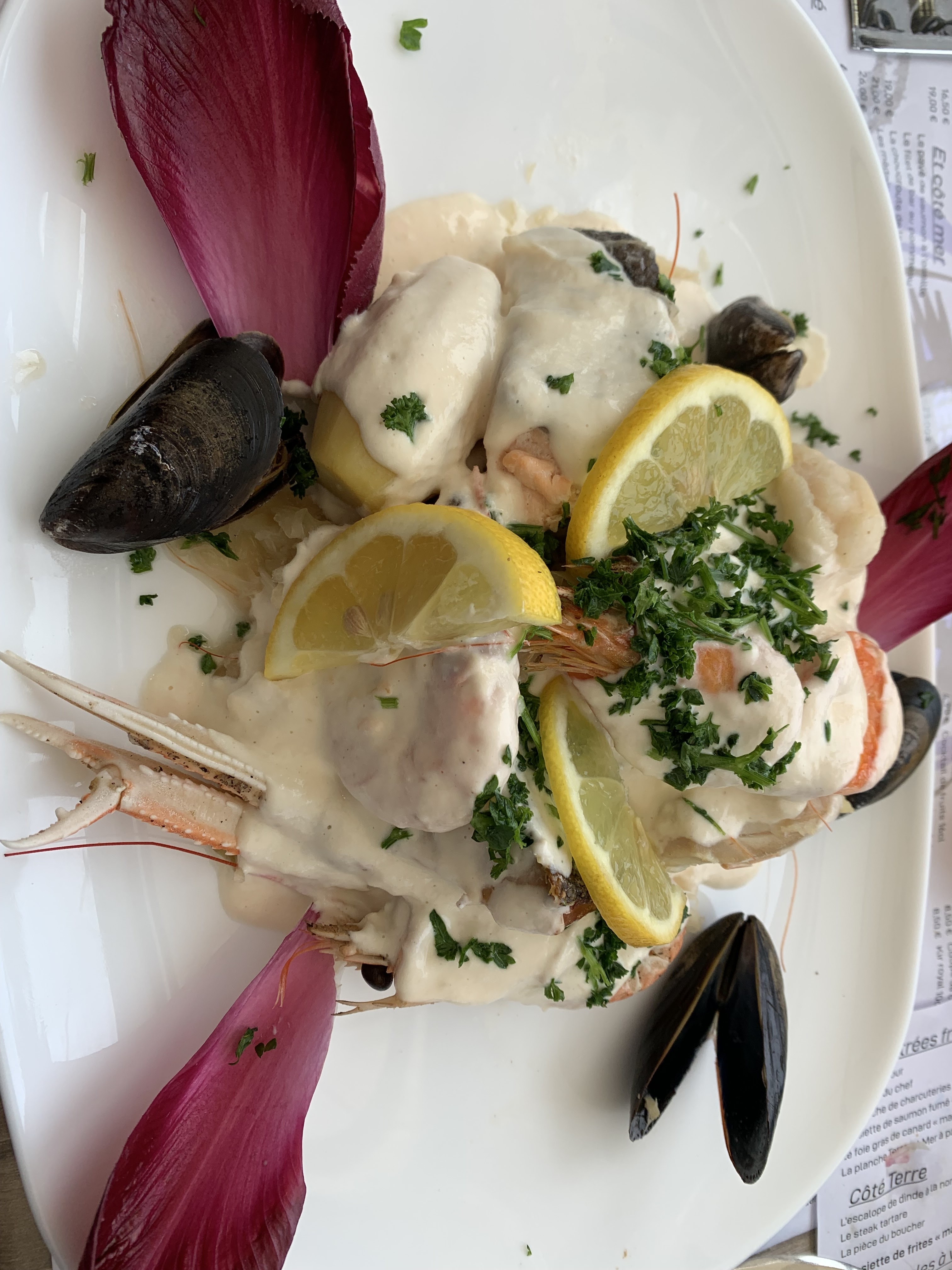Très bon, moules au camembert super sympa et locale ! Les plats à base de homard 🦞 sont également super ! Les portions sont très généreuses et les prix au vu de l’emplacement assez exceptionnel en bordure de terrasse sont tout à fait corrects ! Je recommande ce sympathique restaurant.