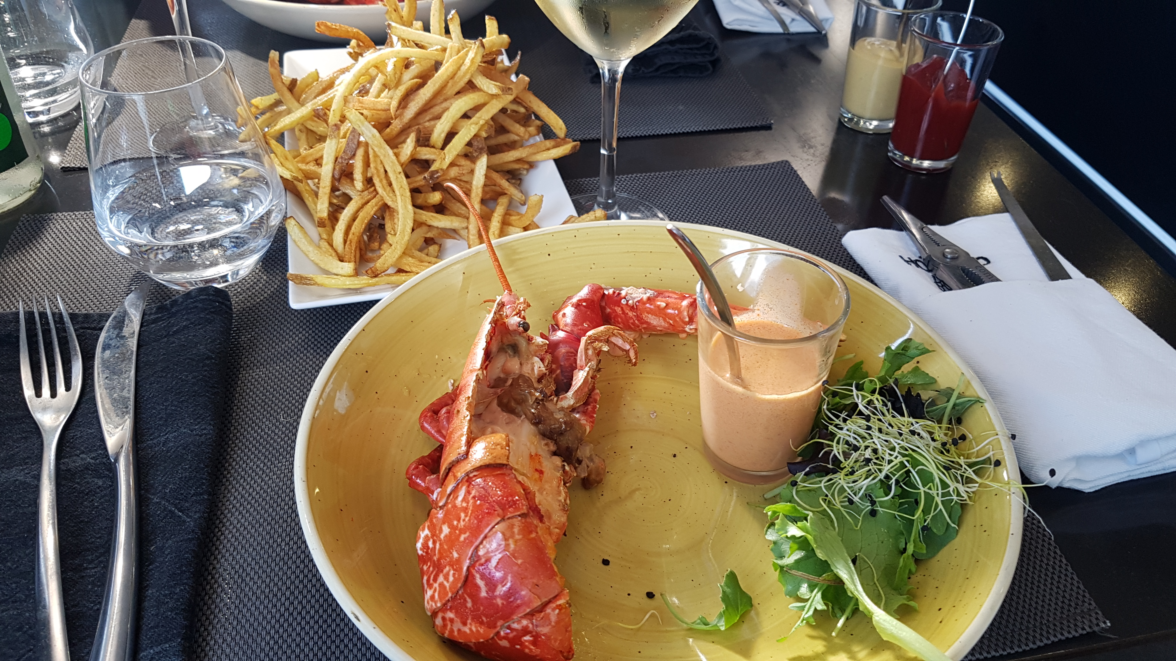 Du homard, des frites et un accueil chaleureux, sans oublier les sauces du chef. Simple et efficace pour cette rencontre incongrue😉