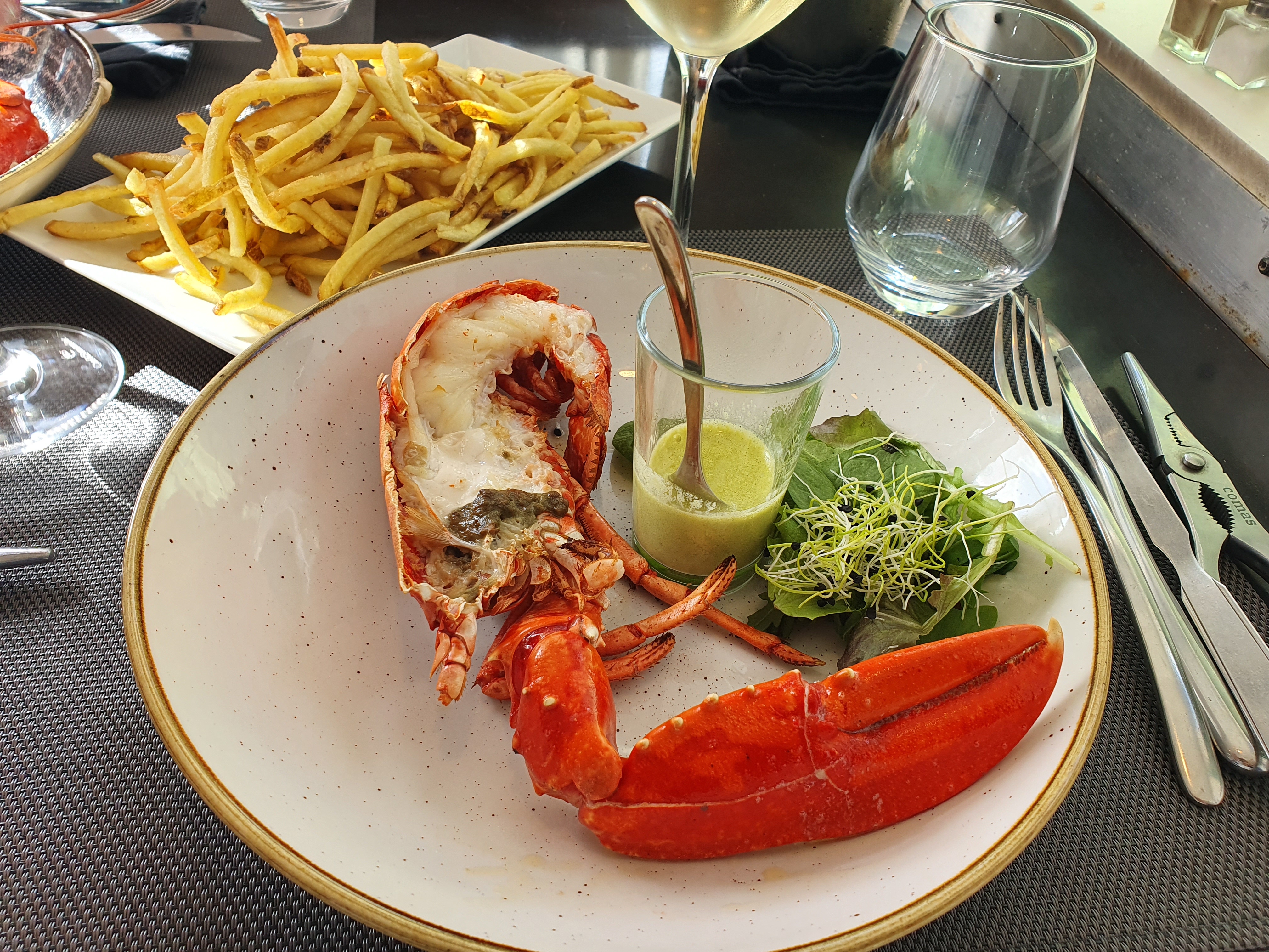 Nos premières vacances dans le Morbihan et notre première fois au Homard Frites. On s'est régalés 😋😋😋 l'amuse bouche crème de wakamé, pousses de poireaux, la sauce corail, la cuisson des homards, un bon sancerre, des tiramisu hyper légers, le sourire des employés... Bref, un très bon moment, une belle parenthèse en cette période compliquée. Merci 🥂💕