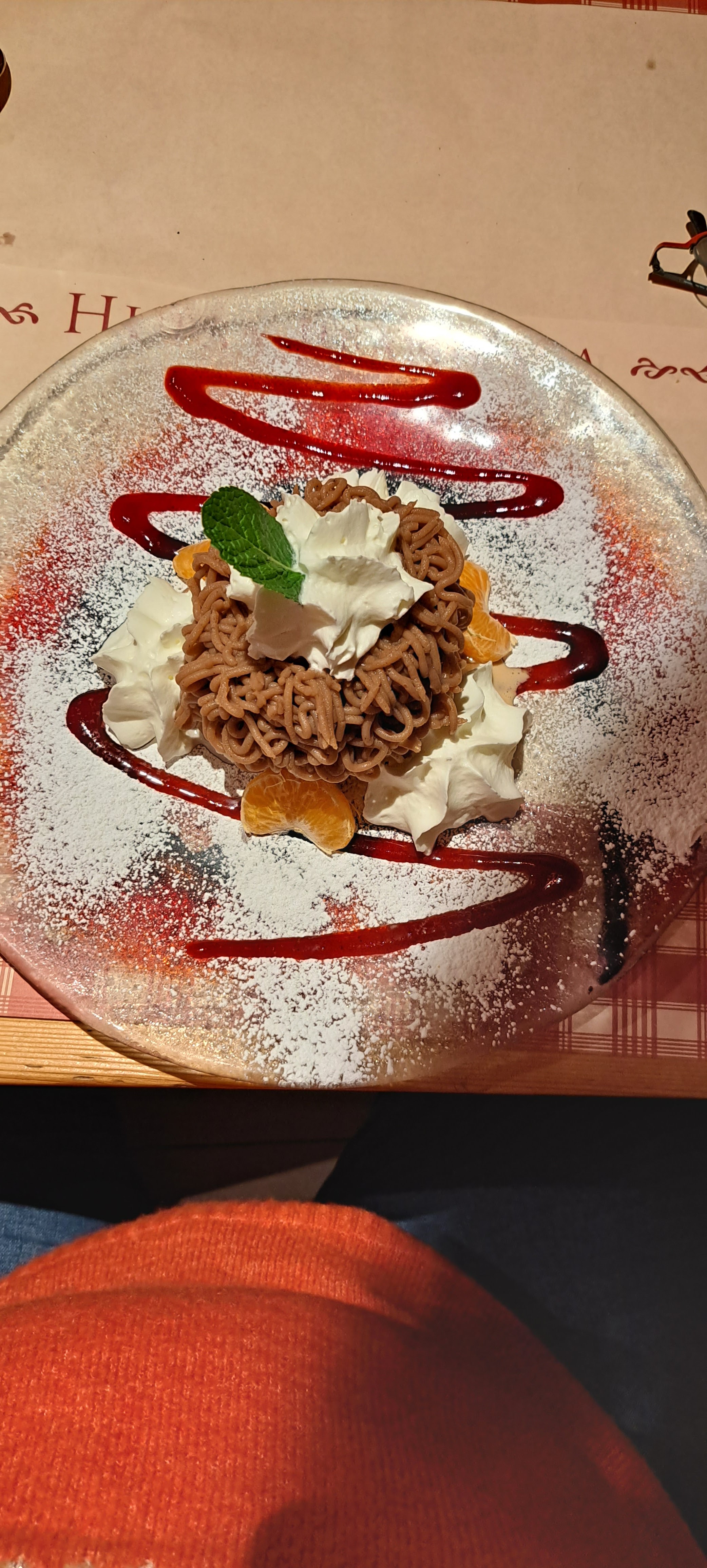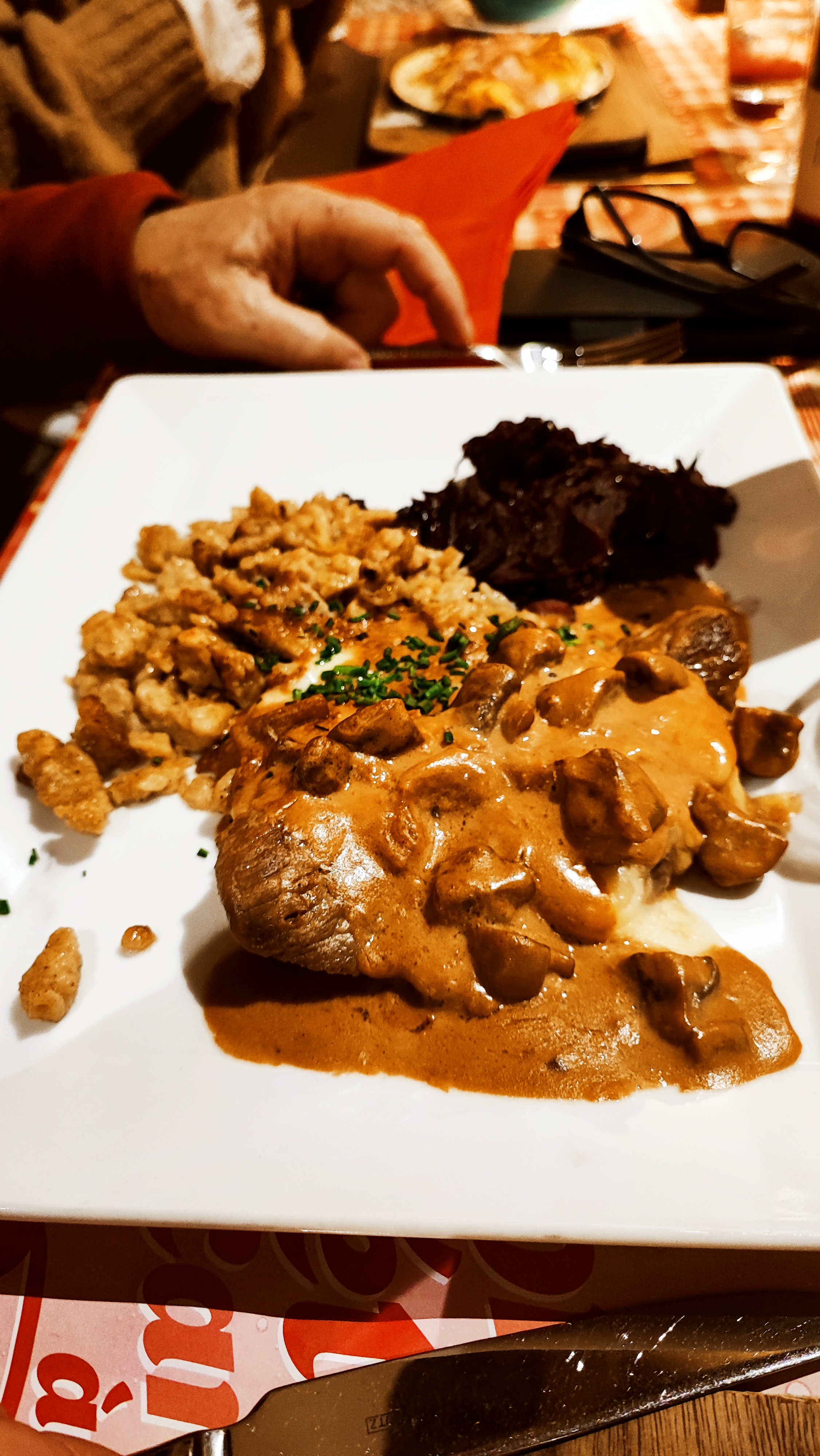 Après une longue randonnée jusqu'au Château du Haut-Kœnigsbourg, nous décidons de nous arrêter pour déjeuner. Tarte flambée moitié cèpes moitié munster. Très bonne ! Puis nous nous laissons tenter part la spécialité de la maison le Hupsa Pfannala et la salade folle. Et surtout laissez vous tenter par la tarte a la myrtille qui est une tuerie !