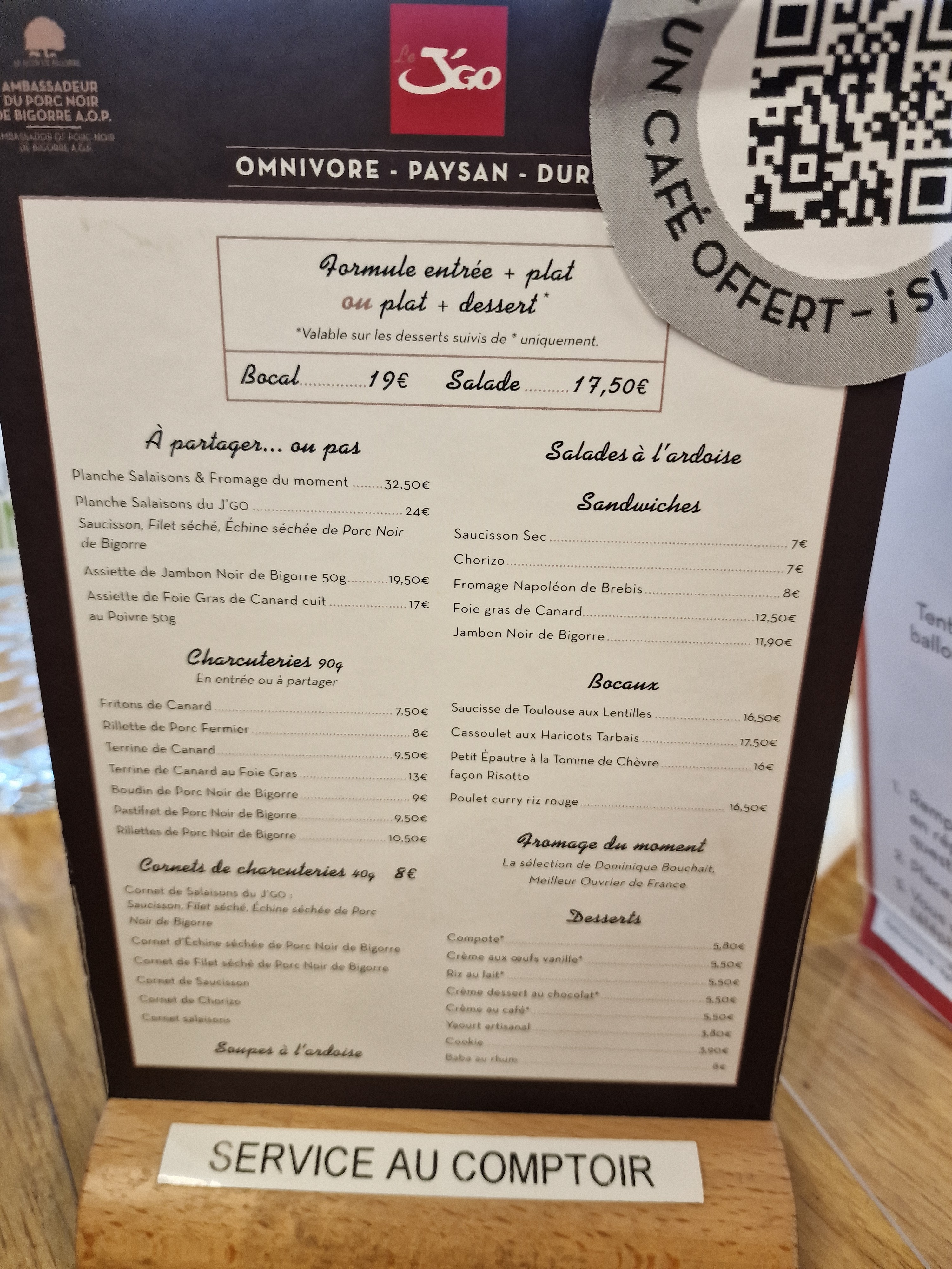Seulement pour boire un verre et grignoter ! Le J'go n'a pas vraiment d'offre de restauration digne de ce nom et c'est bien dommage. Si vous souhaitez simplement boire une bière avec quelques tranches de charcuterie, n'hésitez pas, mais n'espérez pas vous restaurer. 12€ pour un sandwich au jambon de pays au pain simplement huilé, c'est presque une insulte.