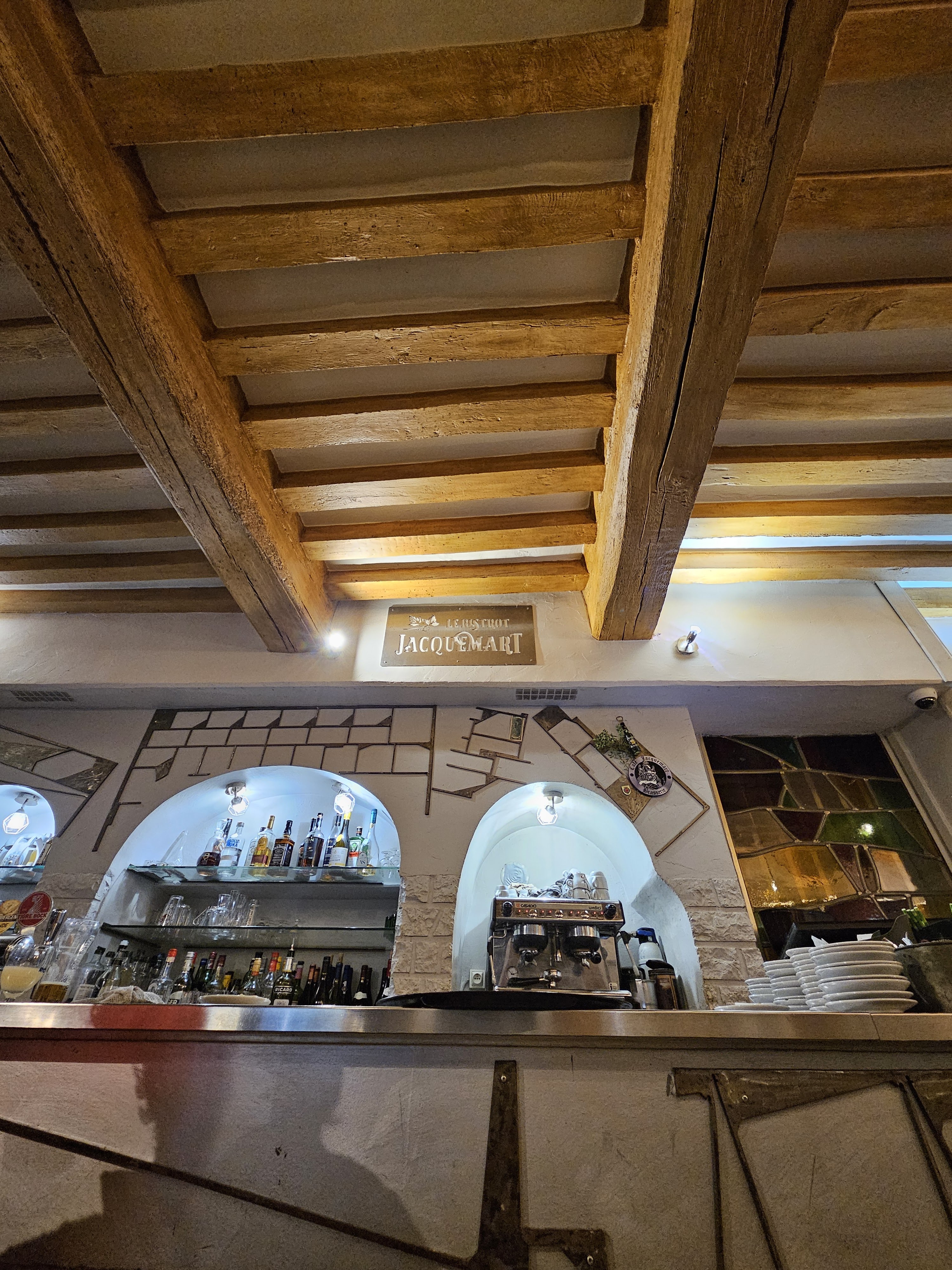 Nous avions décidé de manger dans un restaurant bon marché. Le Jacquemart est l'endroit idéal, petite carte. Celle-ci est simple et efficace. Prix plus que correct, ambiance de quartier avec ses habitués. Beaucoup de bruit, de va et vient, des discussions interminables... si si je vous jure, j'ai entendu que Paris est en bouteille ;-). Au final une assiette bien remplie, avec du goût de l'authenticité dans un cadre d'une brasserie de quartier. Ne cherchez pas la calme et le raffinement ! Ici on vous sert à la bonne franquette, magique!