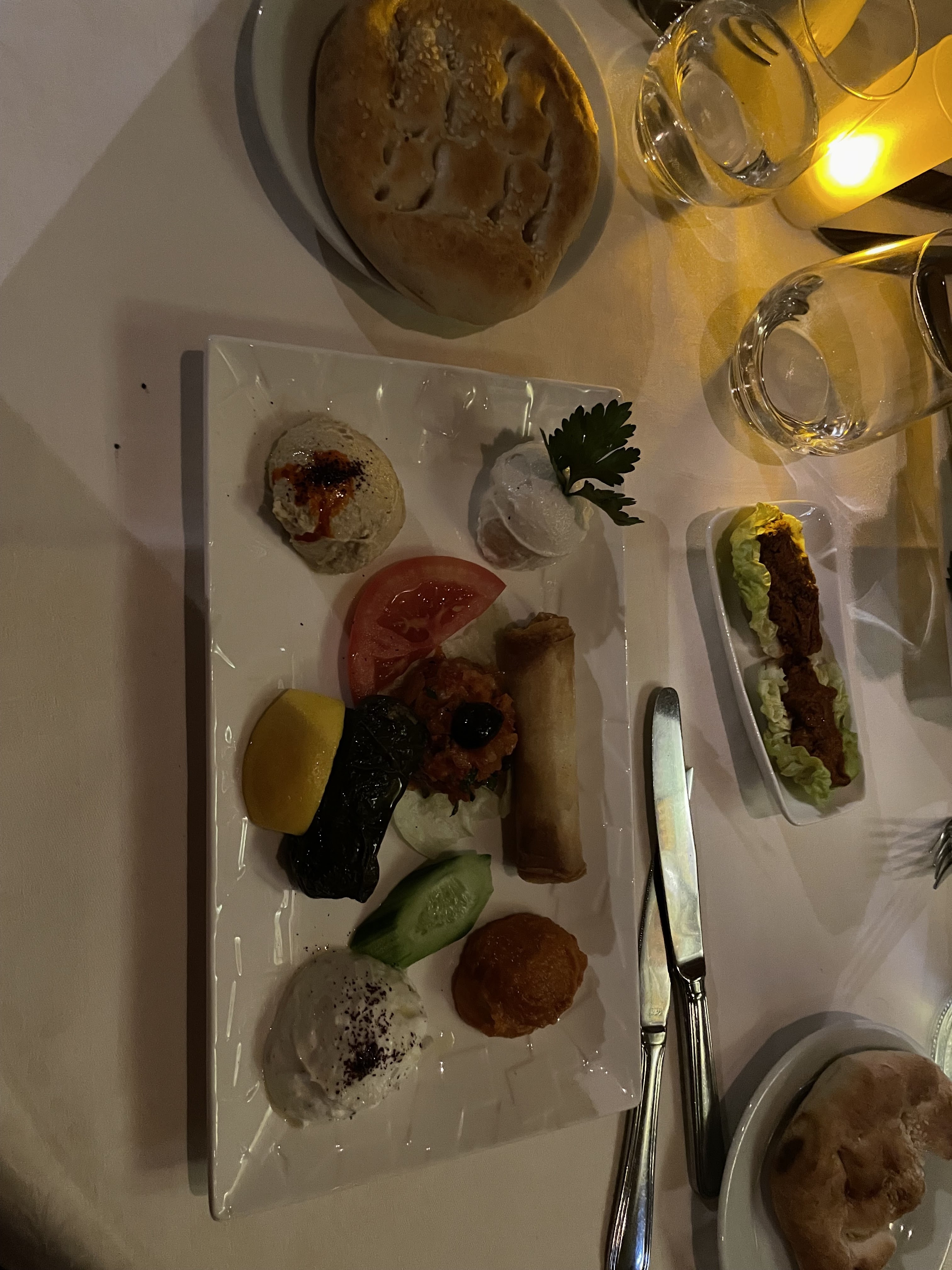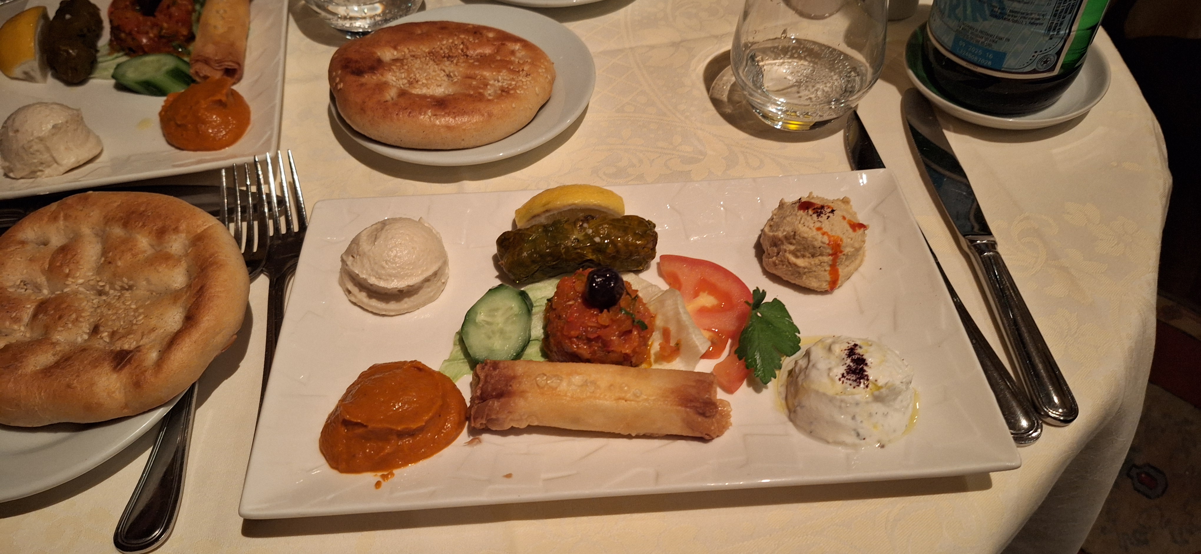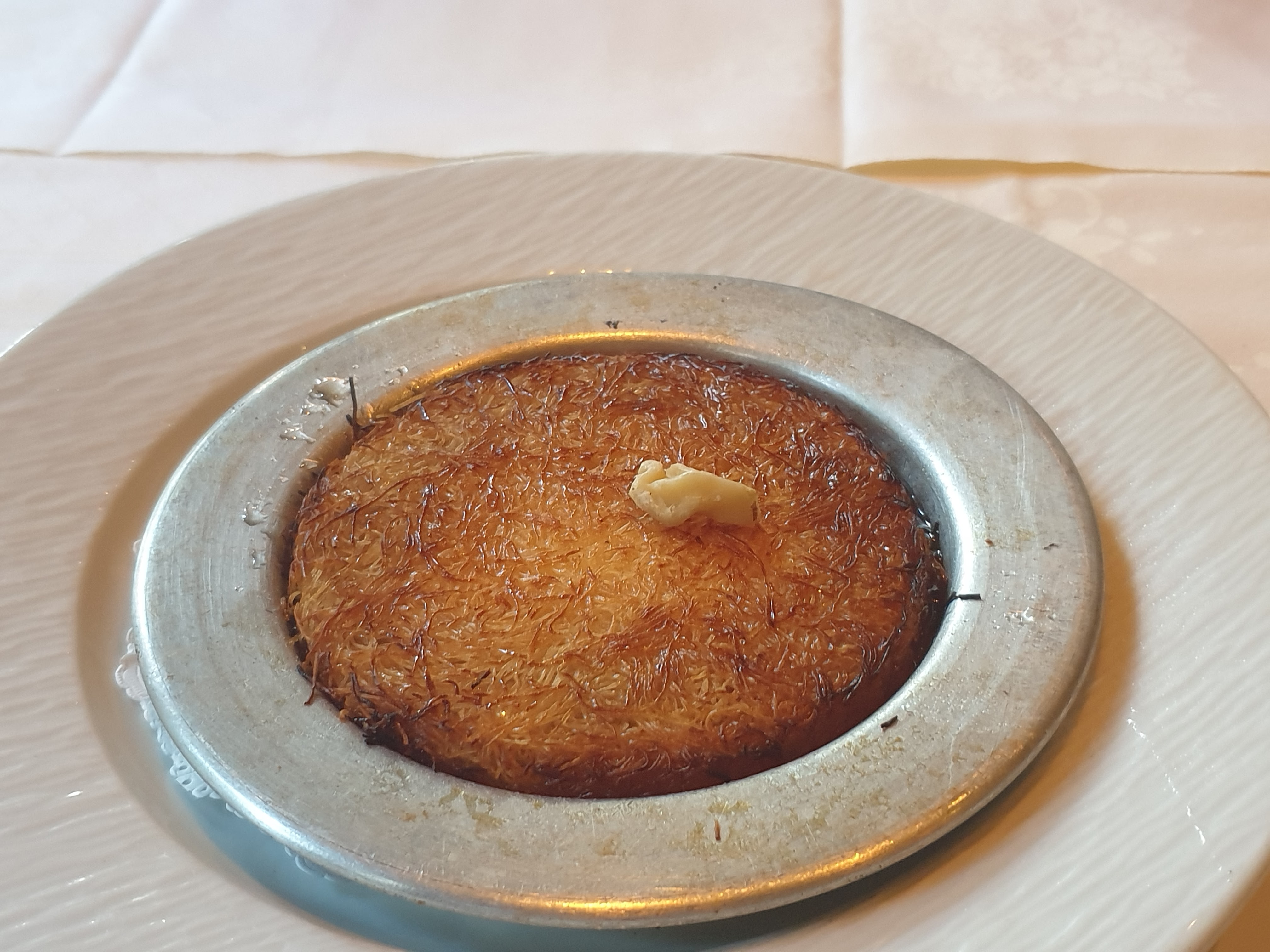 Bon accueil, mezze en entrée : prendre 1 pour 2 personnes, sinon plus fin pour la suite, car pain/galette à volonté. En dessert, potiron confit à la cannelle, et kunefe excellent.