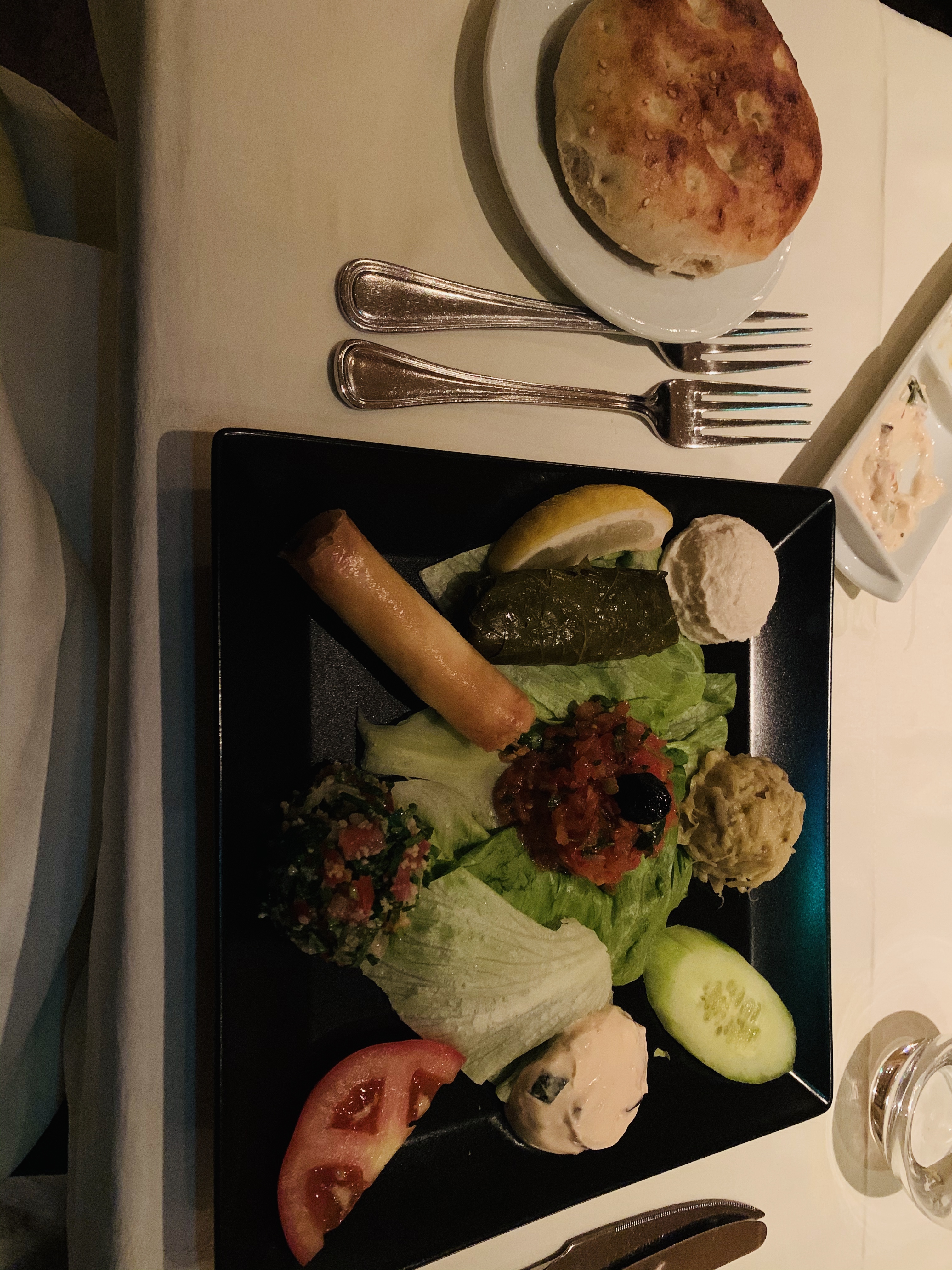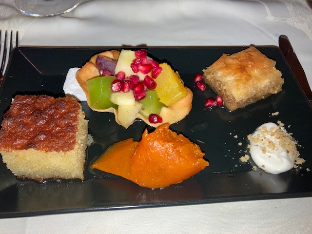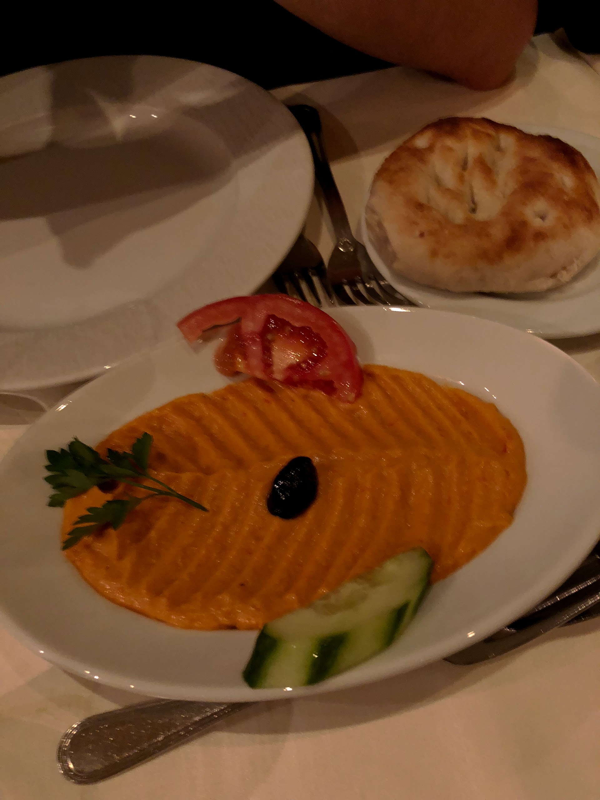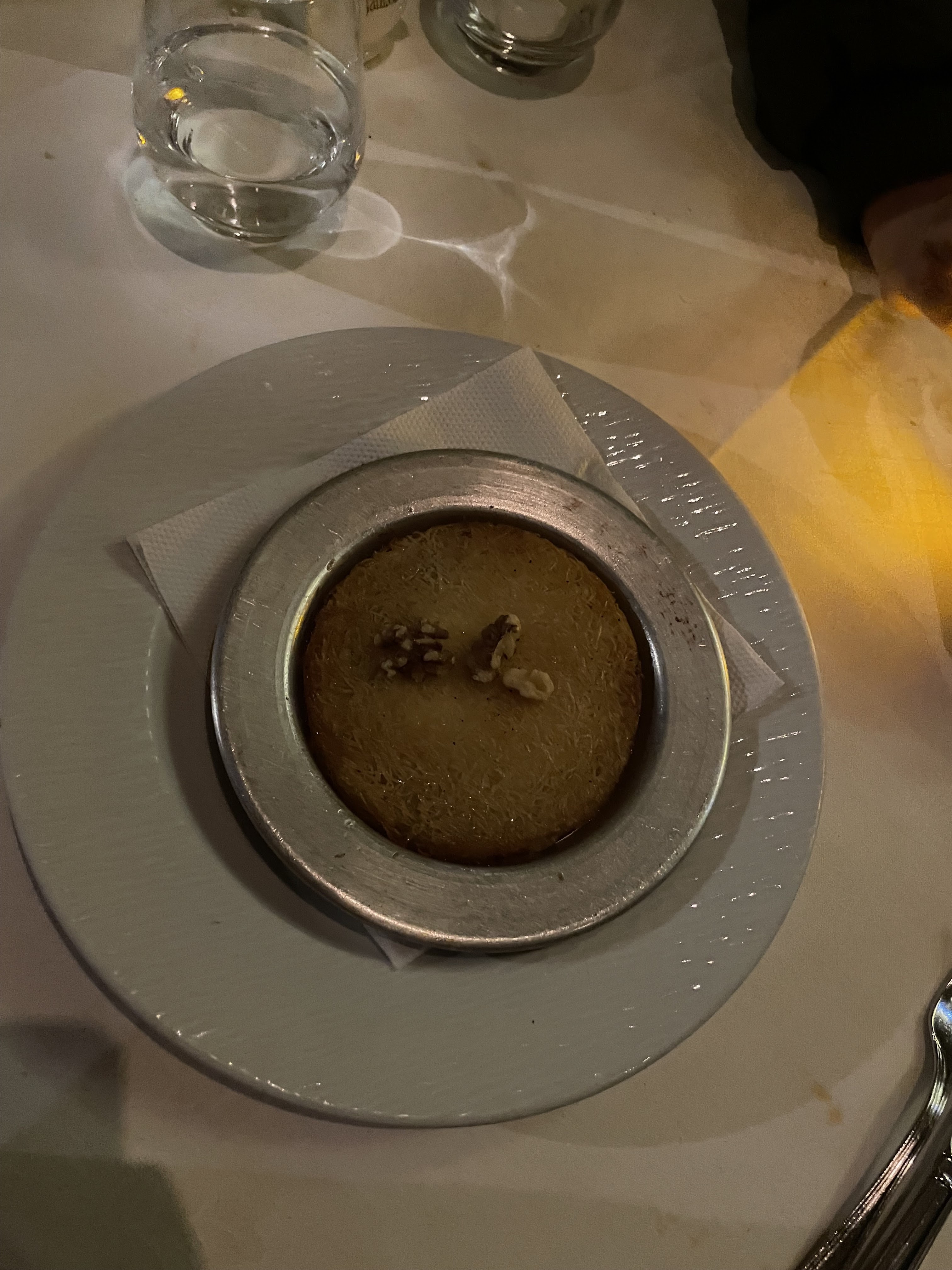 Bon accueil, mezze en entrée : prendre 1 pour 2 personnes, sinon plus fin pour la suite, car pain/galette à volonté. En dessert, potiron confit à la cannelle, et kunefe excellent.