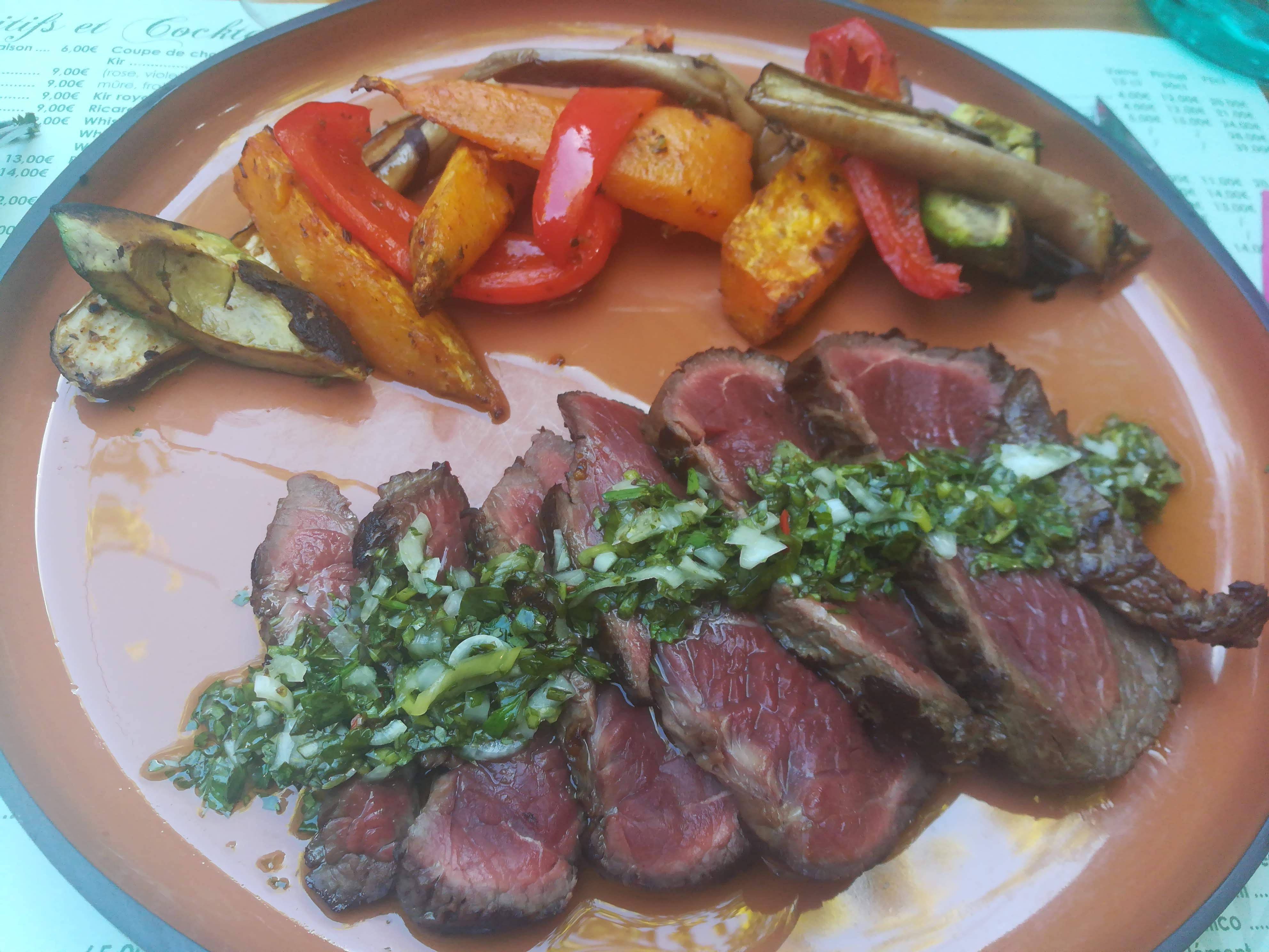 Dîner du 15 août : tataki de boeuf chimichuri à 25€ avec morceaux d'avocat grillés de poivrons et patates douces. C'était bon mais la viande n'était pas super tendre dont un morceau que je n'ai pu manger, dommage pour un tataki et pour le prix du plat. En dessert un flan coco maison à 8€ qui n'était pas un flan mais un gâteau au yaourt avec une base crème coco assez bourratif. Pas terrible. L'espace jardin est toujours sympa mais les nombreux fumeurs et la proximité des tables gâchent un peu.