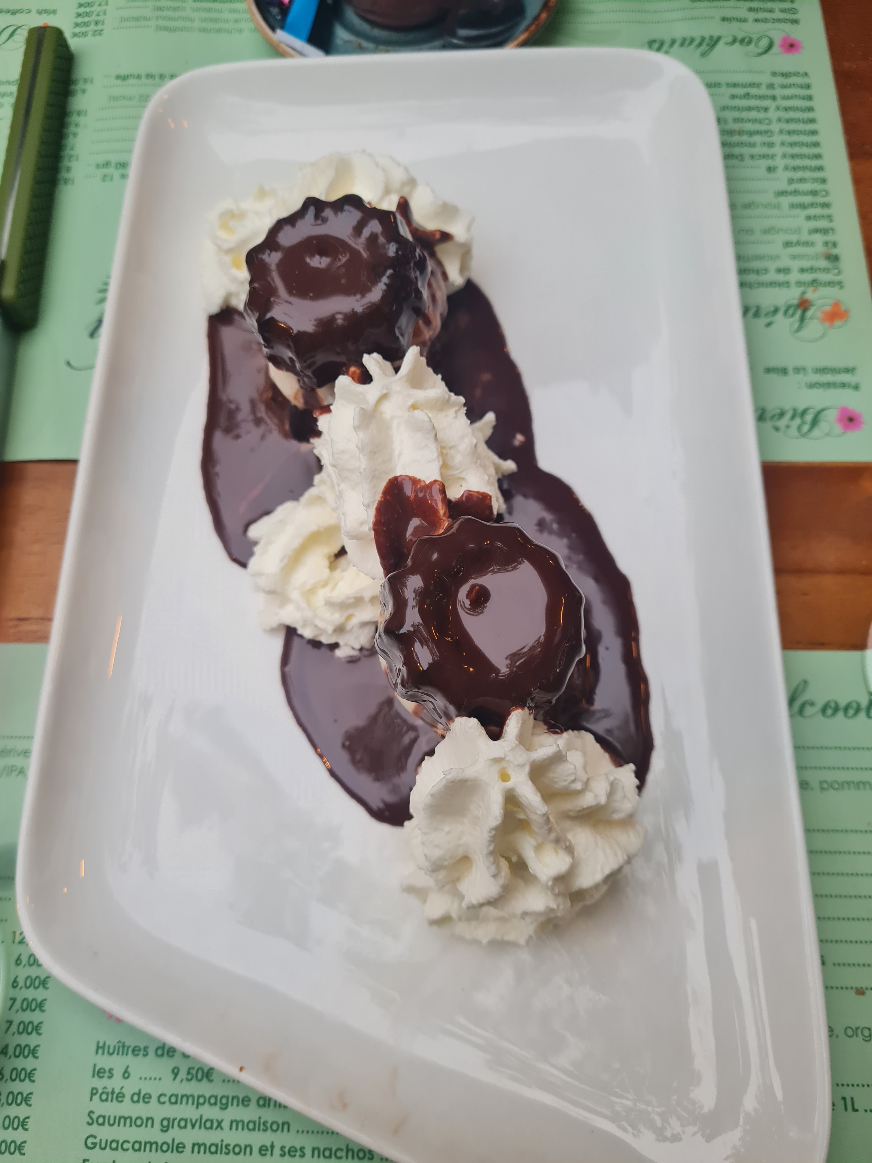 Produit frais Mais cher voir très cher pour la quantité.... Nous payons beaucoup le cadre... Mais tres mal installé... Nous étions assis sur un coffre en bois avec semblant de coussin ! Et en guise de dossier une étagère qui me sisailler la nuque ! Avec le prix de mon dessert ils auraient acheté des coussins pour la table entière !!!