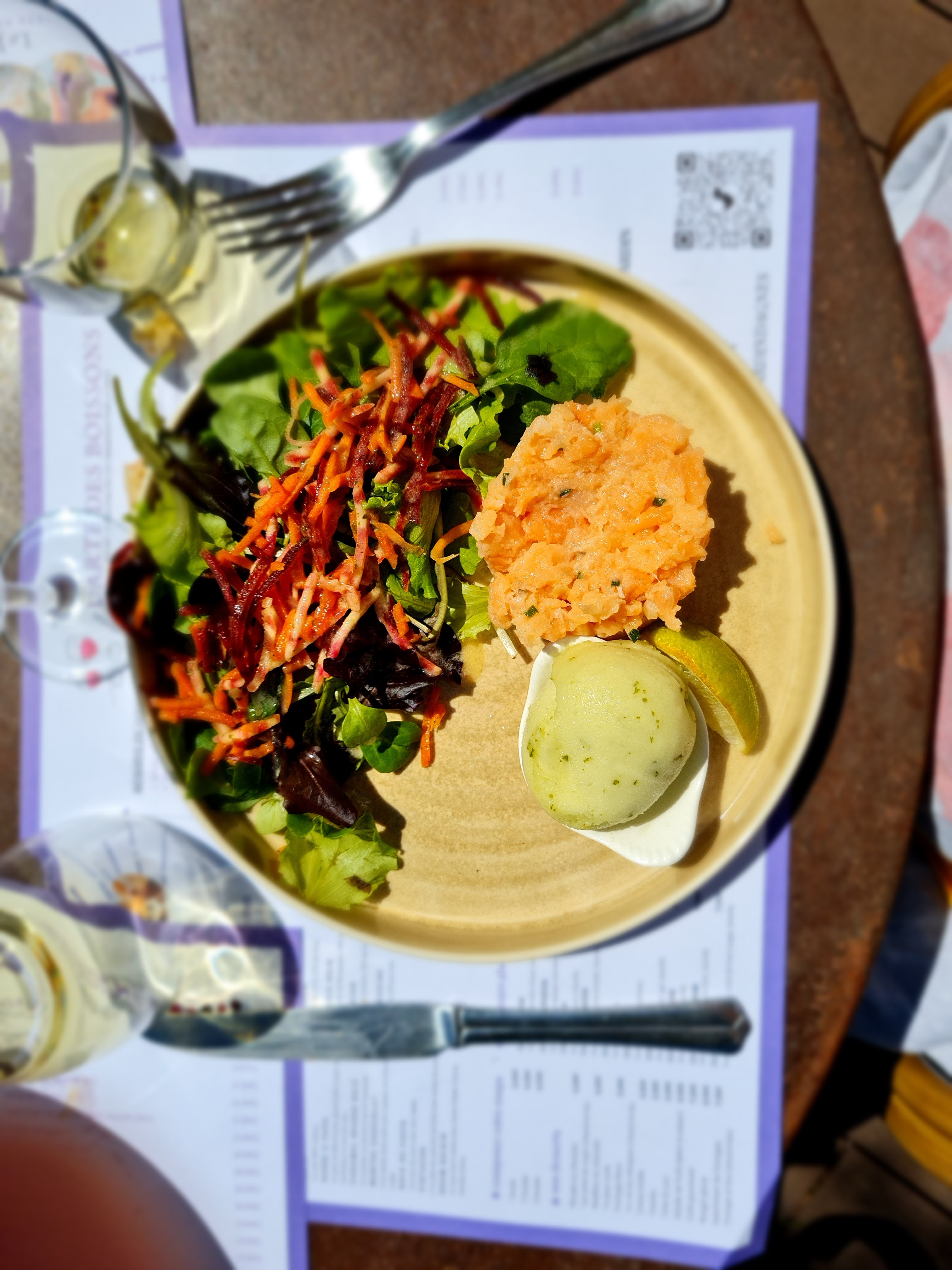 On nous avait conseillé ce restaurant. Grosse déception : on ne nous a proposé que le menu du jour, cuisine sans saveur, une salade trop vite préparée, de petites quantités. Le rosé était plus que tiède et la glace demandée a mis beaucoup trop de temps pour arriver sur la table, comme la bouteille d'eau d'ailleurs. Le personnel est sympa mais l'addition était trop élevée pour ce que nous avons eu, le tout expédié en une quarantaine de minutes. D'autres restaurants aux alentours. offrent meilleur pour moins cher. Peut être sommes-nous tombés sur un mauvais jour,...ce qui peut aussi arriver.