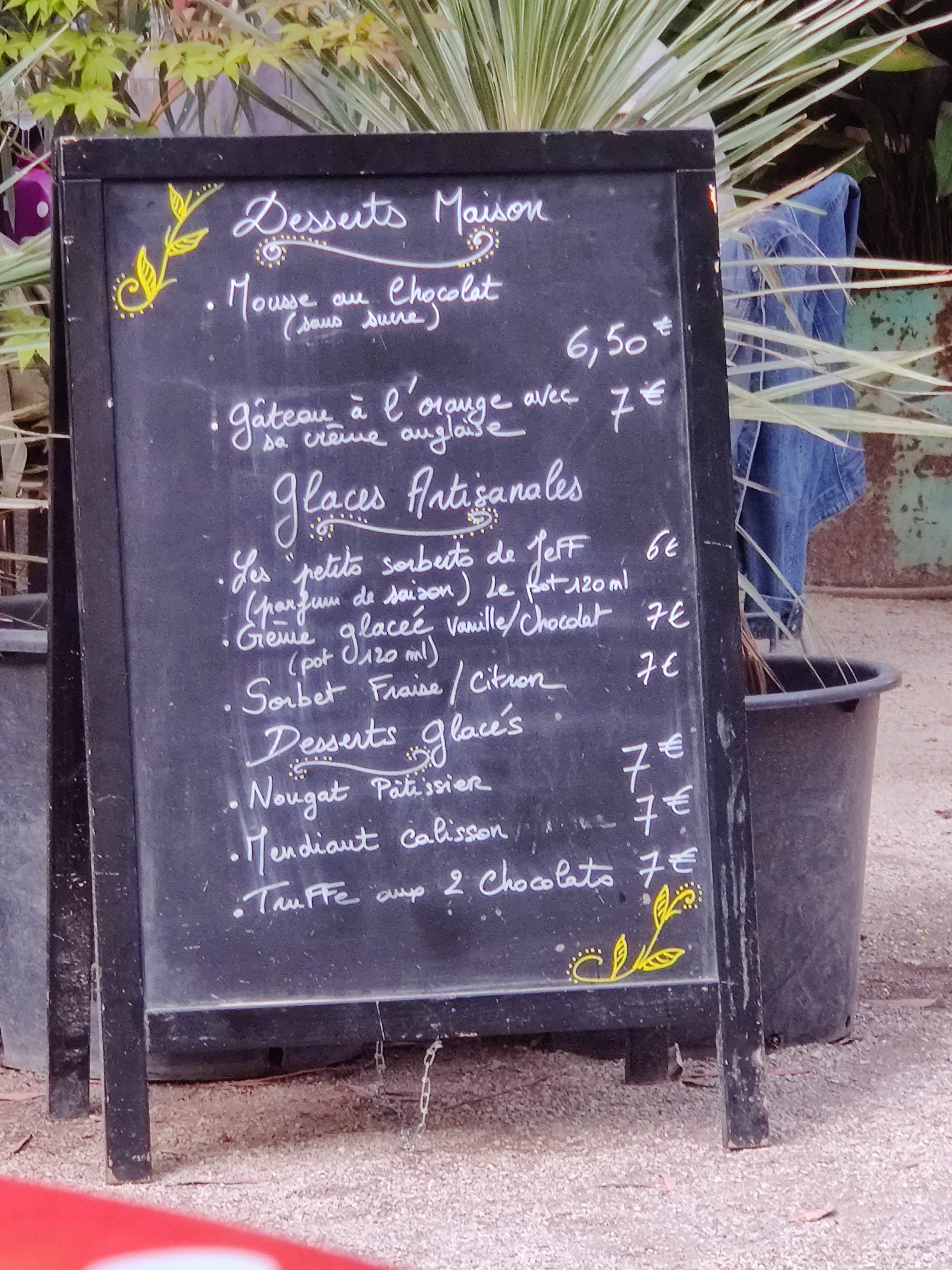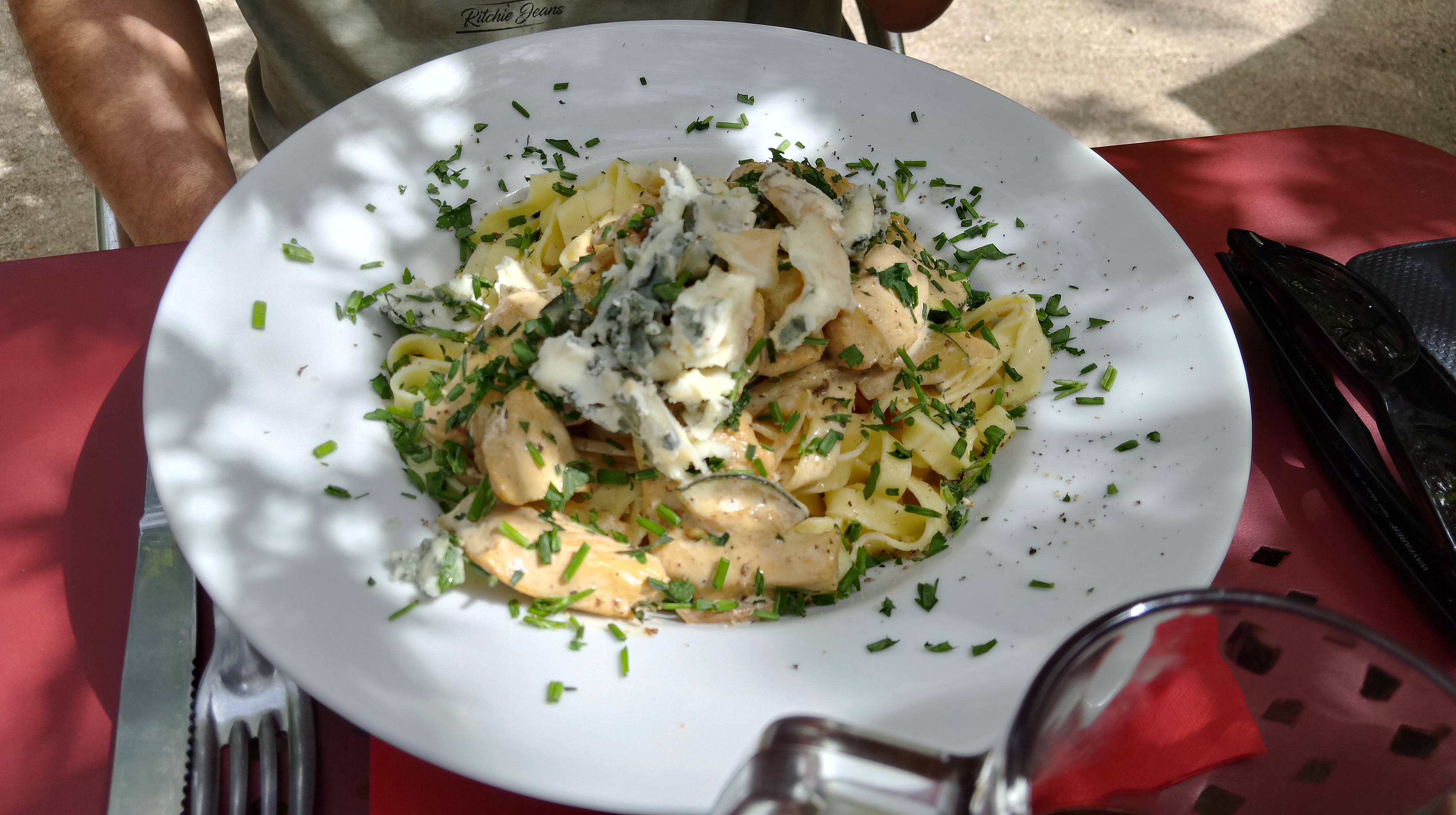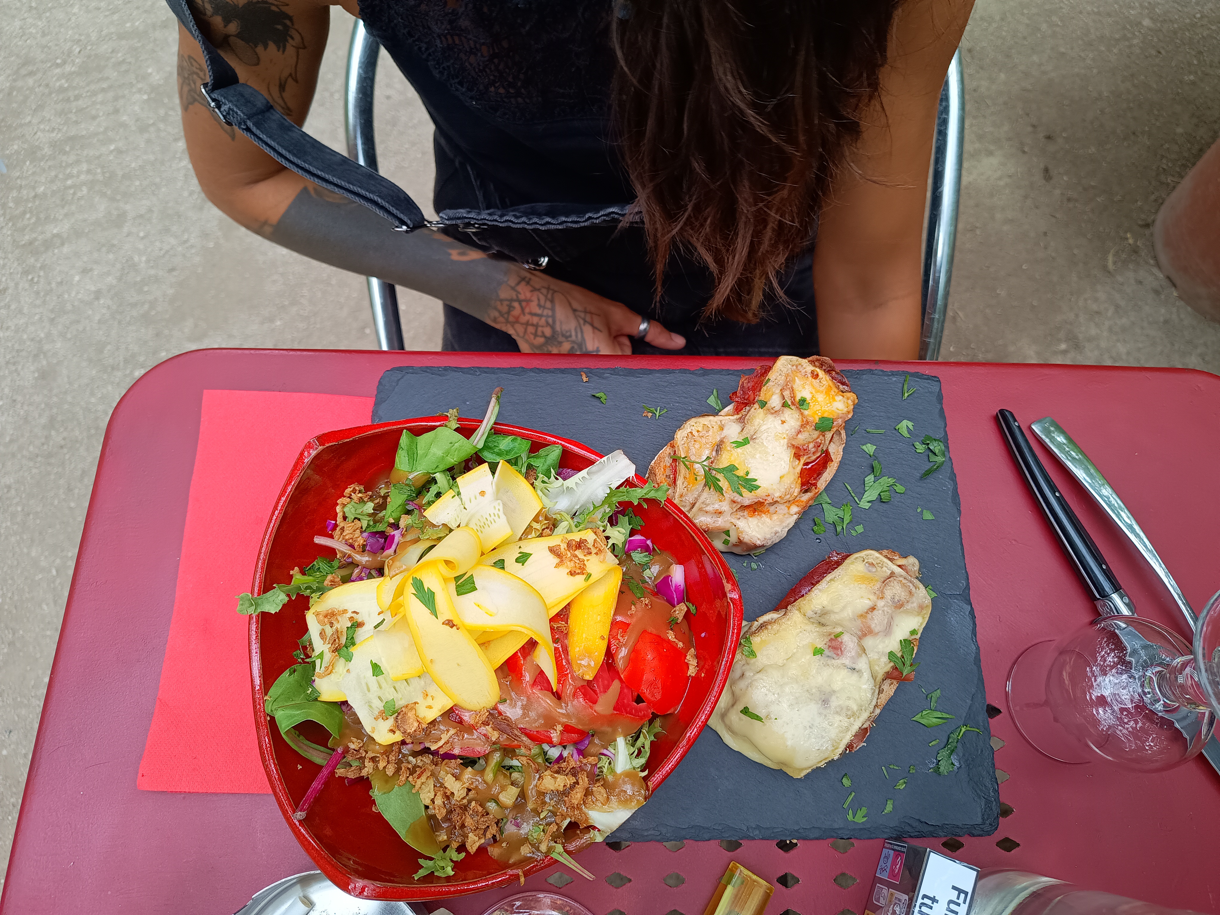 Un petit coin de paix et de verdure. Personnel souriant mais peu nombreux. Donc attente. L’attente n’est pas un souci car le cadre appelle à la contemplation. Assiette simple, de produits frais et du « fait maison »