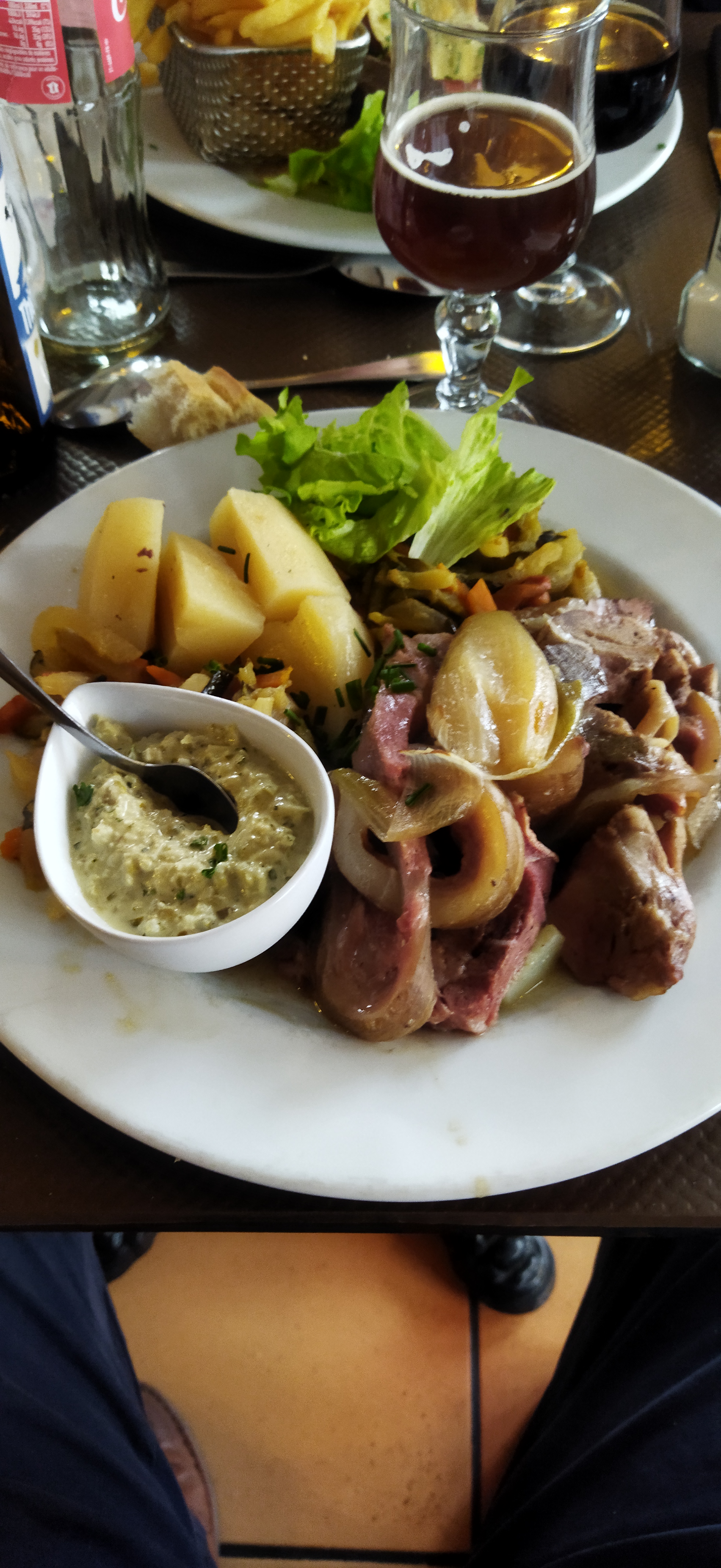 C'était excellent le tarif est pas très élevé j'en ai eu pour 9 € le plat plus la boisson genre 3 € peut-être complément pour la boisson un navarin de veau avec du riz c'était excellent une fondue de poireaux je me suis régalé Pour la petite anecdote j'ai l'estomac très sensible et là j'ai super bien digérer C'est vraiment génial les prix sont abordables foncé