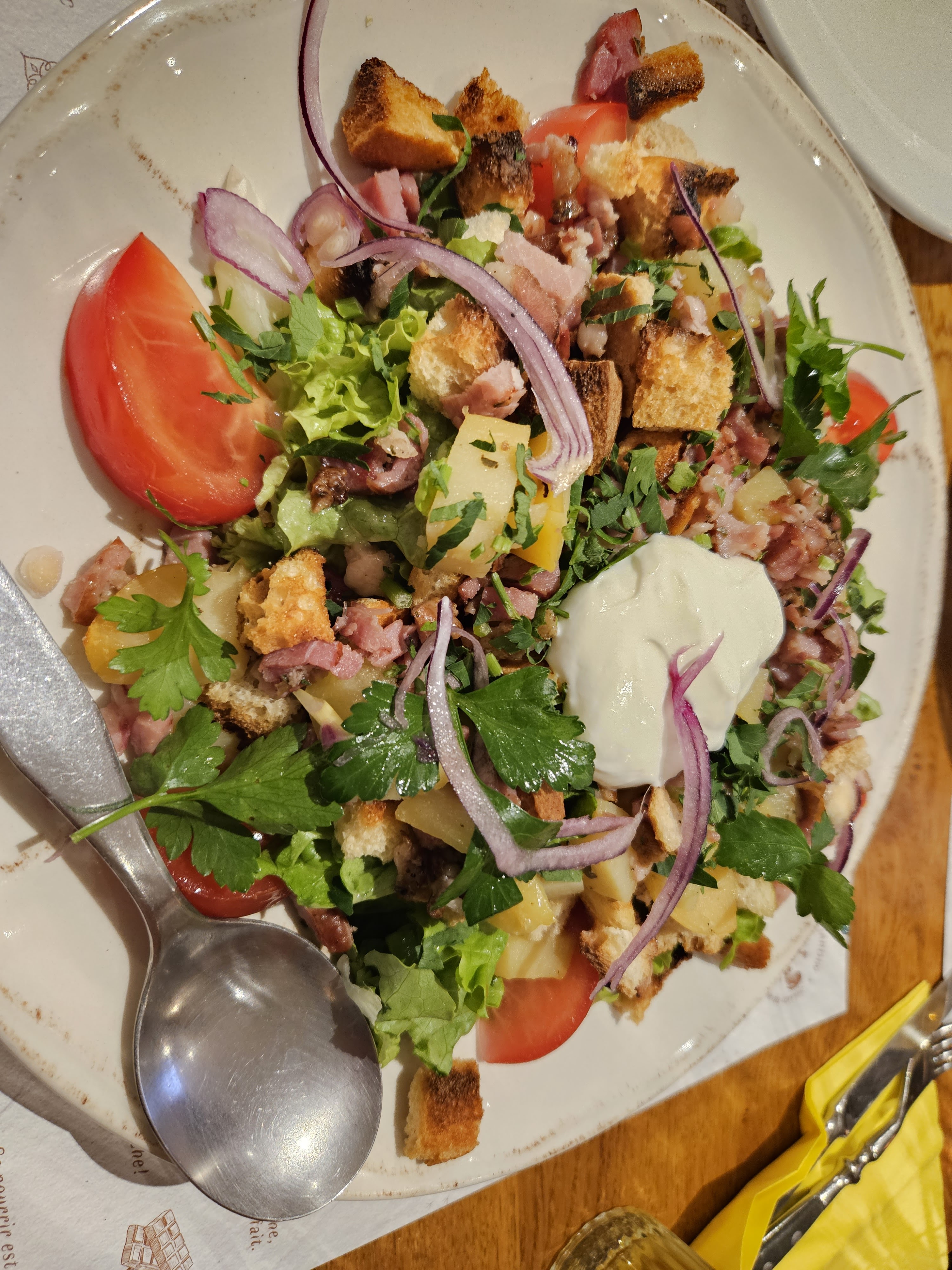 Restaurant familial avec des produits de qualité. Salade avec un assaisonnement équilibré et des produits frais et un gratin de pomme de terre délicieux.