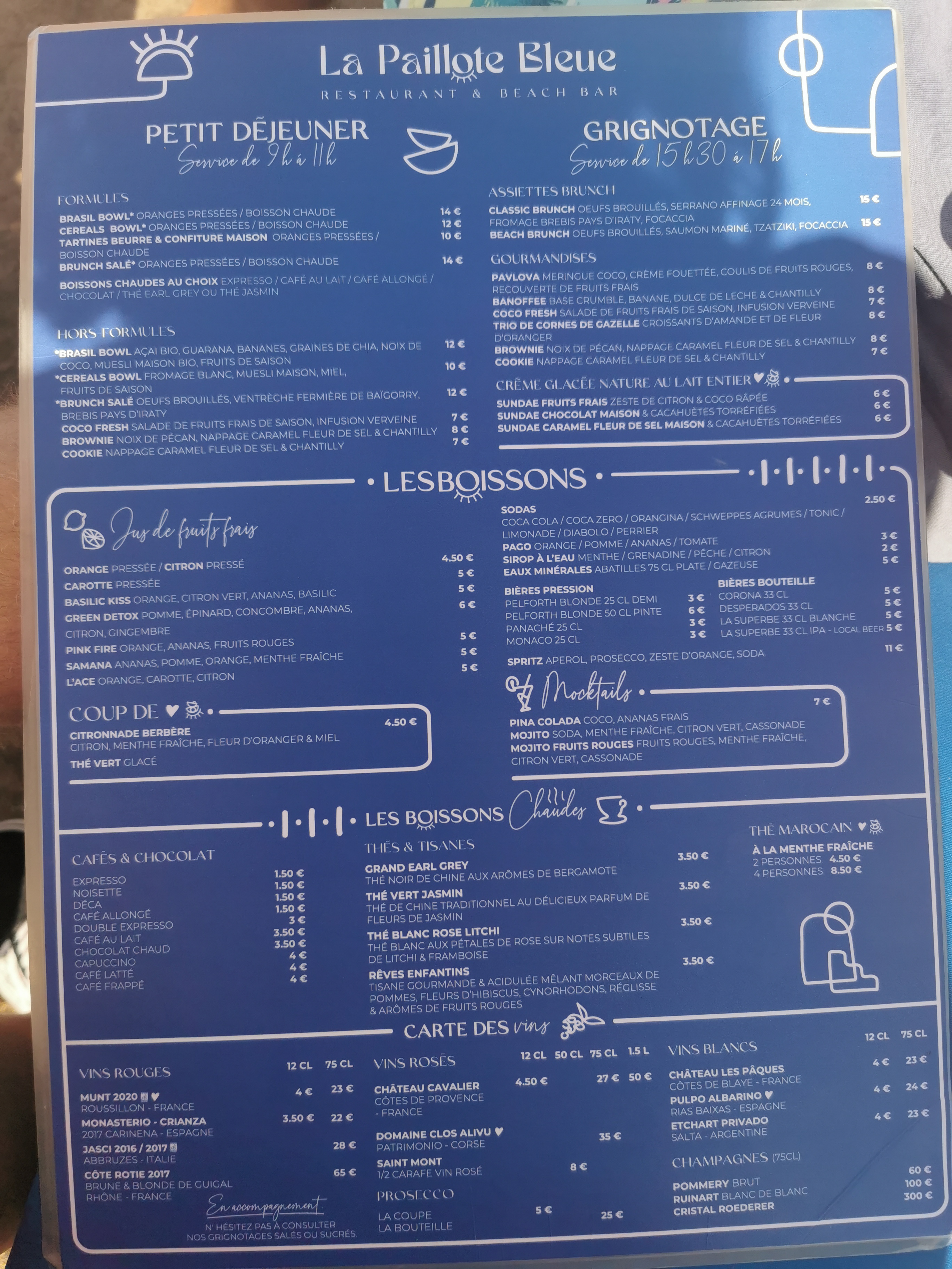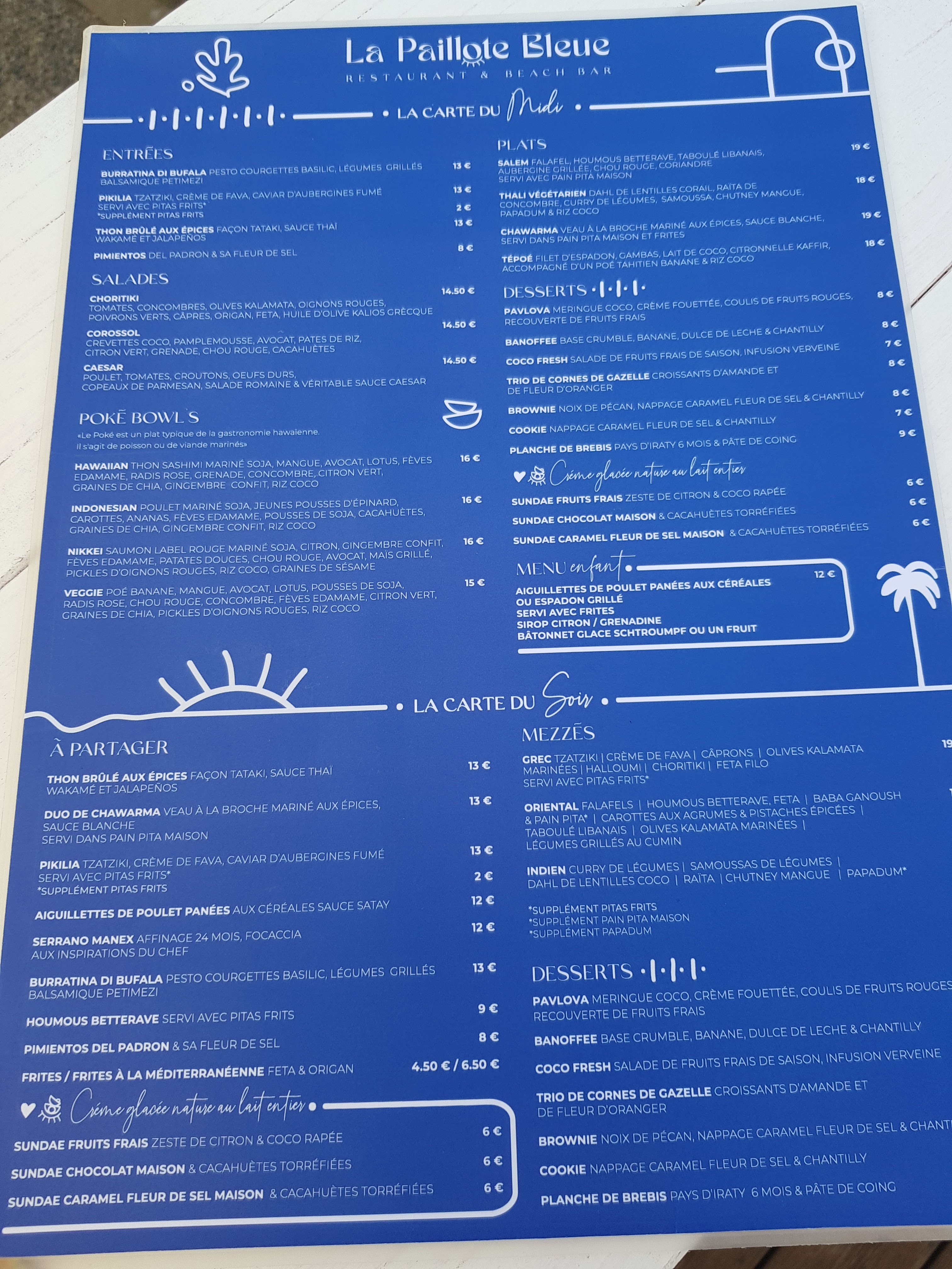 C'était parfait ! Les salades sont excellentes, très fraîches . Les desserts généreux Le personnel adorable le service rapide Je vous recommande la paillote bleue avec plaisir pensez juste à réserver ou ne pas arriver trop tard 😜