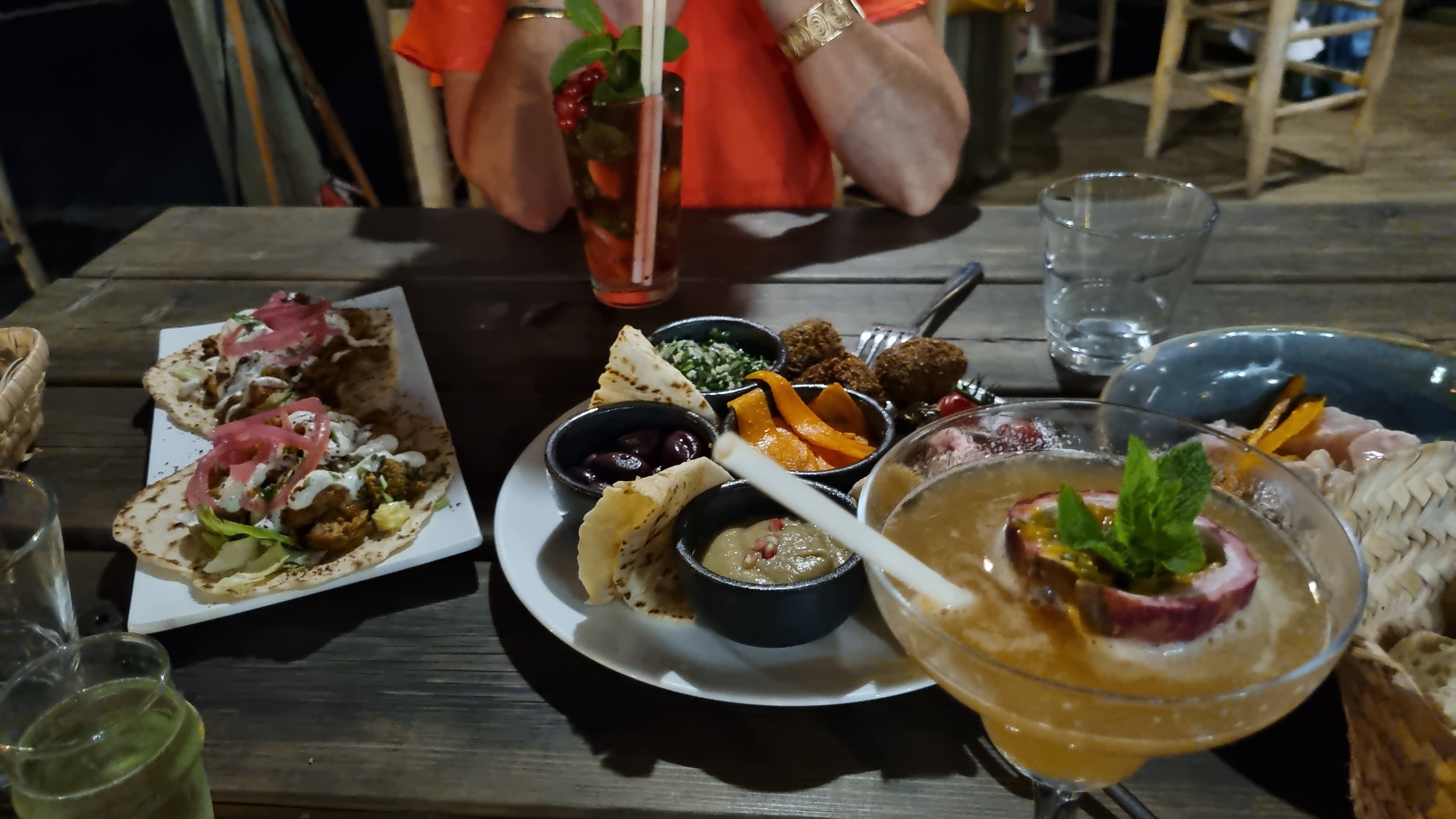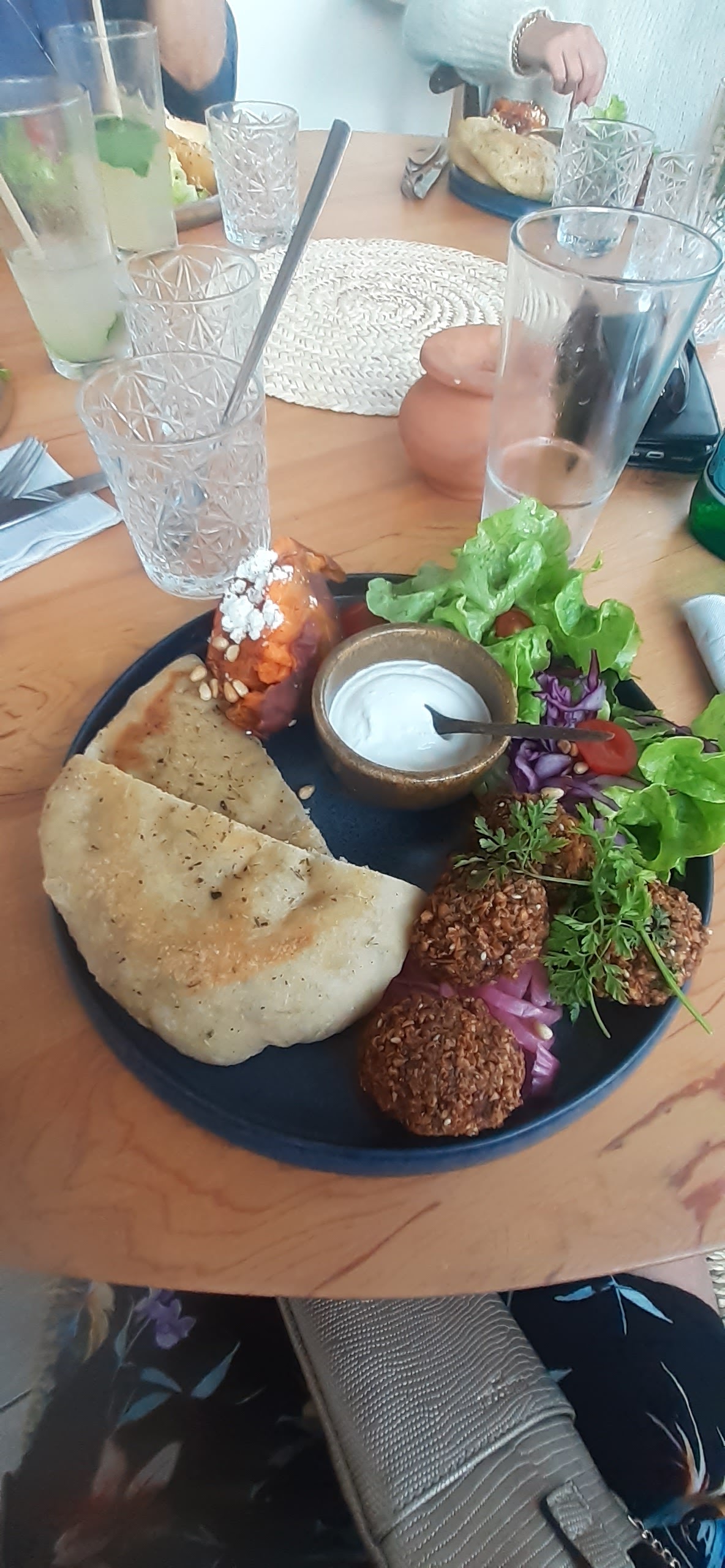 Arrivés à 13 heures, sans réservation, avec grand beau temps et terrasse complète ; la responsable nous a trouvé une table à l'intèrieur dans coin tranquille. Carte méditerranéenne. On a partagé à l'apéro du tarama puis un kalamaki agneau et un keftedes. Plats bien relevés, de bons arômes et du goût. En dessert on a partagé un chou craquelin... craquant ! Un verre de Pic St Loup et un italien, bien... Bref ; un bon repas, super déco, service top. On testera la terrasse avant la foule de la saison.