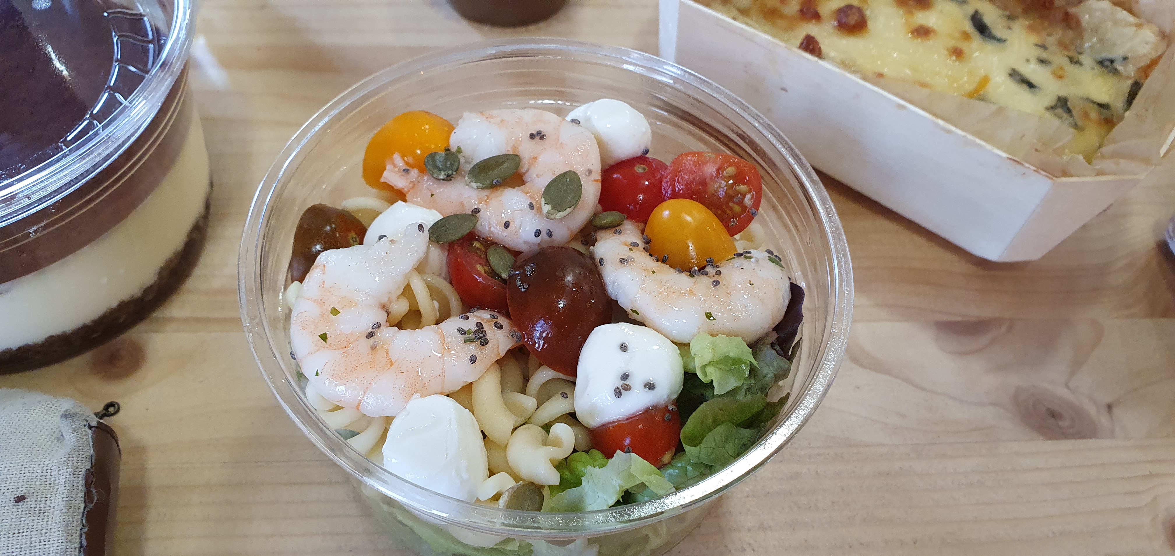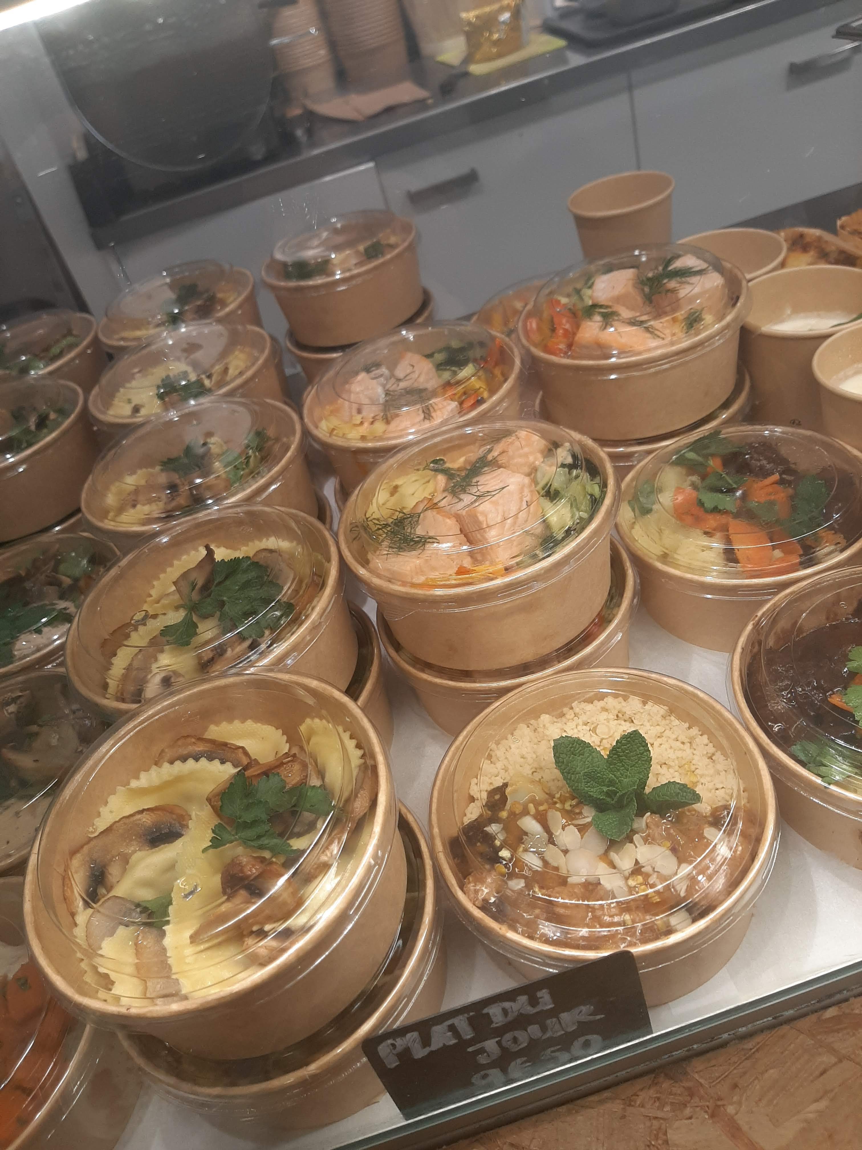 Bon petits plats à emporter ou choix de salades et sauces. Il y a foulé en heure de pointe.
