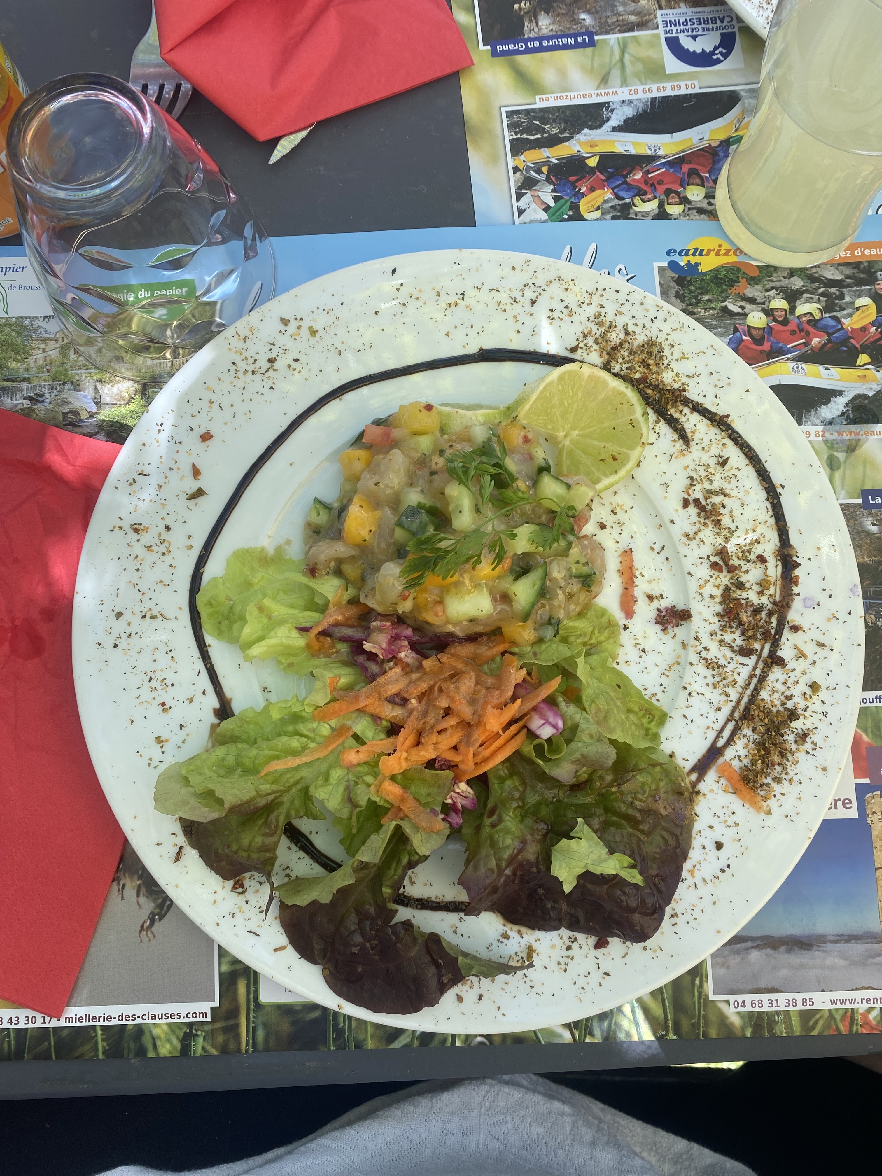 Très bien Menu a 25 € Vous pouvez faire un mix entre le menu traditionnel et le menu orientale Entrée orientale copieuse et très goutue Thon passé au grill au feu de bois , génial et copieux aussi Cadre très sympa a l'ombre d'un vieux marronnier et son petit bassin Serveur et son patron très sympa et dynamique A refaire Eric& Valérie (les motards rencontrés le matin a l'Intermarché d'Esperaza )