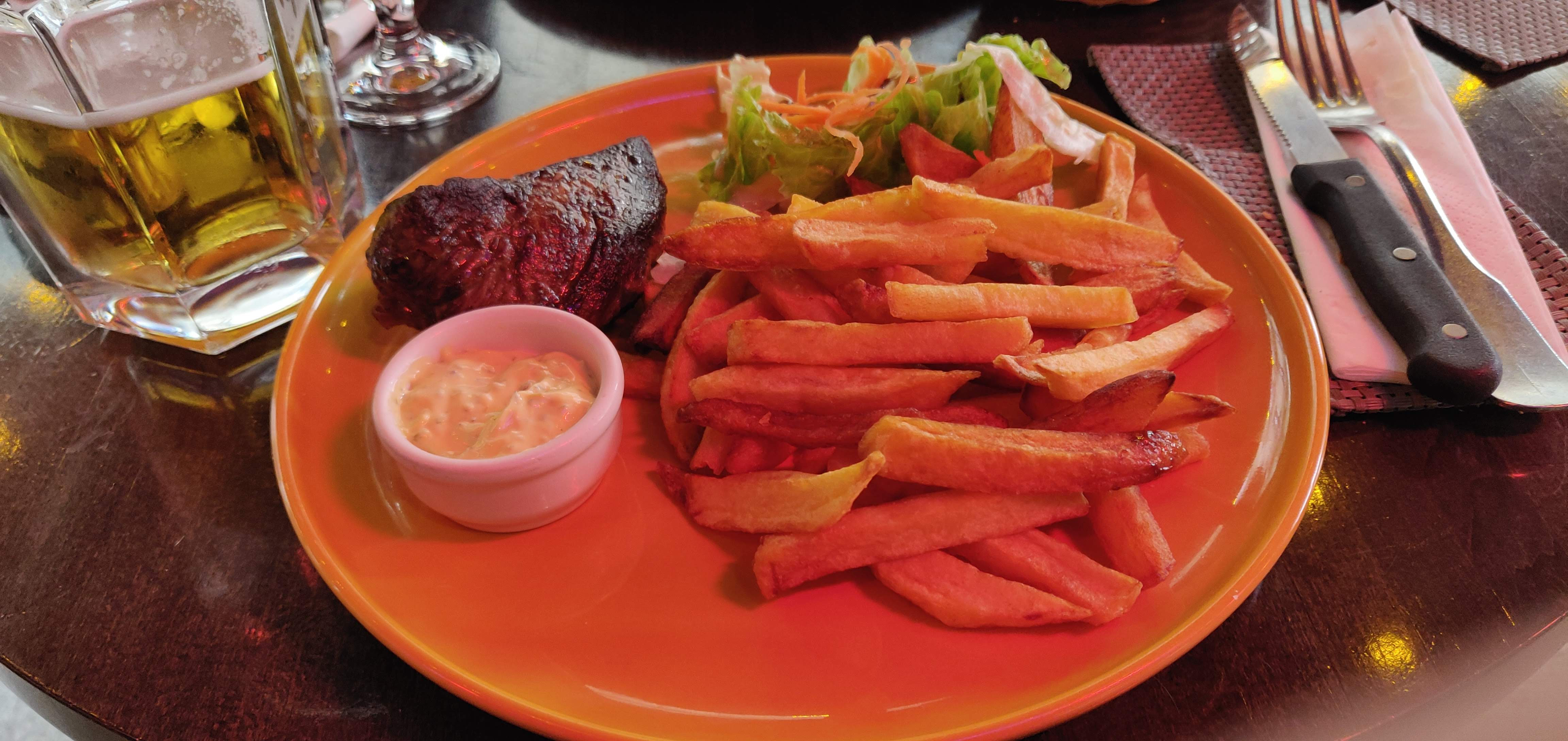 La nourriture n’est pas leur point fort. Le steak n'était pas tendre du tout. Ils ont des collations comme des croques. Cependant, c'était un endroit pratique car il y a une belle section extérieure qui est la seule possibilité de dîner au restaurant.