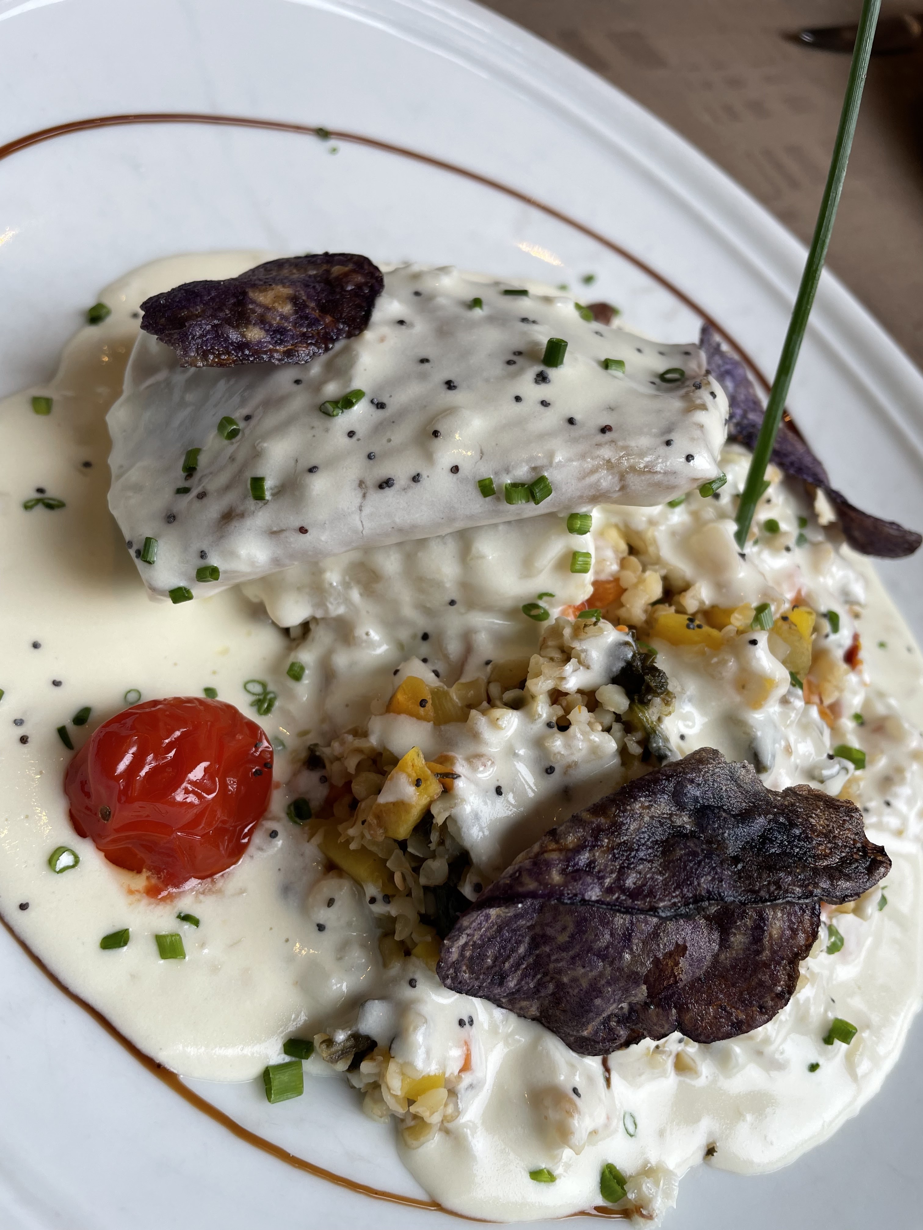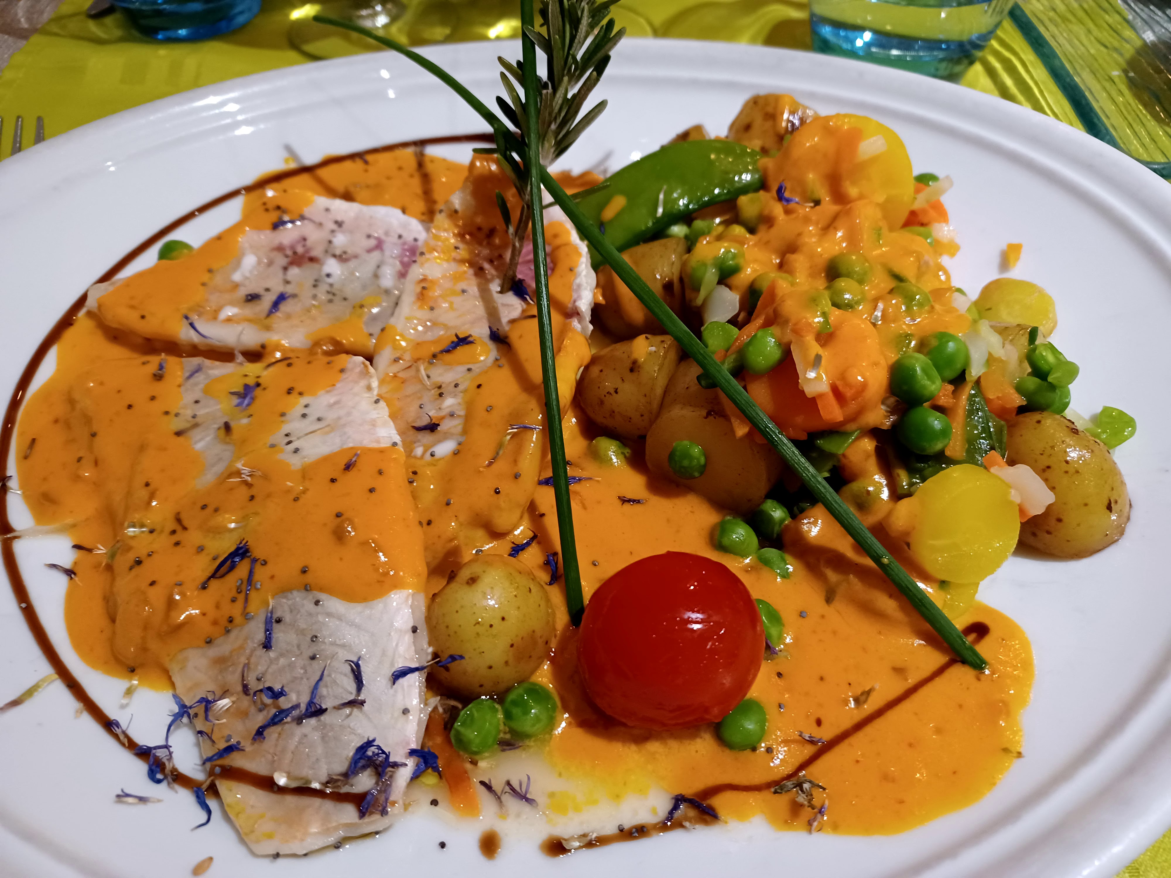 Très bonne cuisine.tres belle presentation d'assiette. Mélange de légumes surprenant Digne d'un grand chef seul bémol je suis tombé sur une fourchette style cantine dommage sinon 10/10