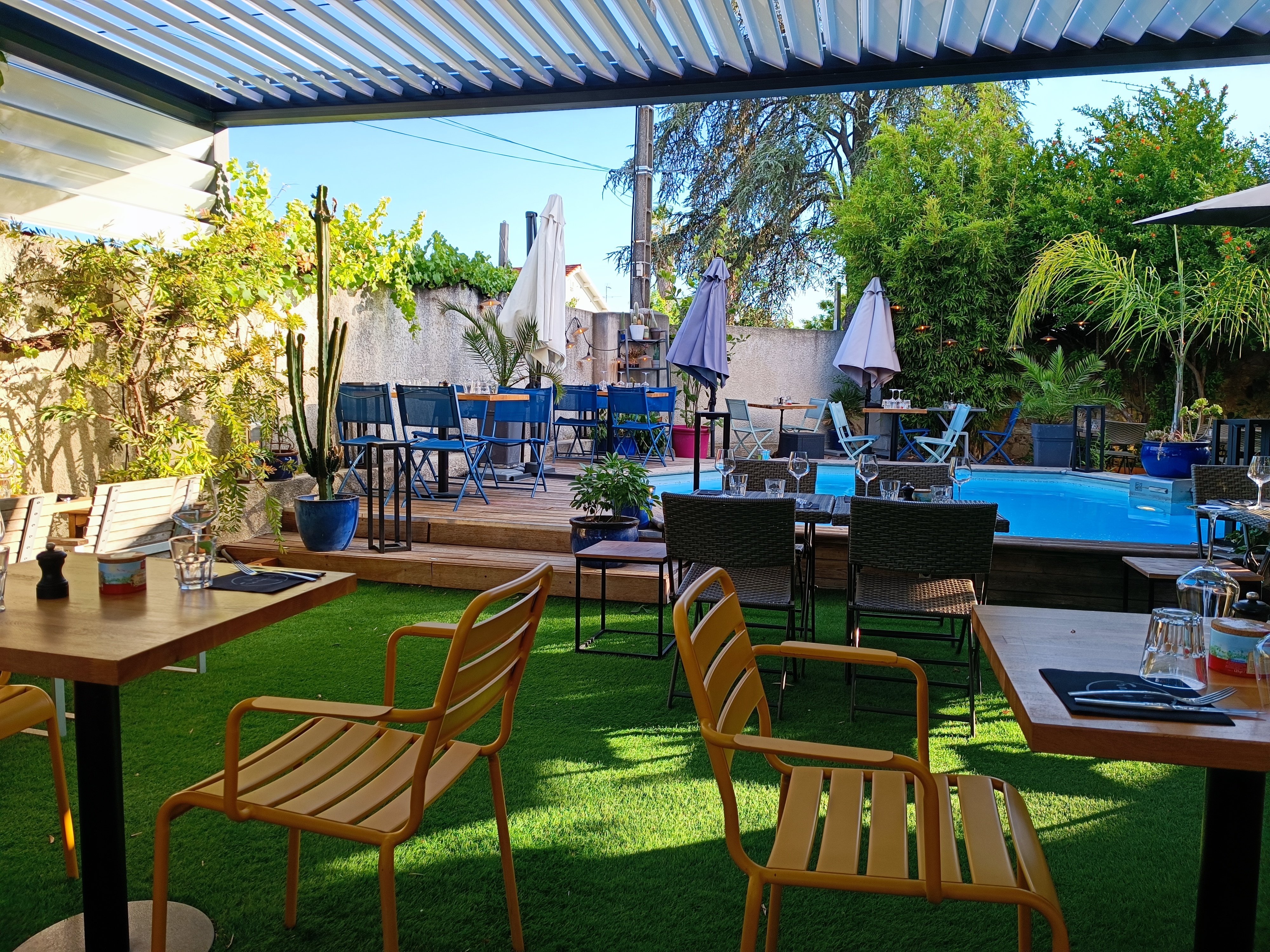 Très bonne expérience. Restaurant d été dans jardin avec petite piscine. Les plats sont délicieux et le personnel très agréable. Léger bémol sur l'attente et le prix mais sinon cela était très bien.