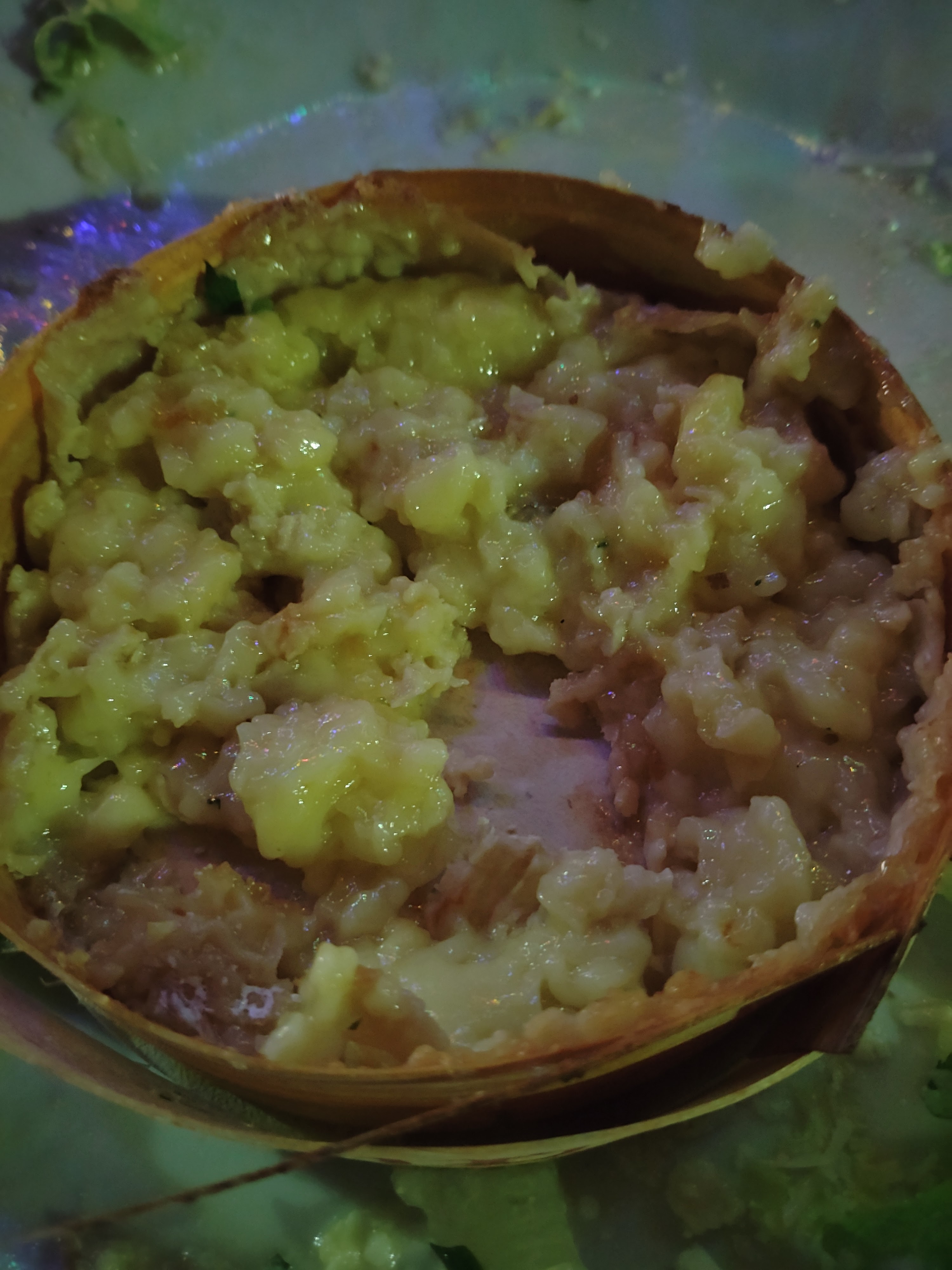 La nourriture est bonne et peut être mangée sur la petite place sous les arbres avec des lampes colorées aux tables