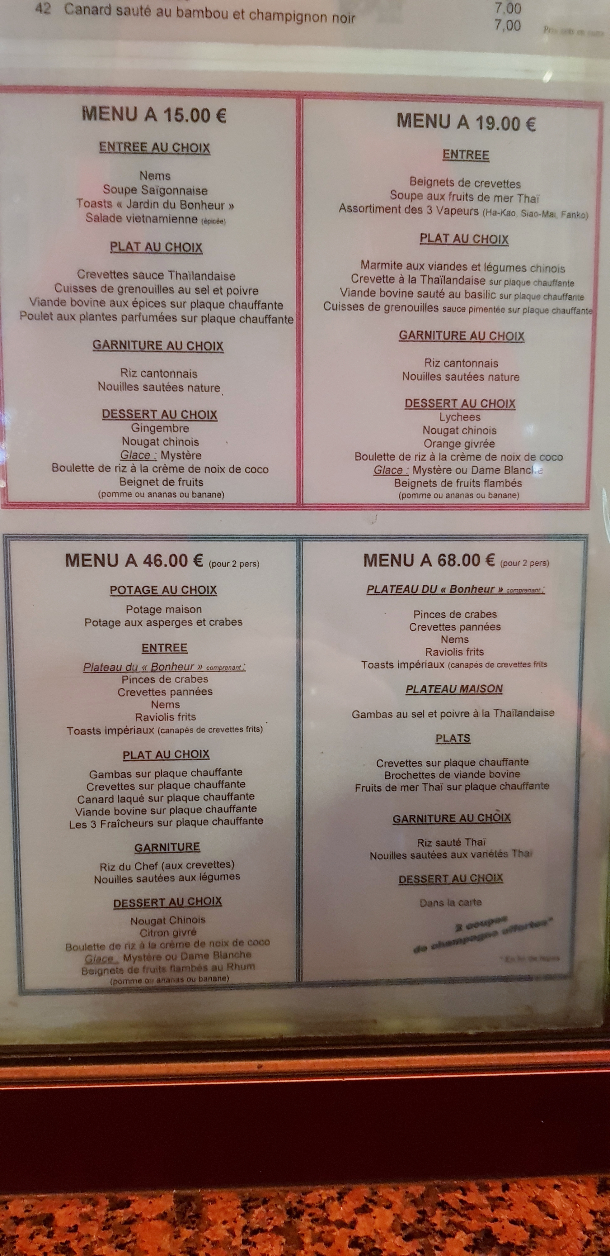 Nous n'avons pas bien mangé : notamment des beignets de crevettes pas assez cuits. Le canard laqué vraiment pas terrible. Le restaurant aurait besoin d'un bon rafraîchissement. Le service laisse également à désirer. Seul point positif : Les prix sont vraiment raisonnables.
