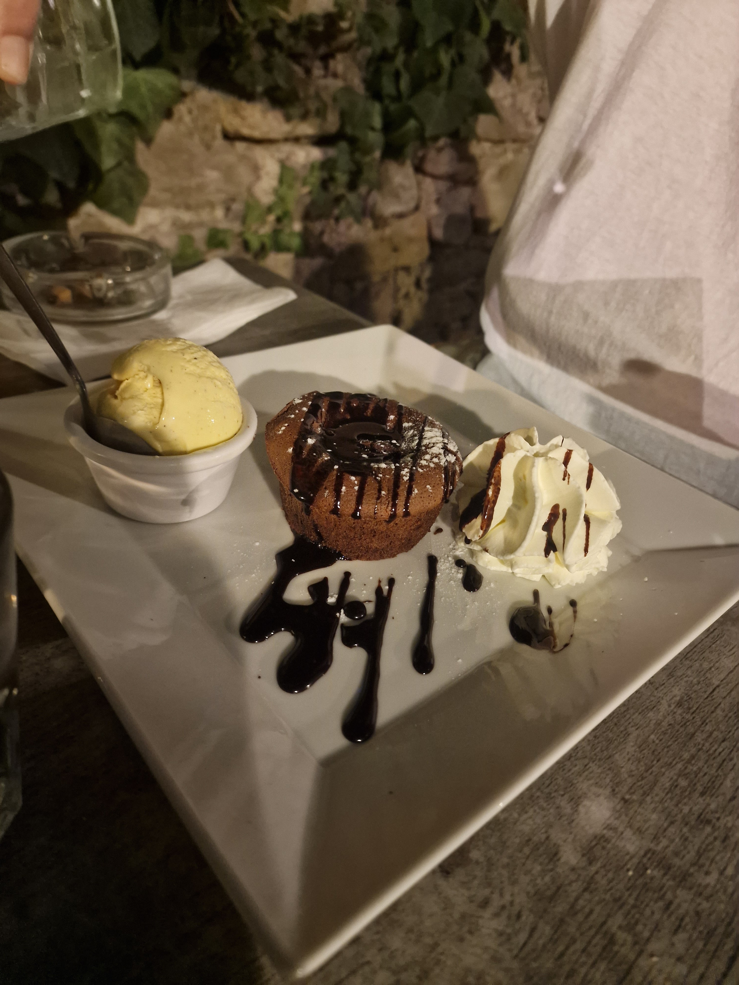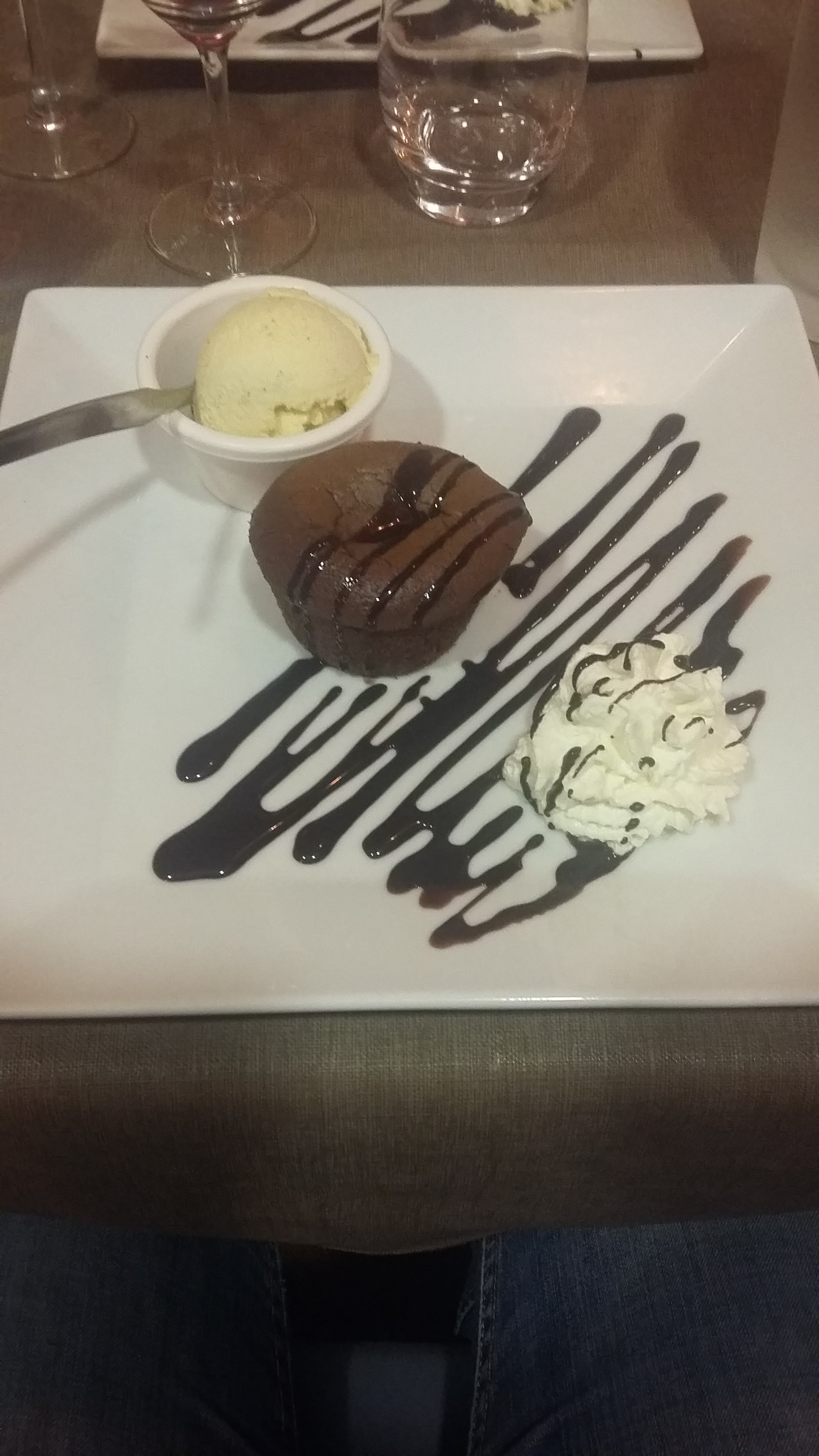 La nourriture elle-même et l'endroit étaient vraiment sympas. J'ai été déçu par la façon dont nous étions pressés. Mon assiette d'entrée a été retirée avant que j'aie fini ma bouchée et le dessert a été apporté presque immédiatement avant même que j'aie fini mon vin du plat principal très lourd, ce qui n'était pas idéal car le dessert ne pouvait pas être laissé au soleil et je était très complet, et le vin rouge et le chocolat ne font pas bon ménage. On nous a ensuite posé des questions sur le café et nous avons apporté l'addition avant même d'avoir traversé la moitié du désert et chaque fois qu'on nous parlait, c'était très rapide. Des gens et un endroit vraiment sympas, mais c'était le repas à trois plats le plus rapide que j'ai jamais mangé. J'aurais préféré aller quelque part où j'avais l'impression de pouvoir me détendre un peu.