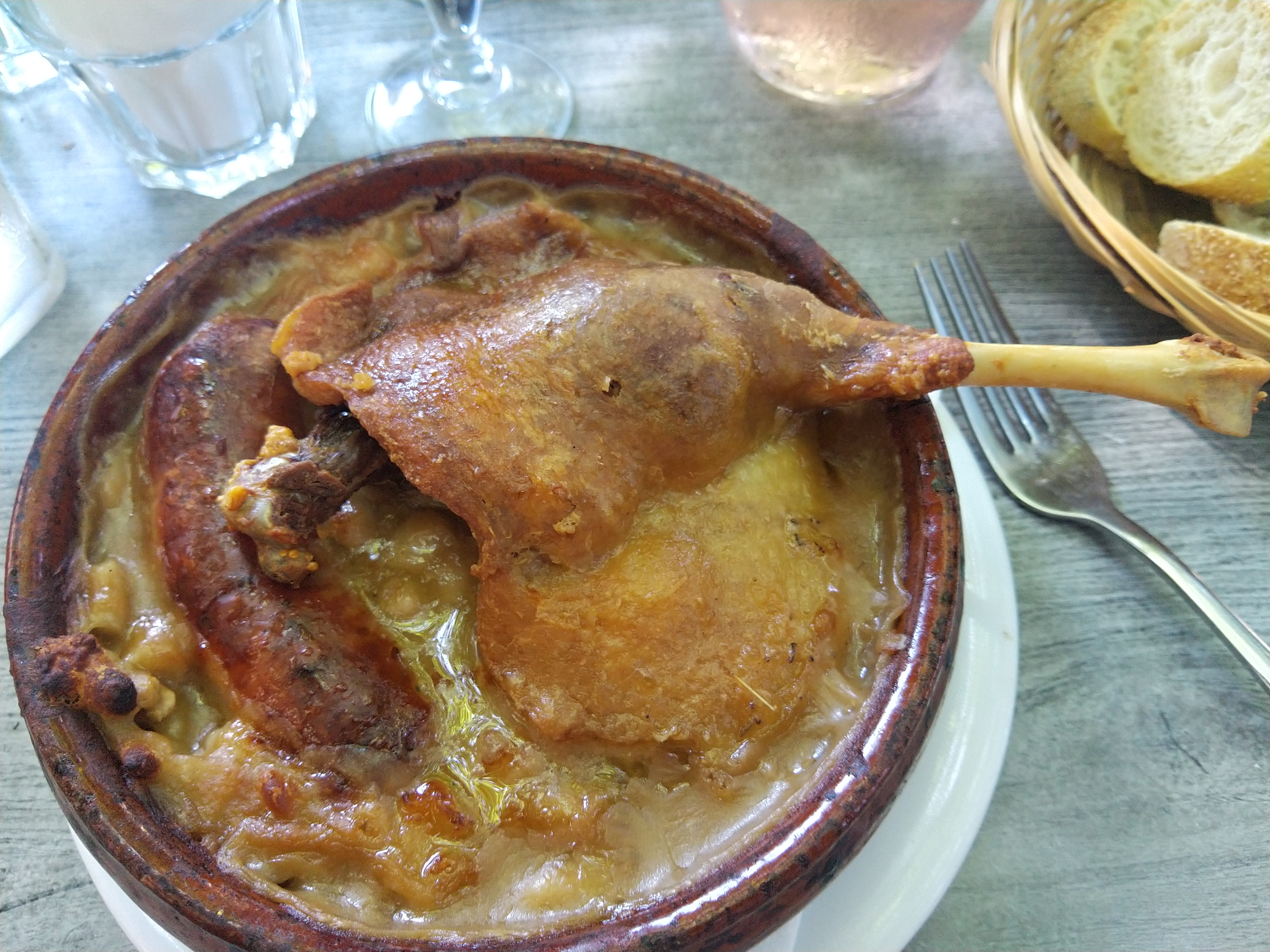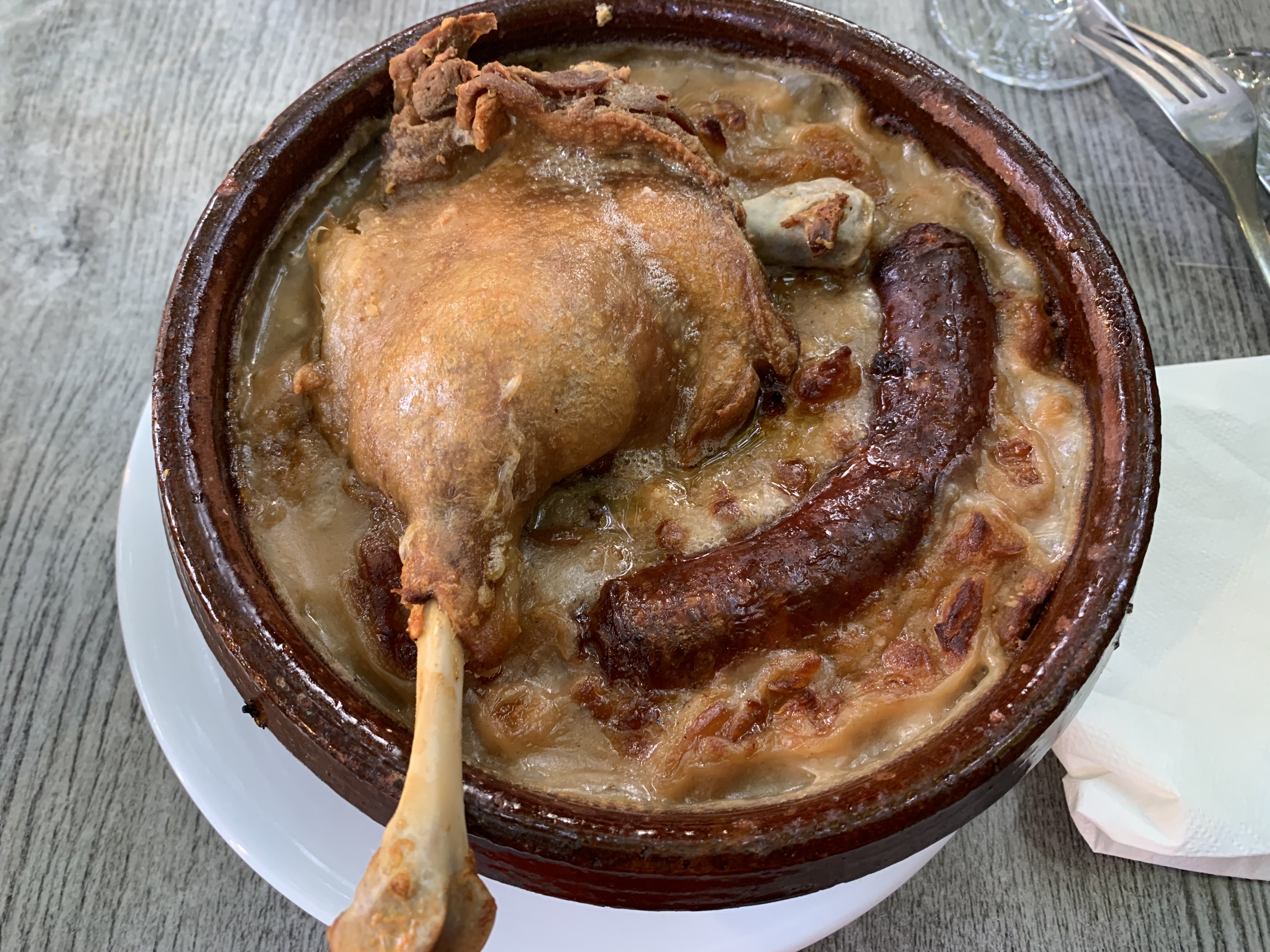 Environnement très agréable malgré la pluie. Rabattage et service très chaleureux et efficace notamment sur l'apport de pain et de carafe d'eau ! La salade de gésiers est correcte sans fioritures. Je ne recommande pas le vin merci qui présente un goût terreux assez prononcé. Le cassoulet est transcendant, un peu gras mais c'est ça qui est bon. Il faut éponger tout ça avec une bonne miche de pain. La quantité semble faible à l'arrivée du plat mais il n'en est rien, c'est tout à fait correct. Mes compère n'ont d'ailleurs pas fini leur assiette à mon grand bonheur. Enfin le dessert était en adéquation avec le reste du repas : irréprochable et fait maison.