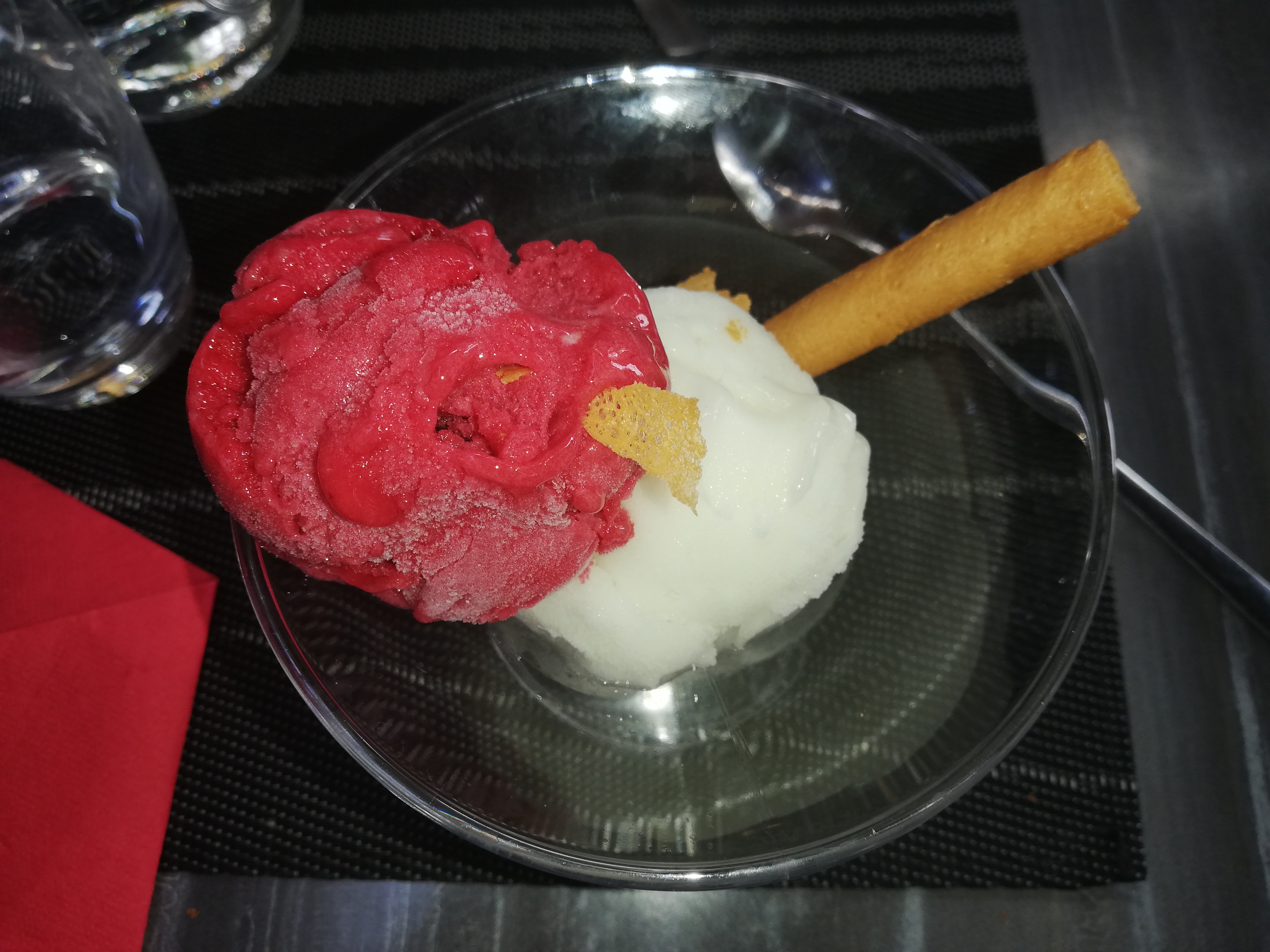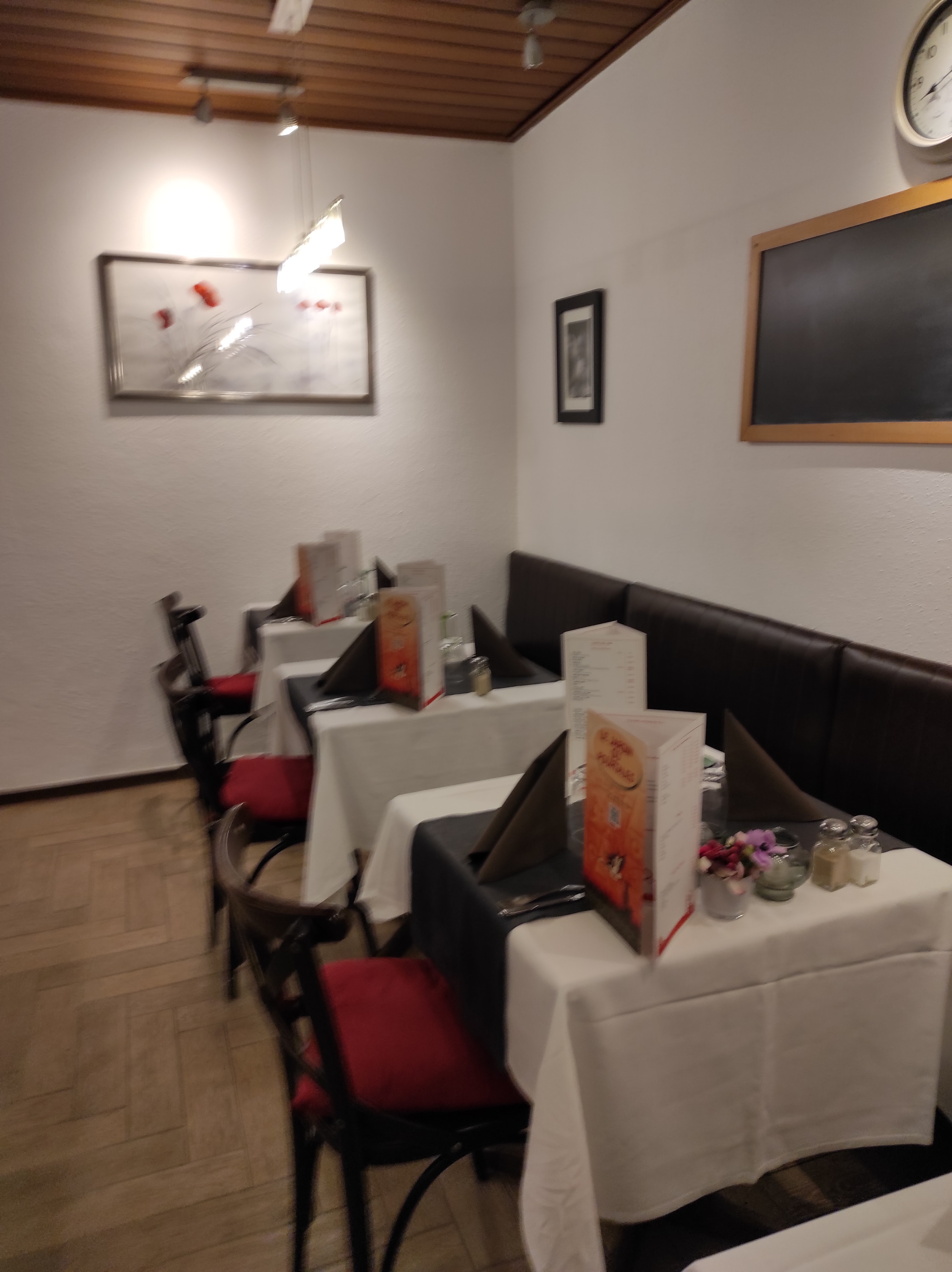 Heureusement que je sortais d’un rhume quand j’y suis allée sinon j’aurais attrapé froid, j’ai mangé avec ma veste et écharpe. Je crois qu’ils ont fermé la porte à ma demande. Les tartes flambées étaient correctes, sans plus, ce sont des fonds de tarte. Les kirs et Aperol bien. Des miettes sur la table dressée. Nous n’avons pas pris de dessert. Le serveur était plutôt sympathique. Ça a dépanné pour un premier mai ou rien n’était ouvert mais je n’y reviendrai pas forcément avec entrain.